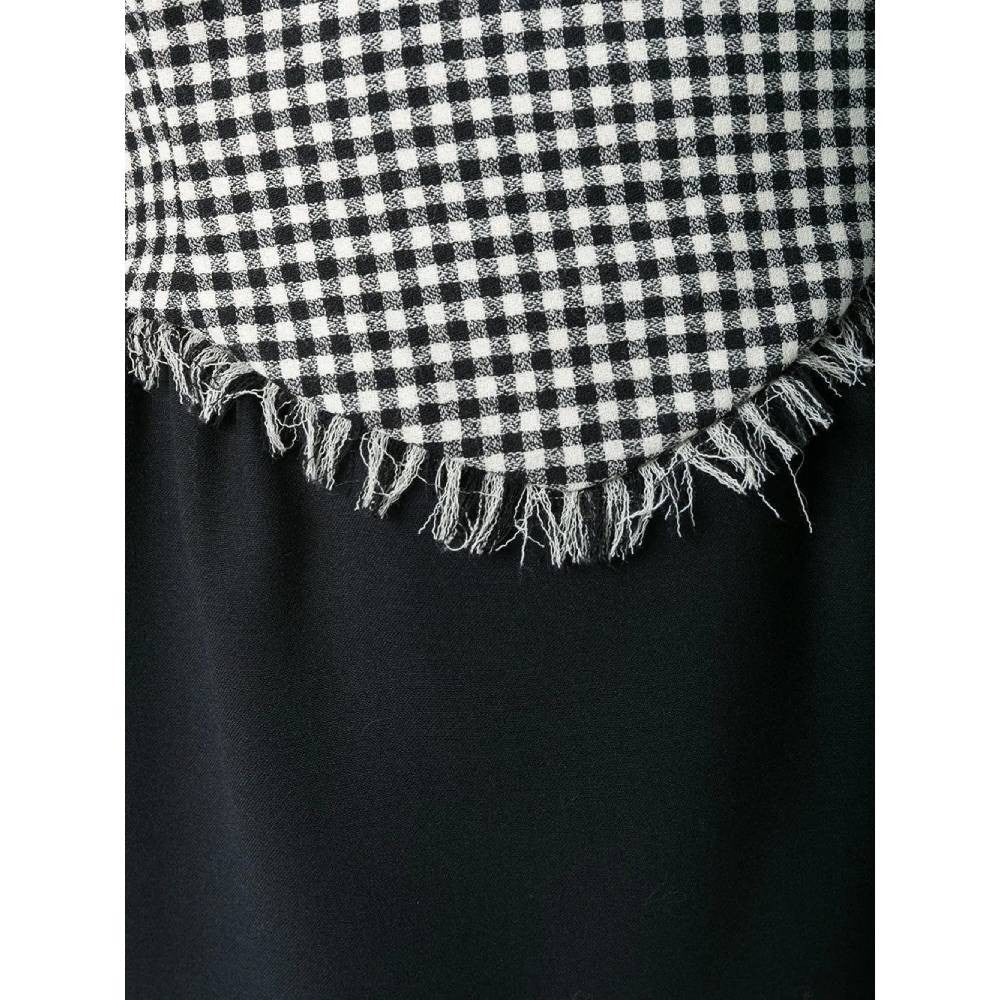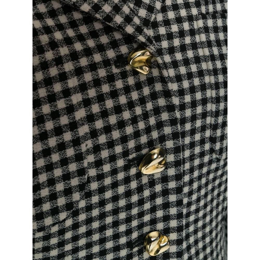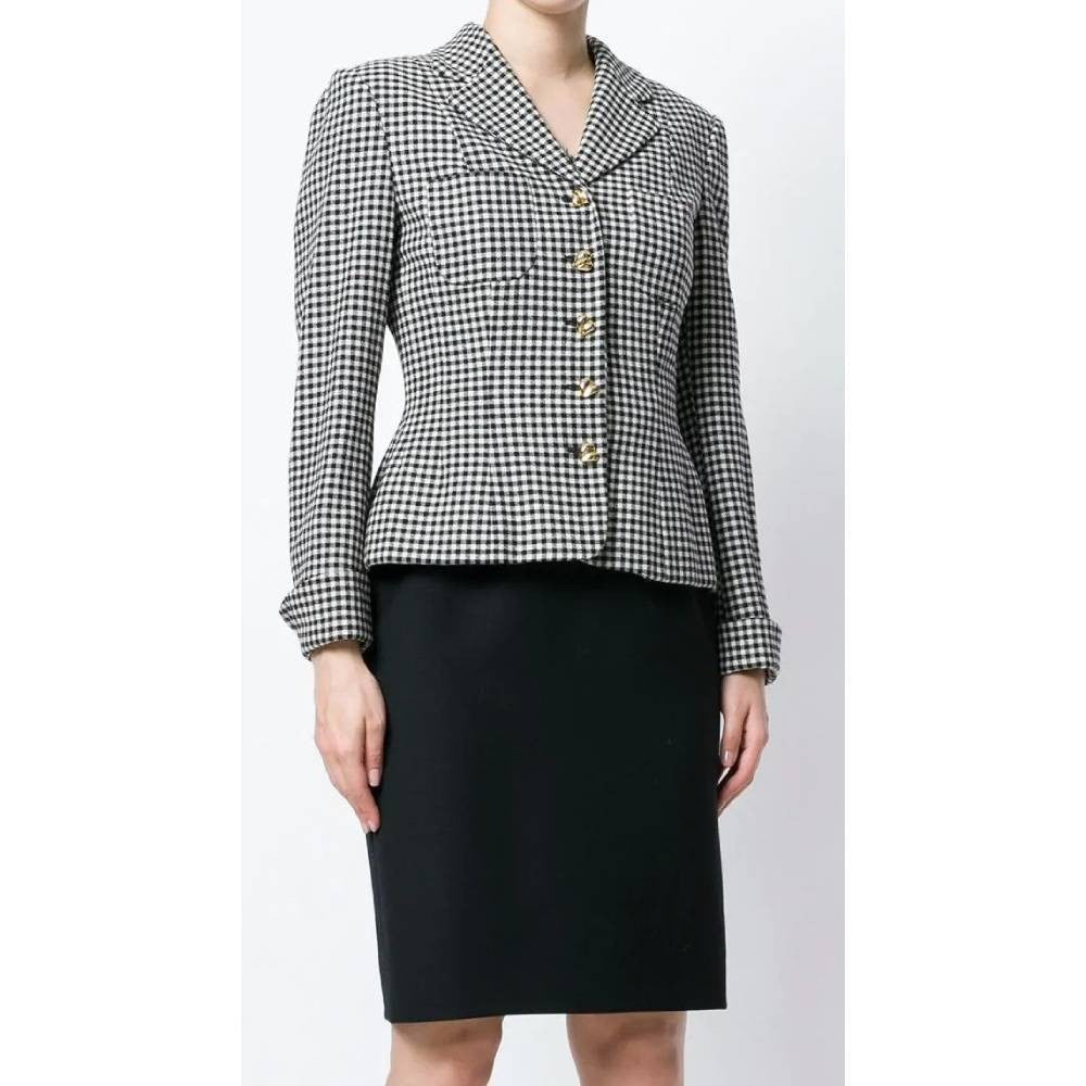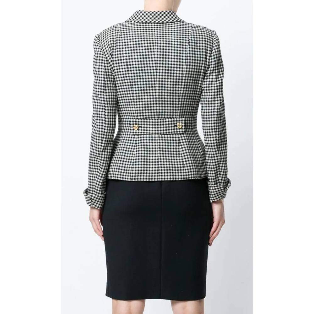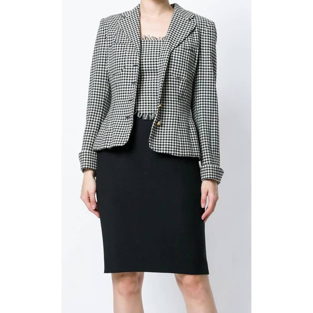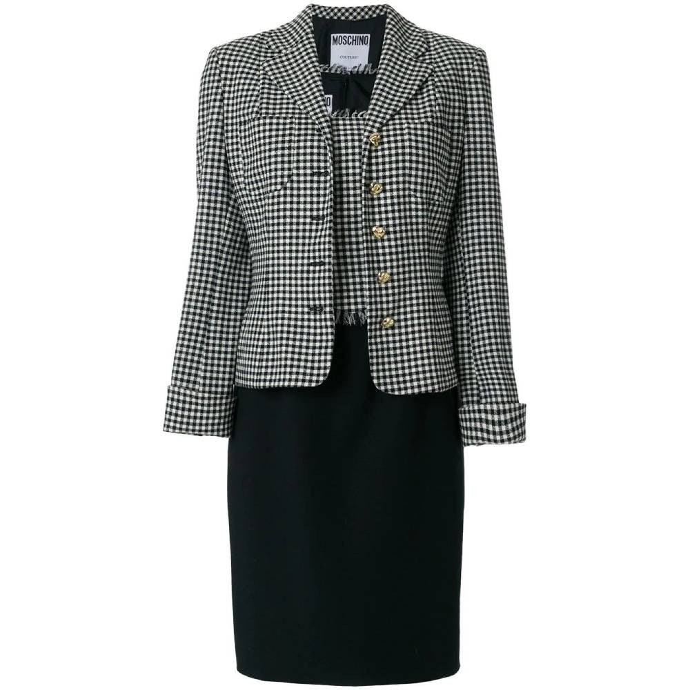 Moschino wool dress and jacket suit. Sleeveless dress featuring a black and white checked bodice, square neckline, fringed edges and black skirt. Checked pattern jacket, classic lapel collar, long sleeves, gold-tone button front fastening and martingale on the back.