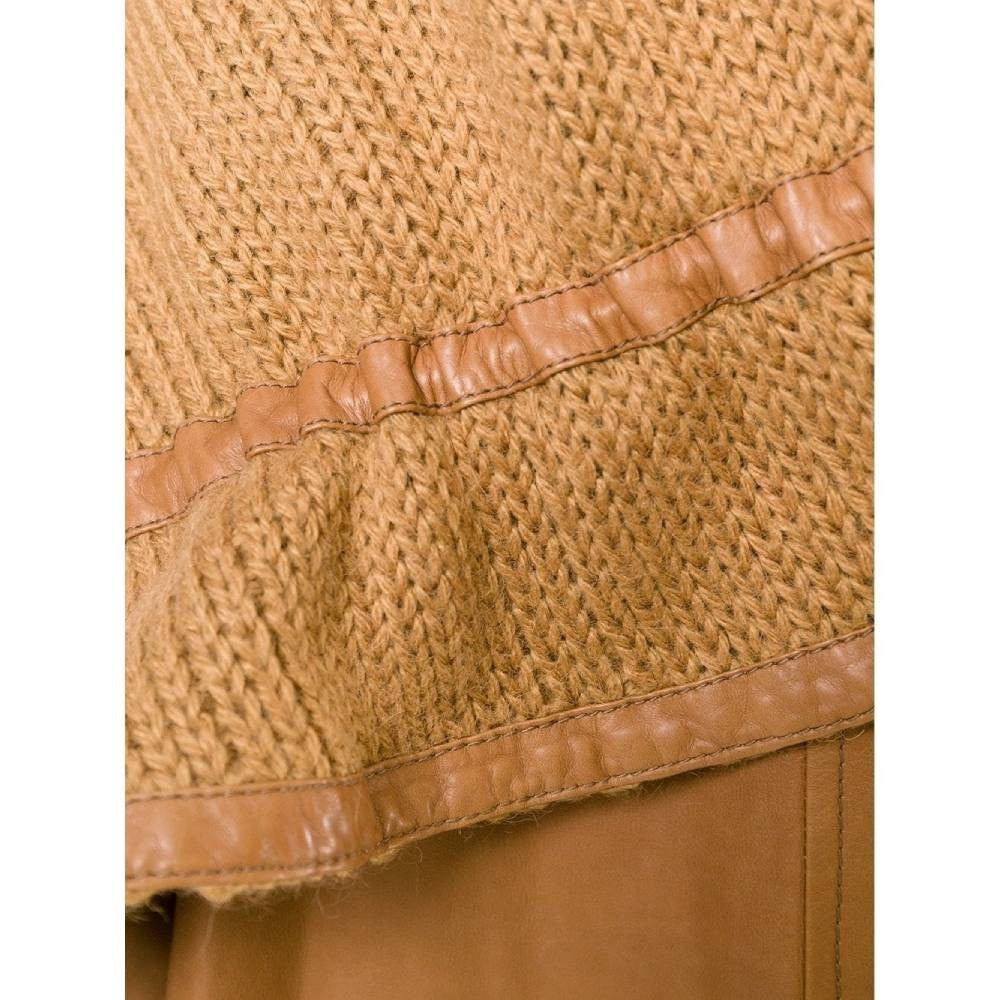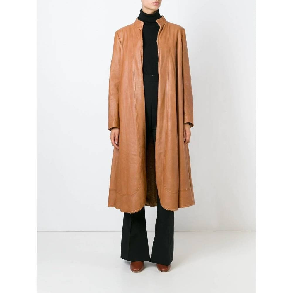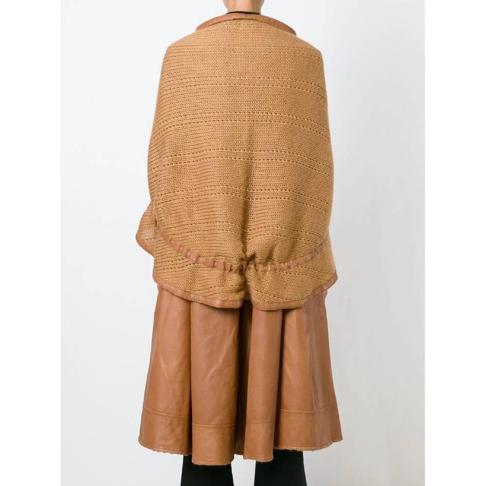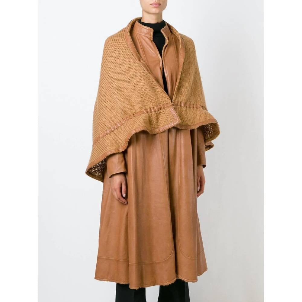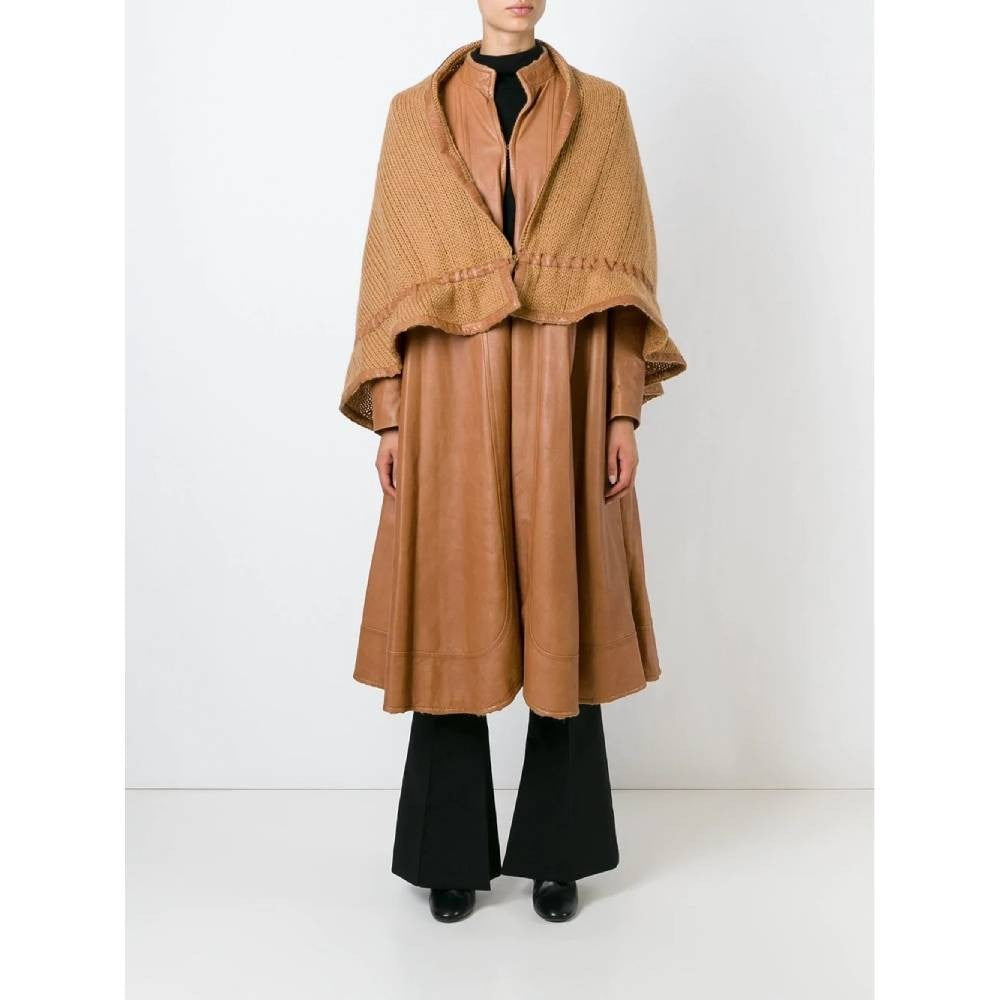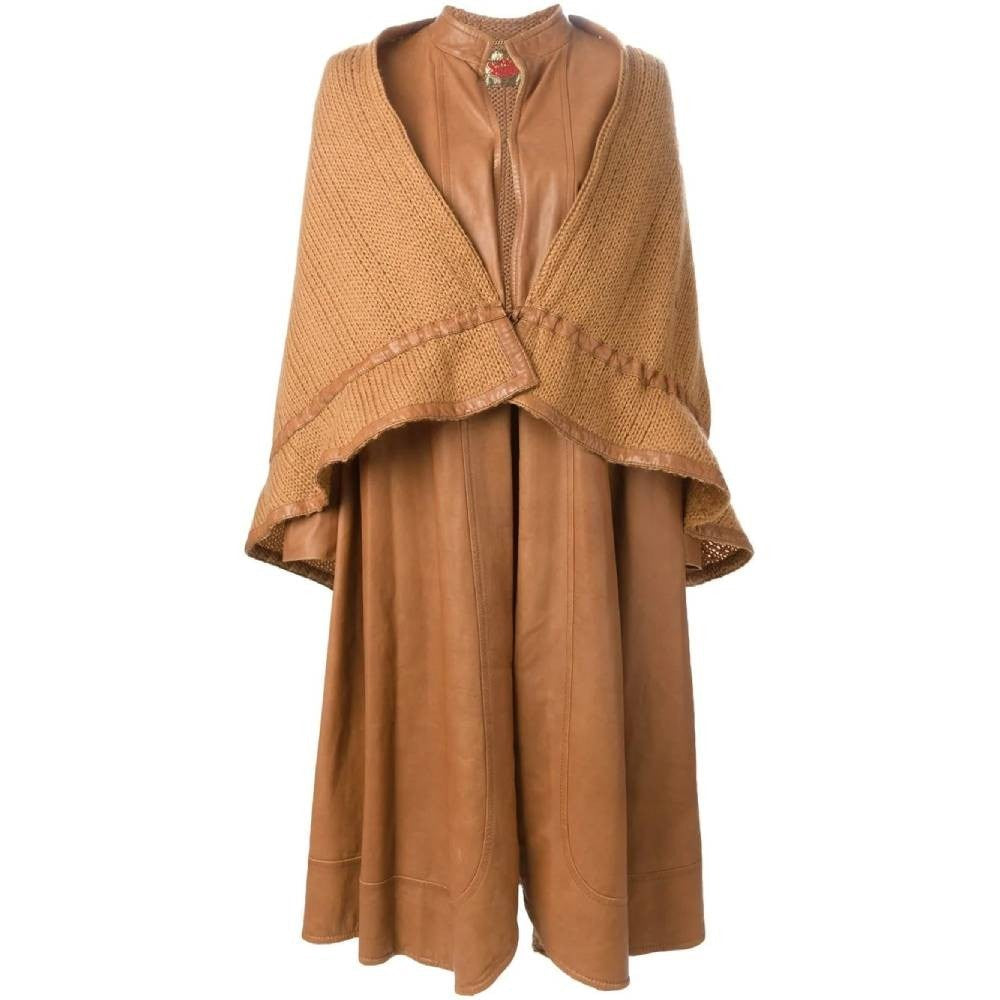 Roberta Di Camerino light brown two-piece suit, consisting of a flared long leather coat with high collar and hook closure, and a knitted cape with leather hems and drawstring. The item shows signs of wear on the leather, as shown in the pictures.