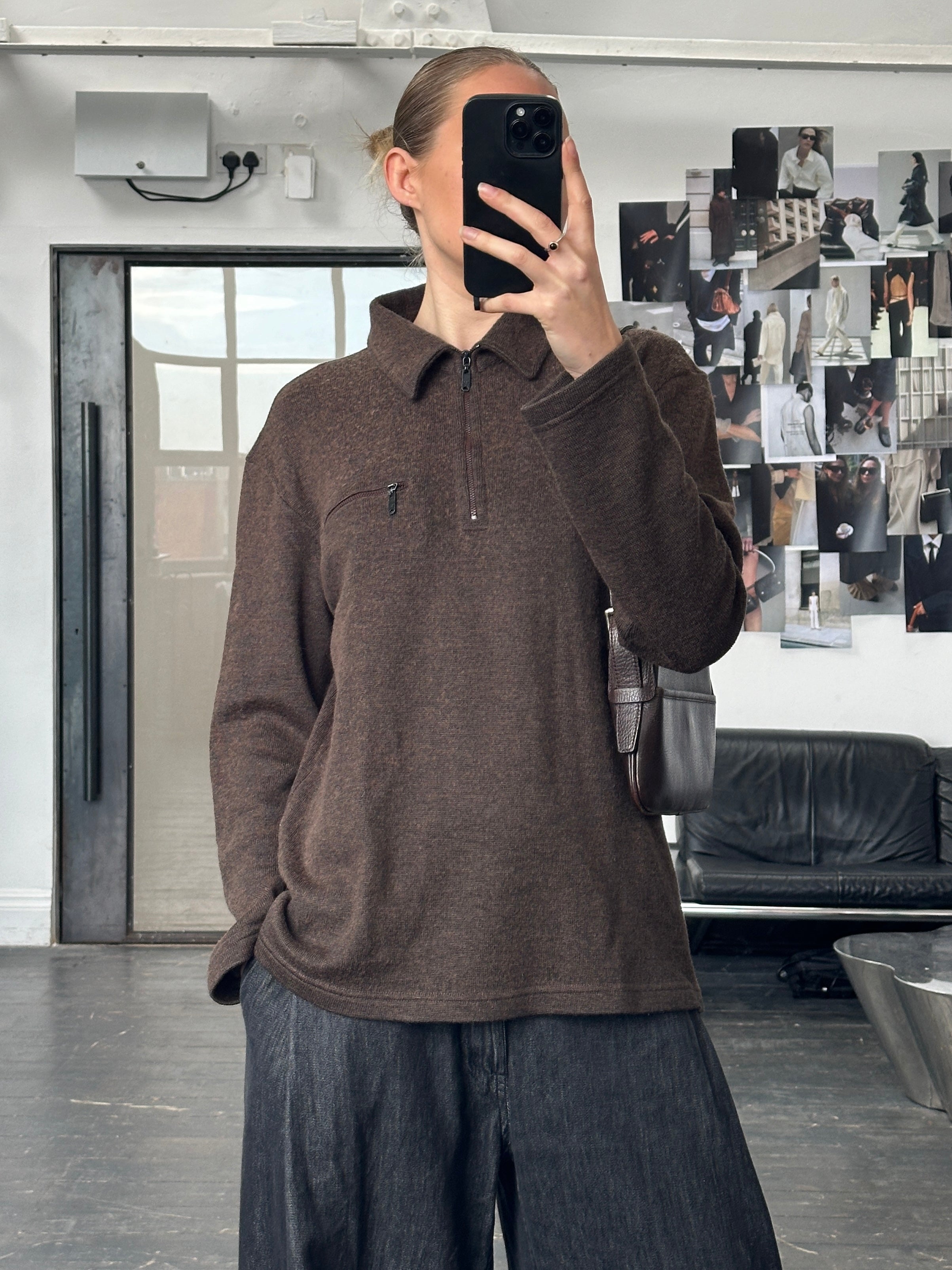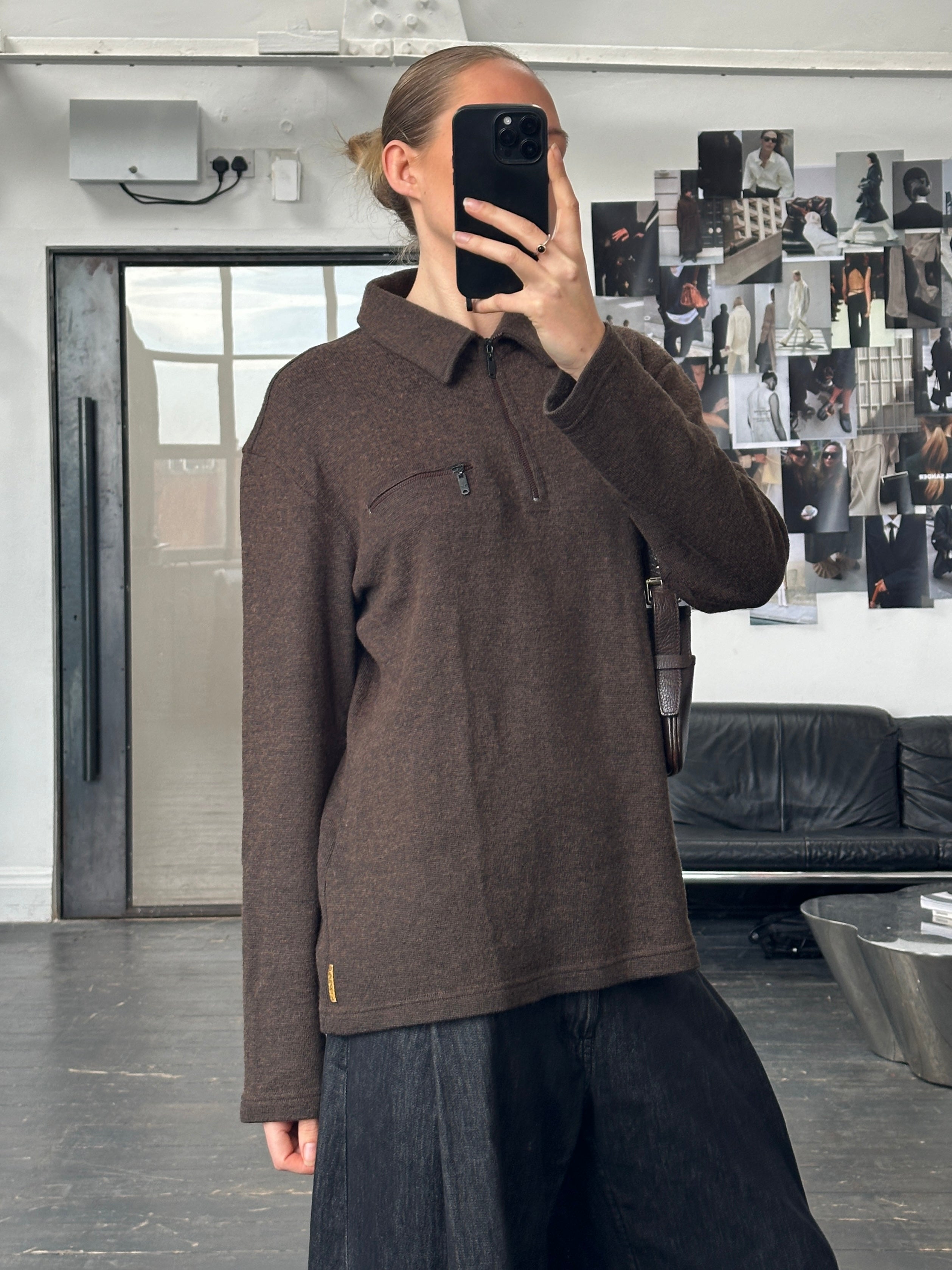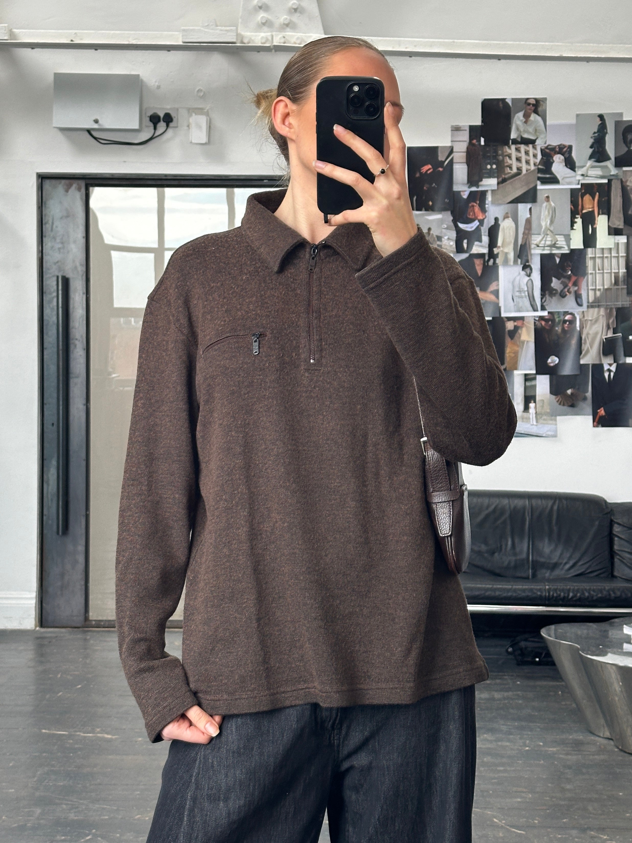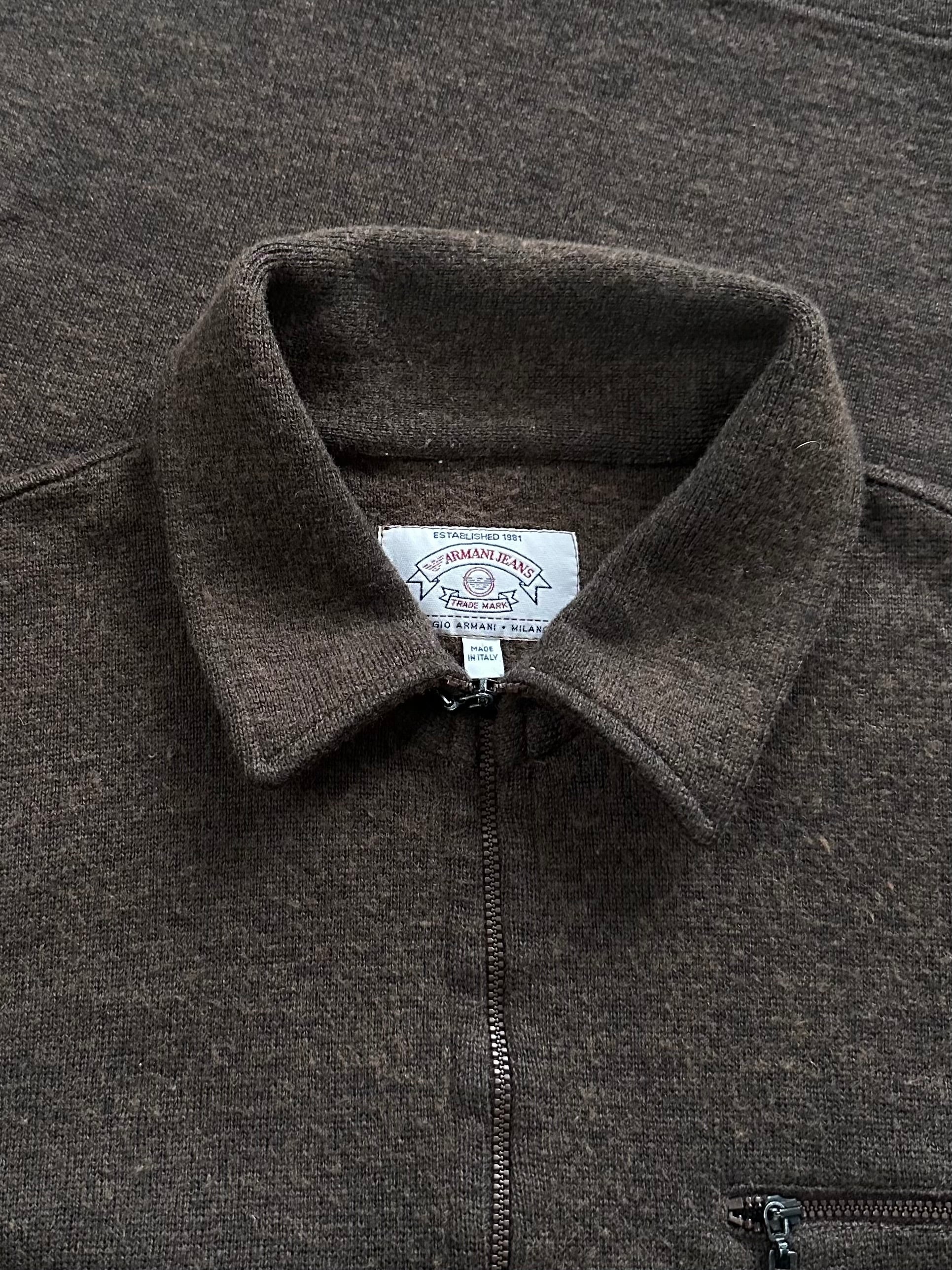 A brown quarter zip knit from the 1990s Armani Jeans line featuring branded eagle zip pulls and subtle interior collar logo detailing. Soft and midweight with a relaxed everyday feel.