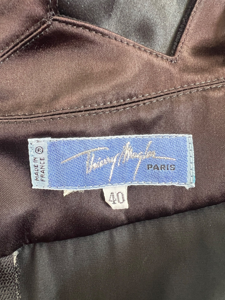 This spectacular black satin and velvet maxi gown walked the runway as part of Thierry Mugler’s iconic Spring 1992 collection (Look 18/84). It has been exhibited as part of the Alaïa et Mugler exhibition at the Fondation Azzedine Alaïa in Paris, and is remarkably similar to the custom Mugler dress worn by Demi Moore in the 1993 smash-hit film Indecent Proposal.