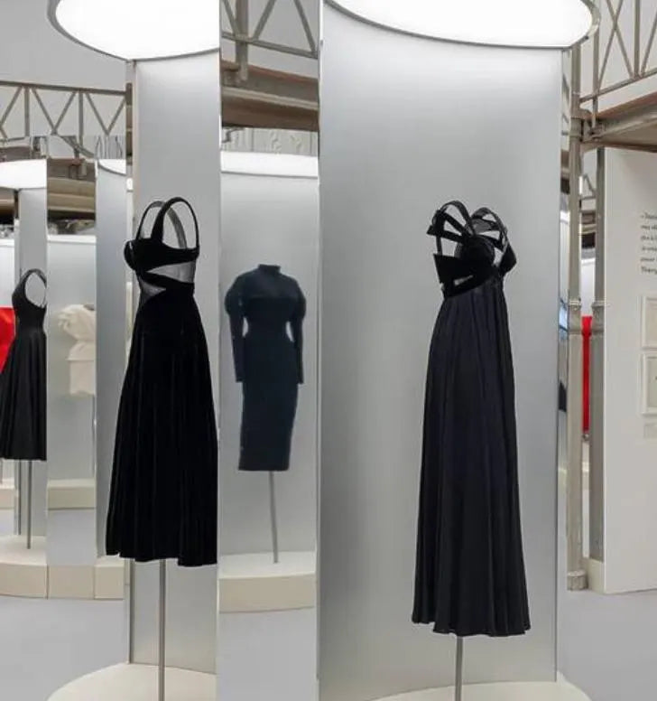 Created by the master of empowering, hyper-feminine tailoring, this dress offers a Mugler twist on a classic black ballgown. The body is crafted from black silk-satin, with a sweeping A-line cut and full-skirt that swirls around the ankles as the wearer moves - or dances. The top of the dress is detailed with rich black cotton velvet, which forms a cage-like construction across the shoulders - a trademark detail of the designer. The gown has a sweetheart neckline, trimmed with rows of black velvet that forms a sunburst shape above and below the bust. The centre of the bust is christened by a large black velvet bow. The back has a V-neck shape at the neck and cut-out cage detailing across the back of the shoulders. The back fastens with a long hidden tonal zip. There is a black velvet waistband that crosses the back. The velvet parts of the top of the dress are lined in matte silk. The rest of the dress is unlined.