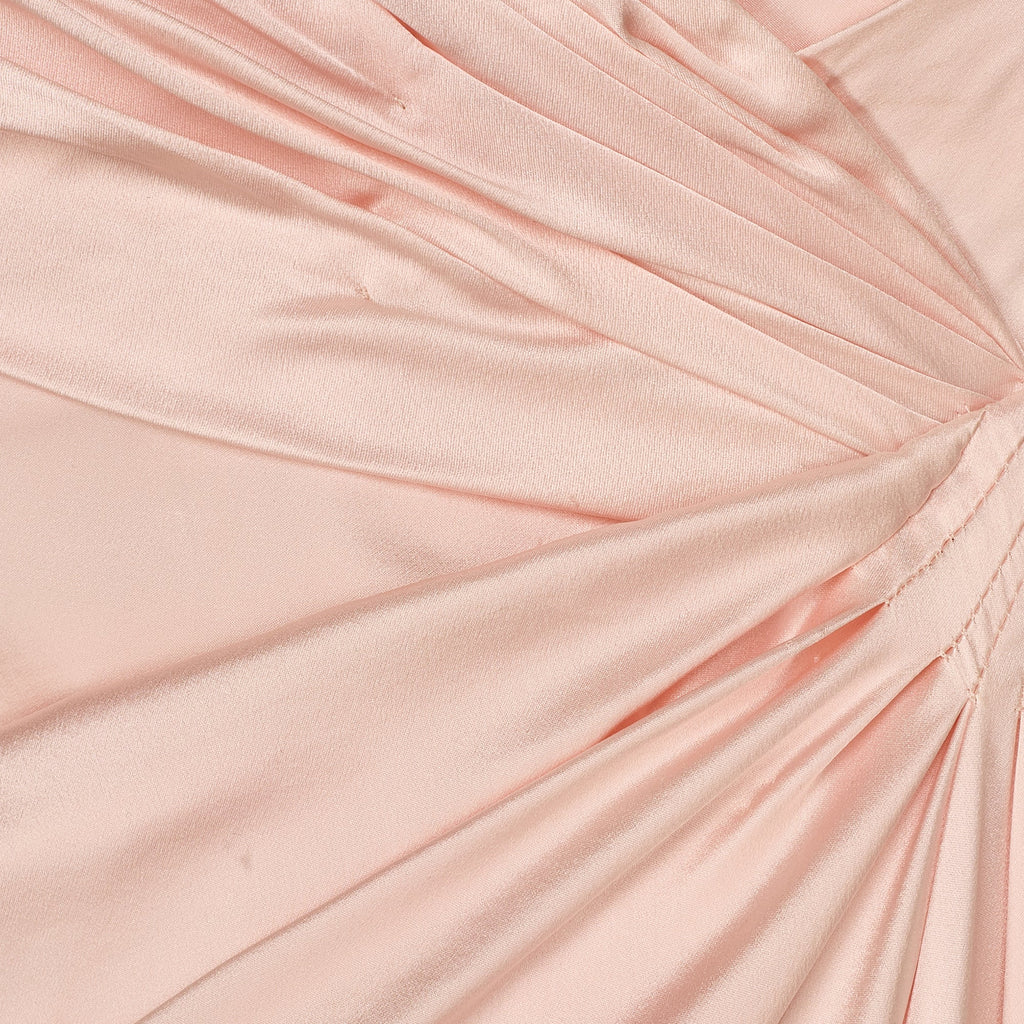 This muted pink silk dress was the spectacular finale dress in Thierry Mugler’s Fall 1999 collection. Designed by the master of empowering, hyper-feminine tailoring, it sculpts the body in a manner that recalls Grecian draping. The dress is composed of two parts which have been sewn together. There is a corseted top with an angular sweetheart neckline composed of gathered silk. One side of the bust sits higher than the other and forms a petal-like shape. The bust is boned all the way around to hold its shape and to cling to the body. The skirt is pinned to swirl around the body, gathered and pinned in place at the front and falling in a starburst formation. This gown is unlined. It fastens under the left side of the bust with multiple snap closures where the free-flowing fabric meets the structured bust. On the runway, the dress was pinned with a brooch; this is not present on this dress.