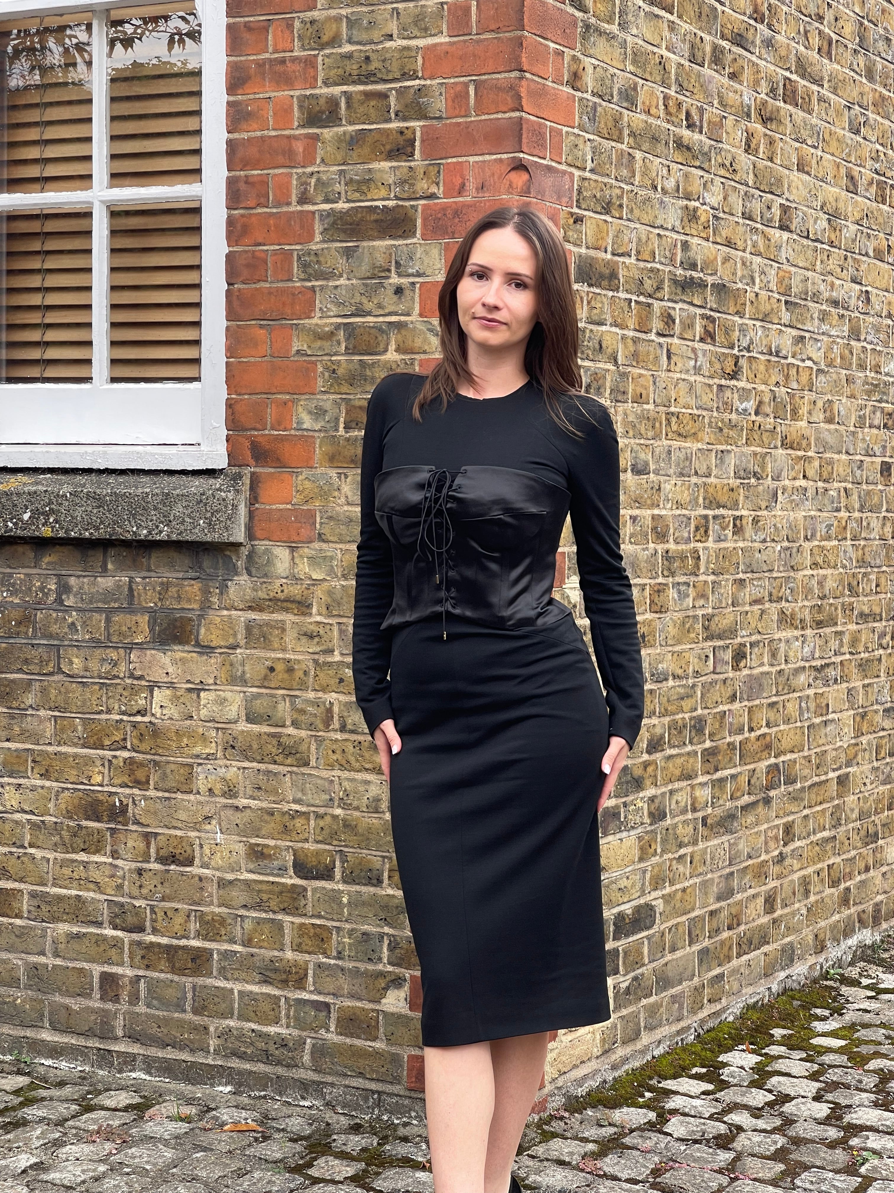 This sophisticated Tom Ford black jersey and satin corset dress is a super flattering and sexy design, perfect for party season. It comprises a long sleeve black jersey wool dress with integral black satin bustier detail, with front ties to create a feminine shape. The corset section is made of a thick luxurious satin and is also boned to offer support - vertical darts to the centre section further enhance the nipped in shape and it fastens at the back with another exterior zip. This time made from a gold metal, which offers a striking contrast to the rest of the dress. The skirt is cut in a classic pencil shape, falling to between knee and calf length, depending on height.