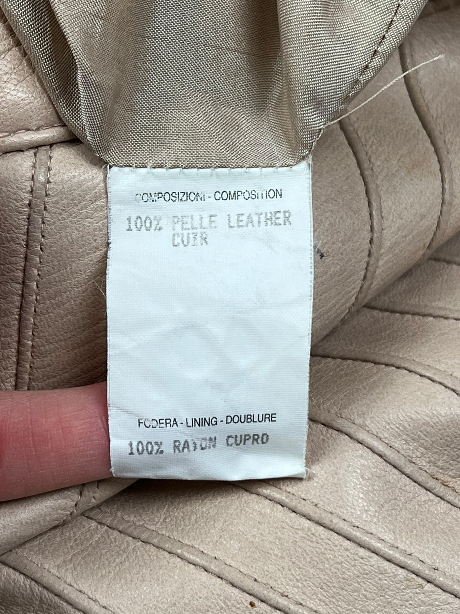 🐥 Condition is good considering age but these have light marks dotted throughout. Most notable on the bum and right knee. They are faint but need mentioning and the price reflects this. There are rust coloured glue marks along the sewn in stripes mostly near the bottom of legs as shown. Marks to heel areas. Zip and hook fastening functional. Crotch clean and stain-free. 100% leather outer, 100% rayon lining. Dry clean only.