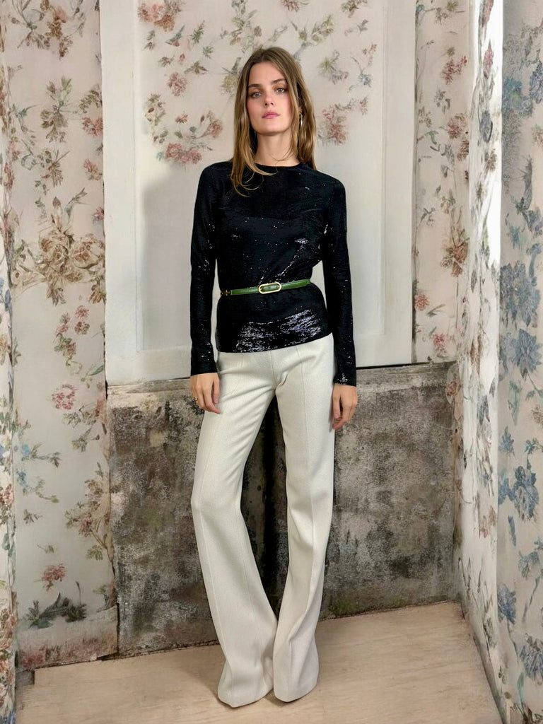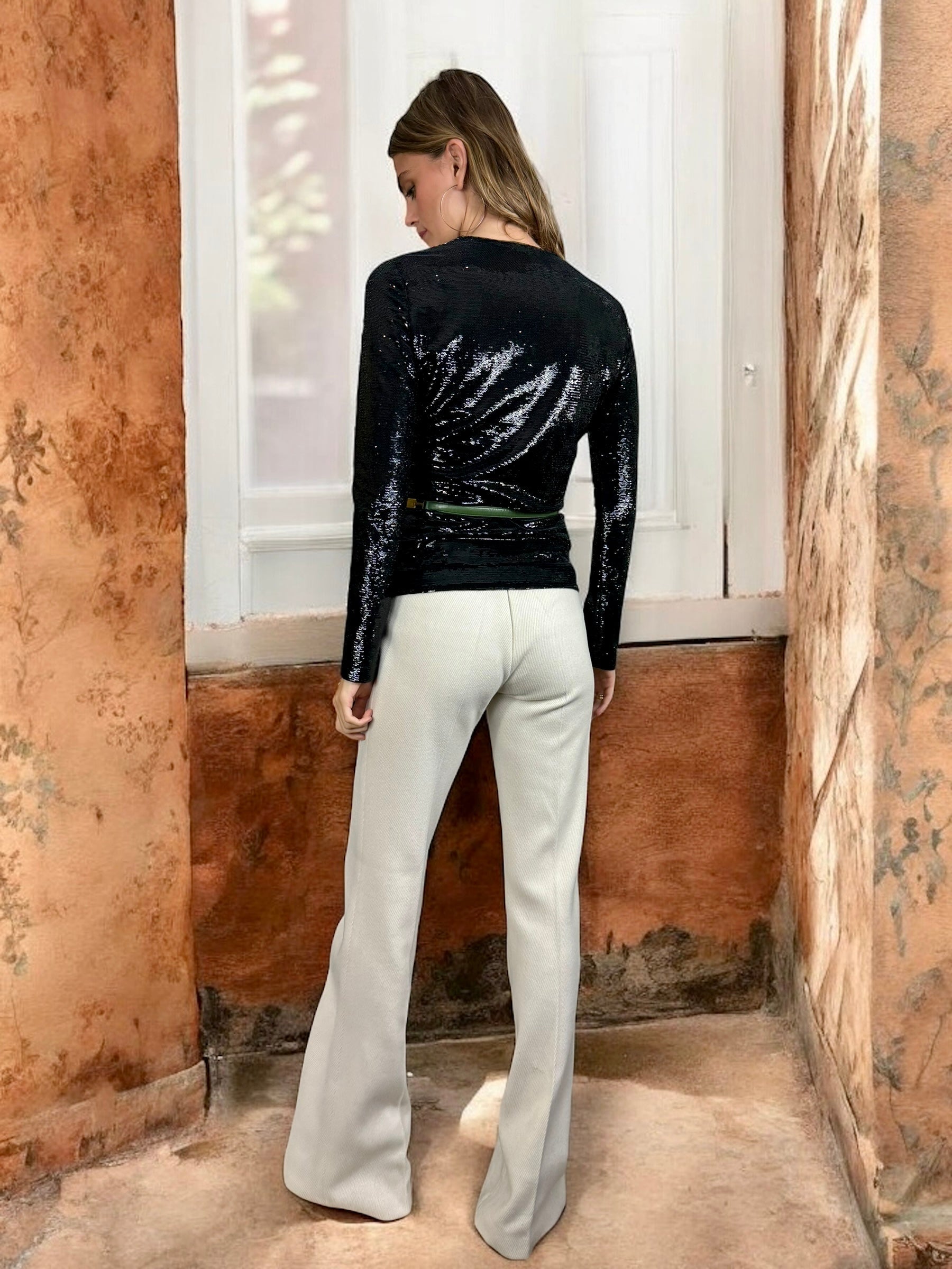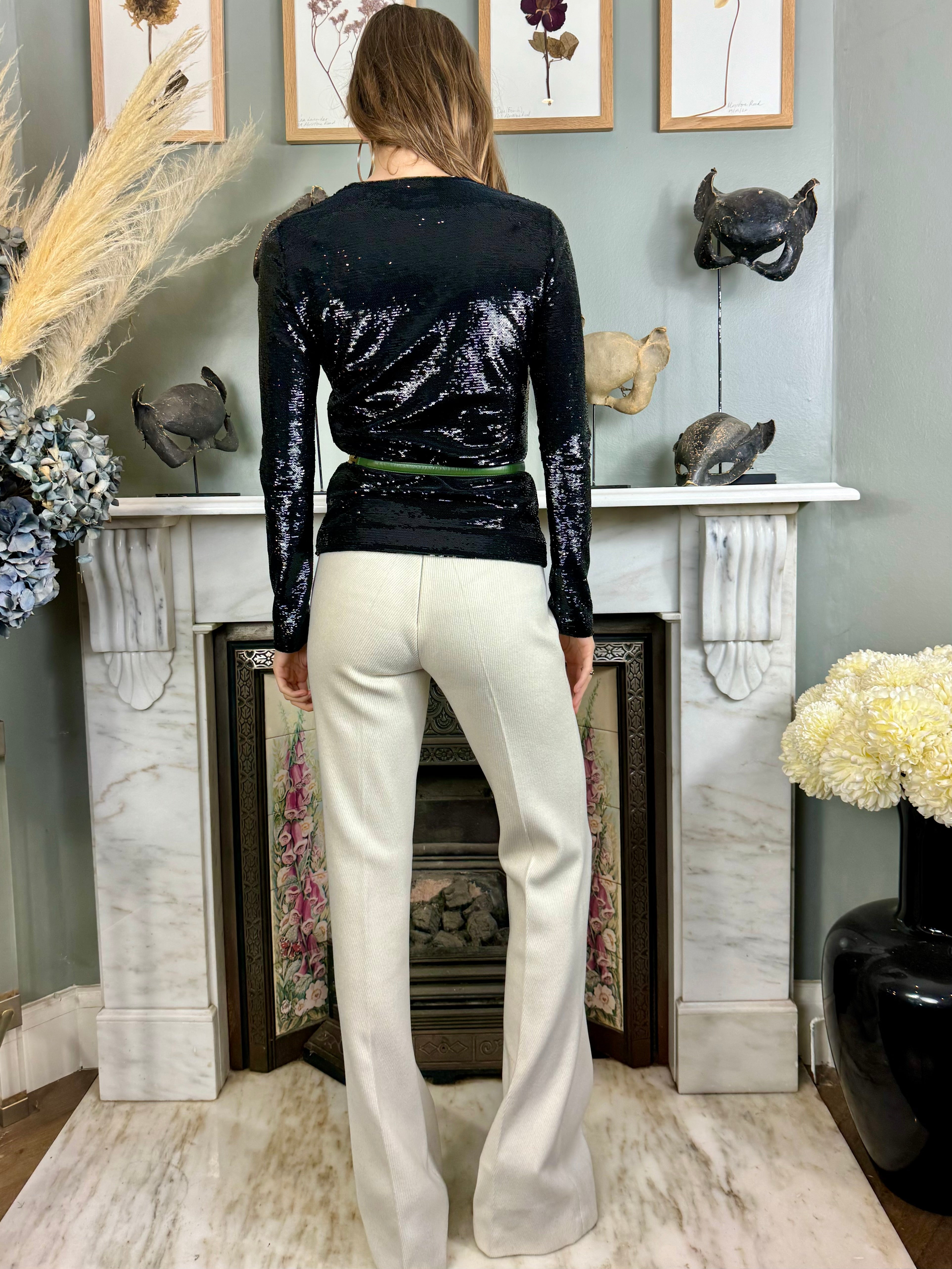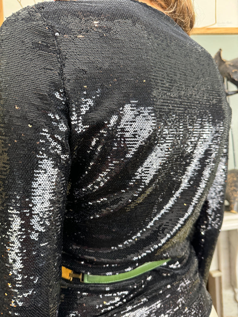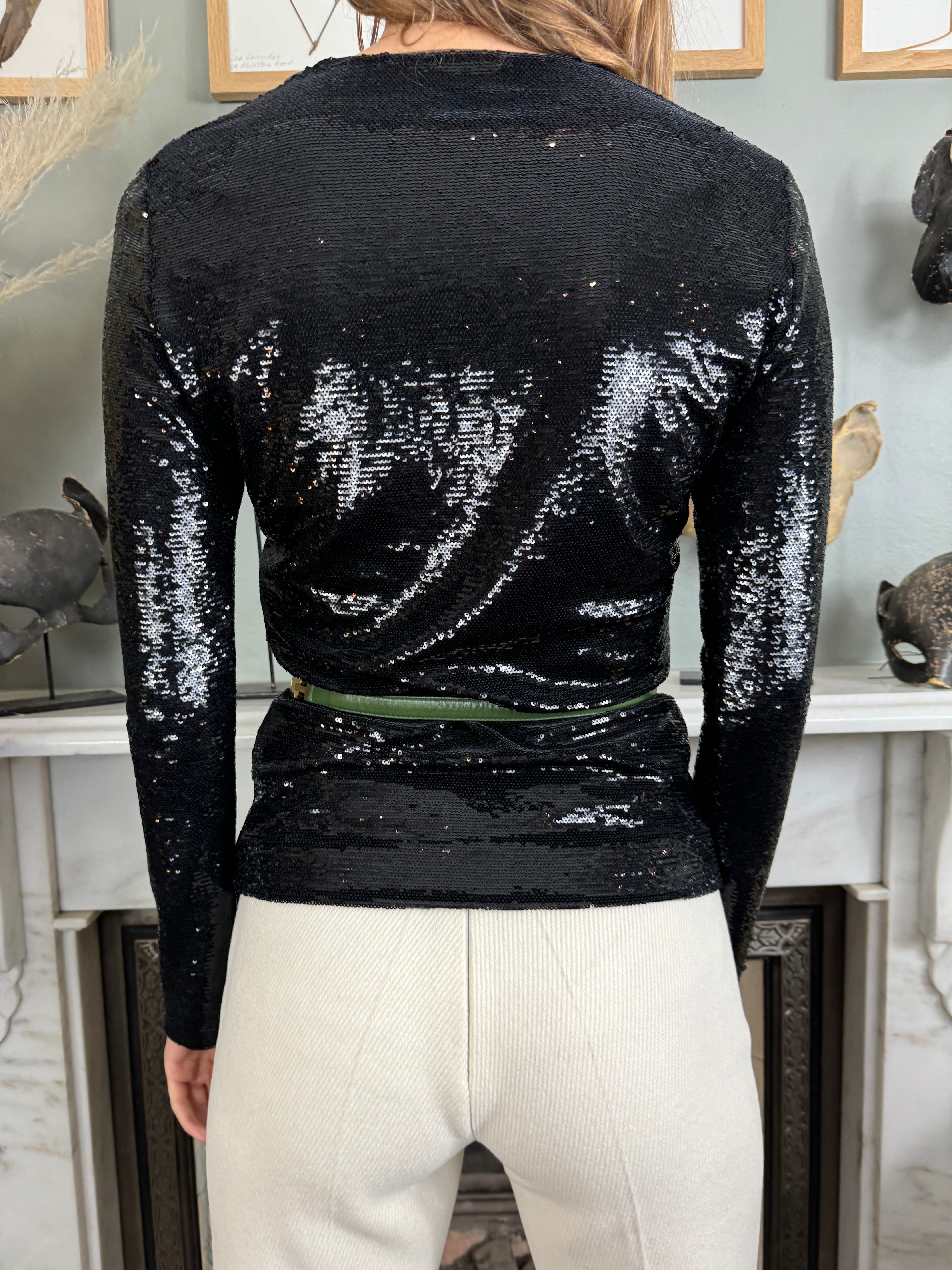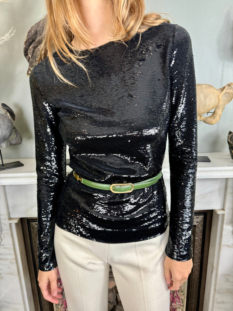 This Tom Ford black sequined top is perfect for layering, with a round neckline and shoulder zip. The stretchy lycra material ensures a comfortable fit while the straight cut adds a sleek look. Add a touch of sparkle to your wardrobe with this versatile piece.