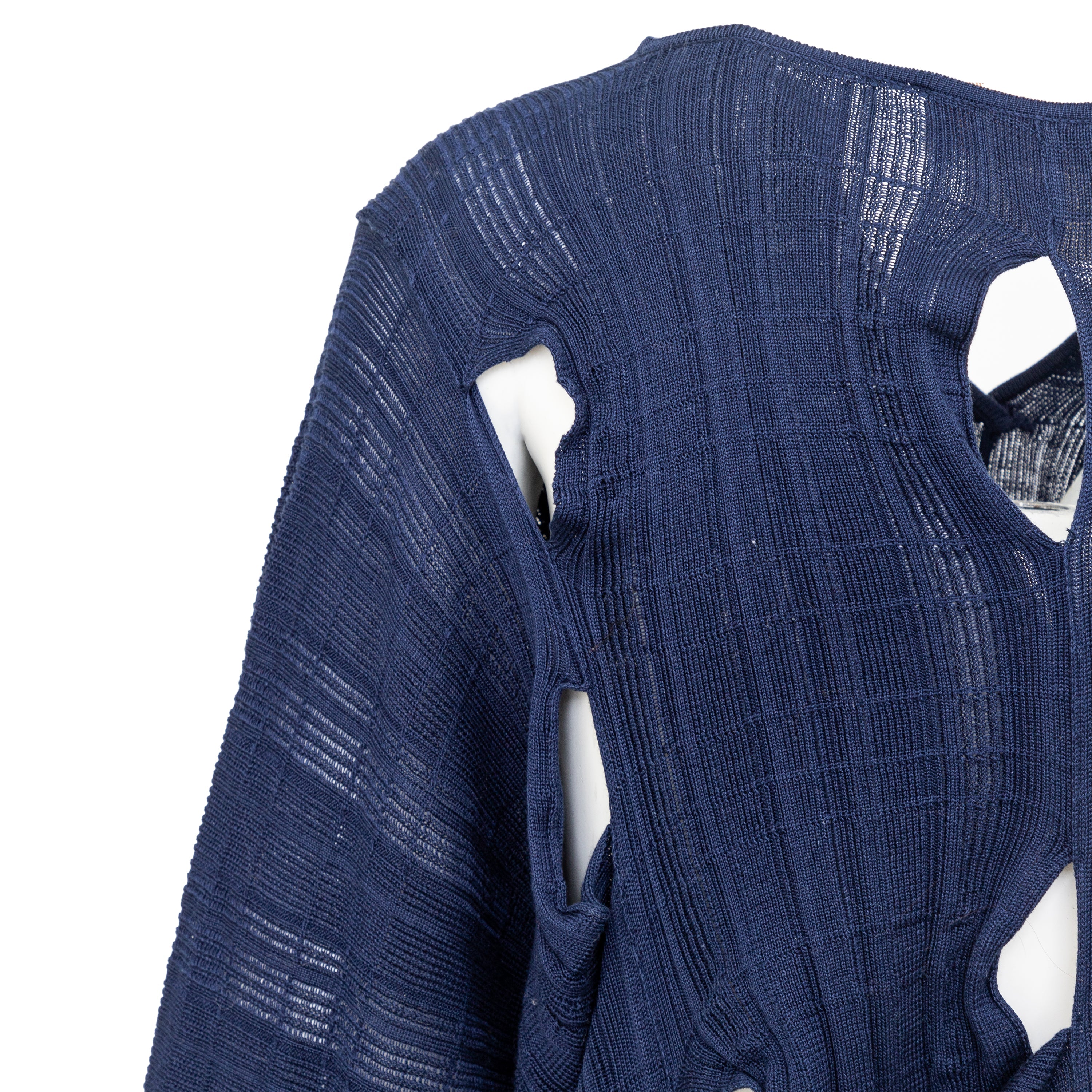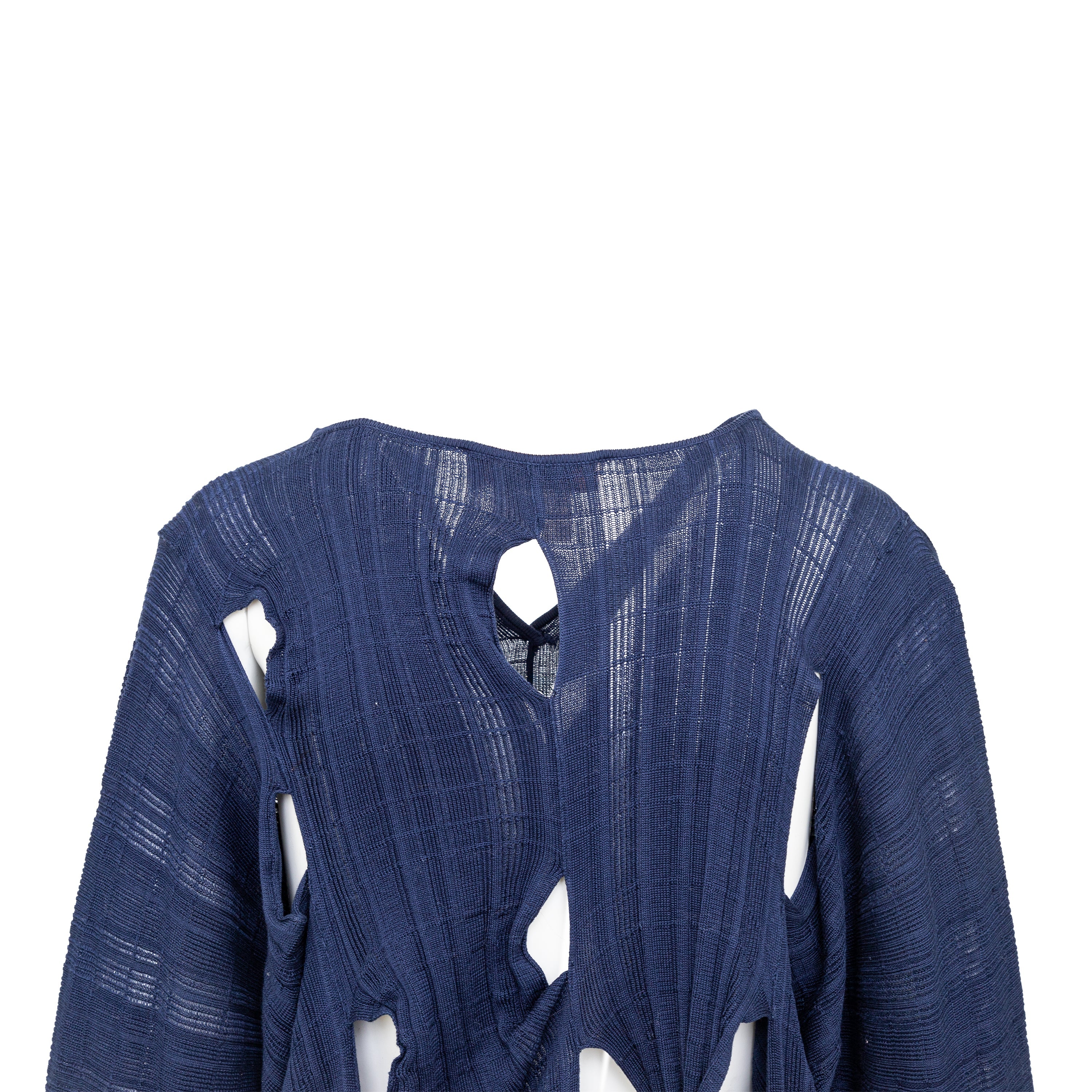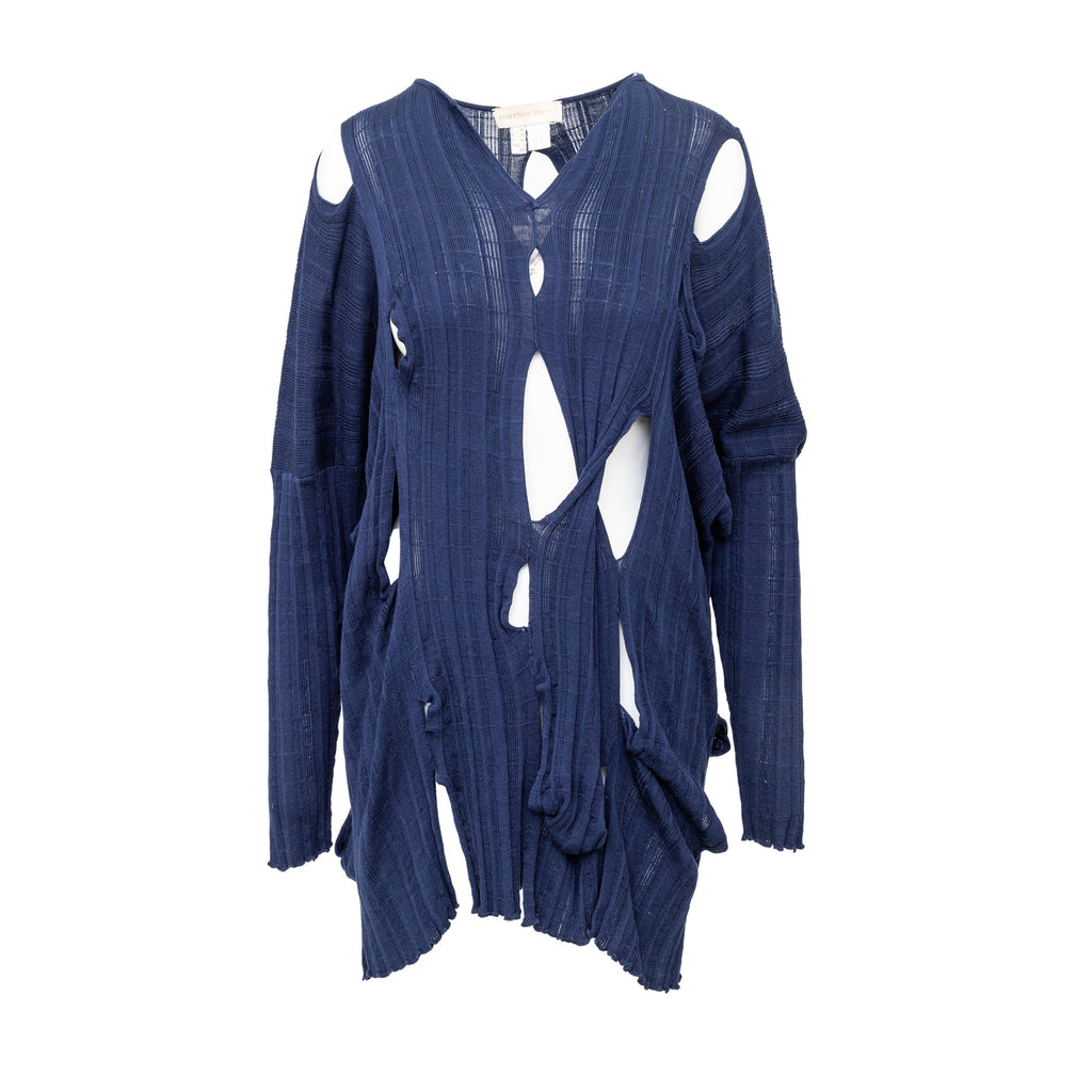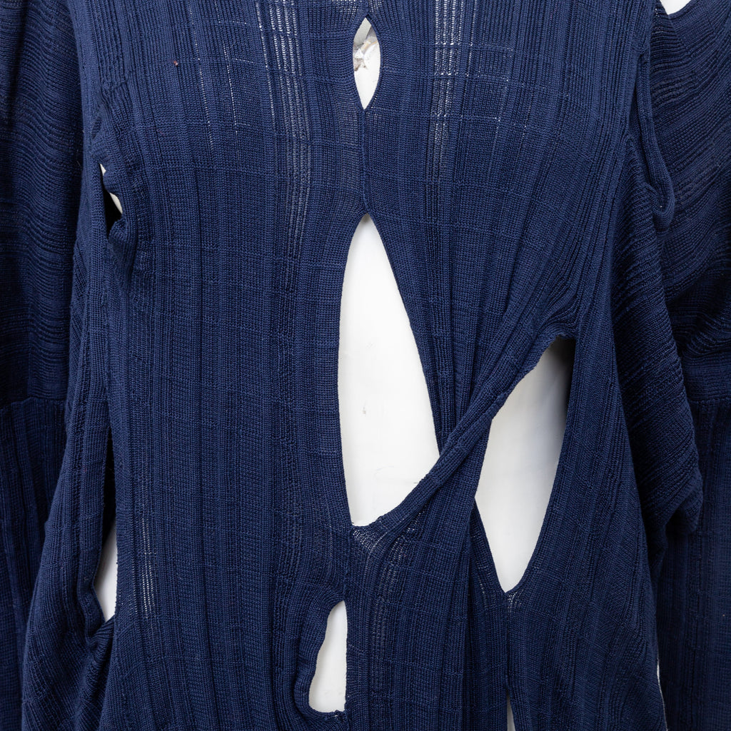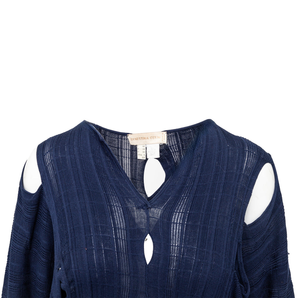 Indulge in the vintage yet modern design of the Ernestina Cerini Cut-out top. Made from 100% cotton with a ribbed texture, this dark blue long top features unique cut-outs all over. With a v neck and fitted sleeve, it can also be worn as a dress for an edgy look.
