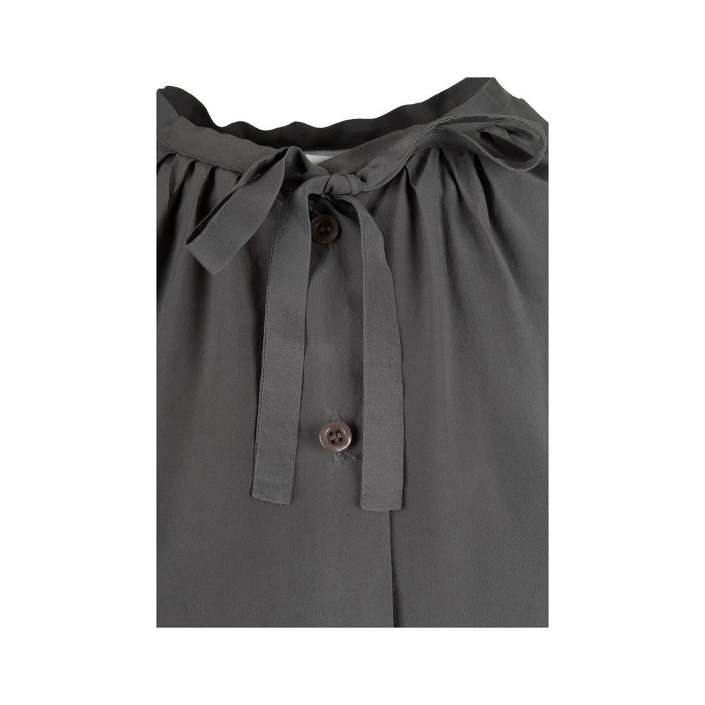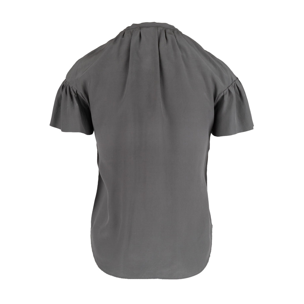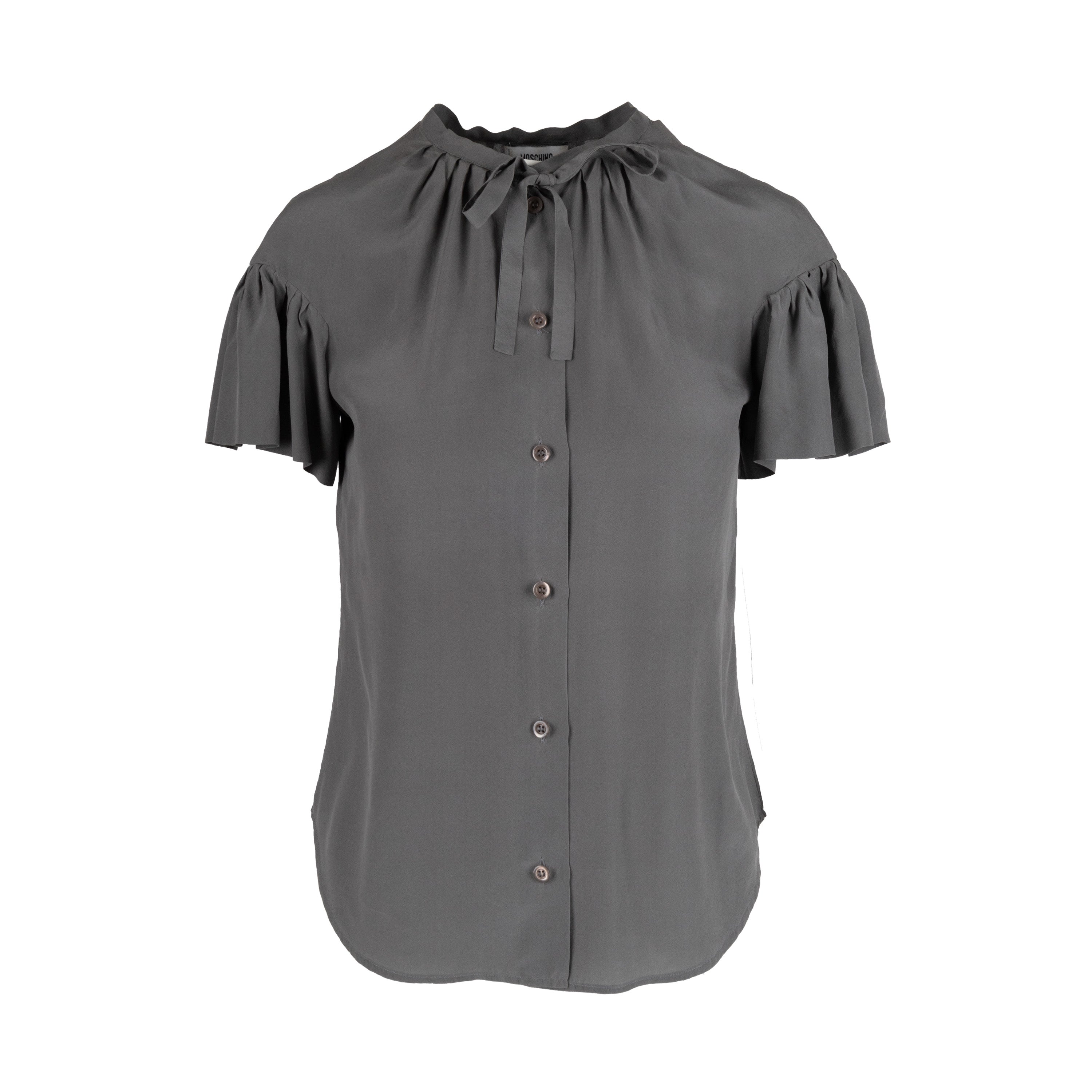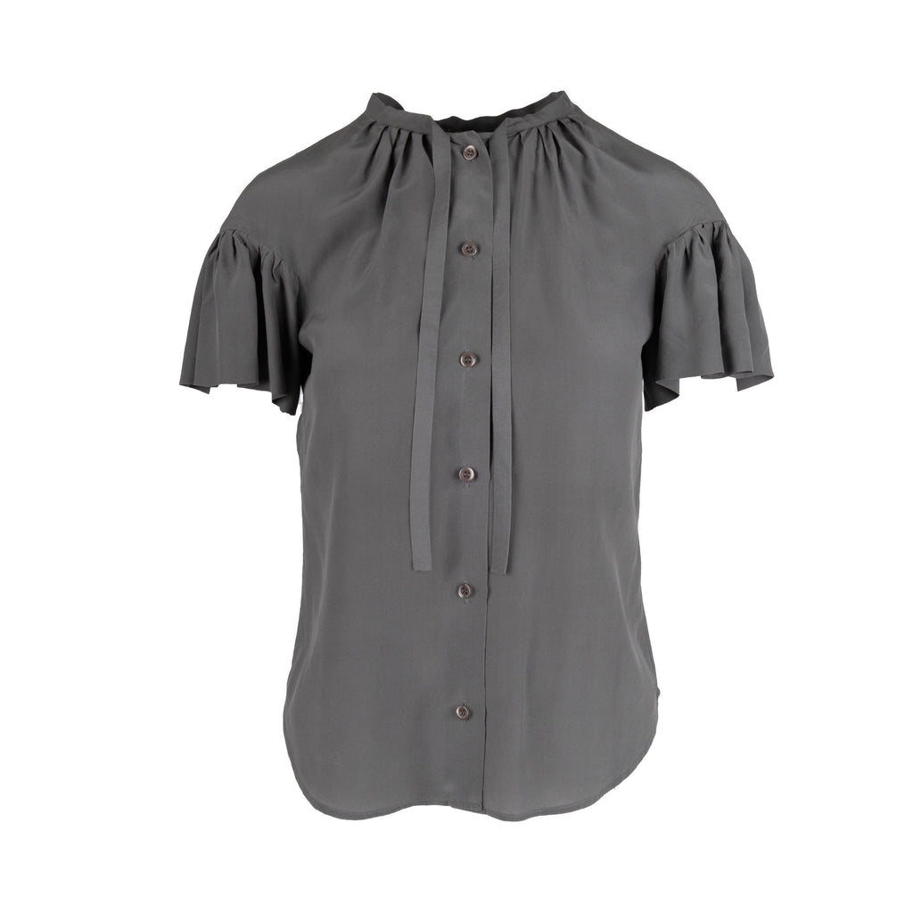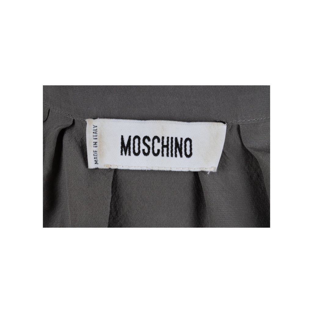 This Moschino top is made from dark grey silk fabric. Its front button closure allows for easy wear, while the tie-knot neckline offers versatile styling options. The short pleated sleeves add a touch of fullness to this chic top.