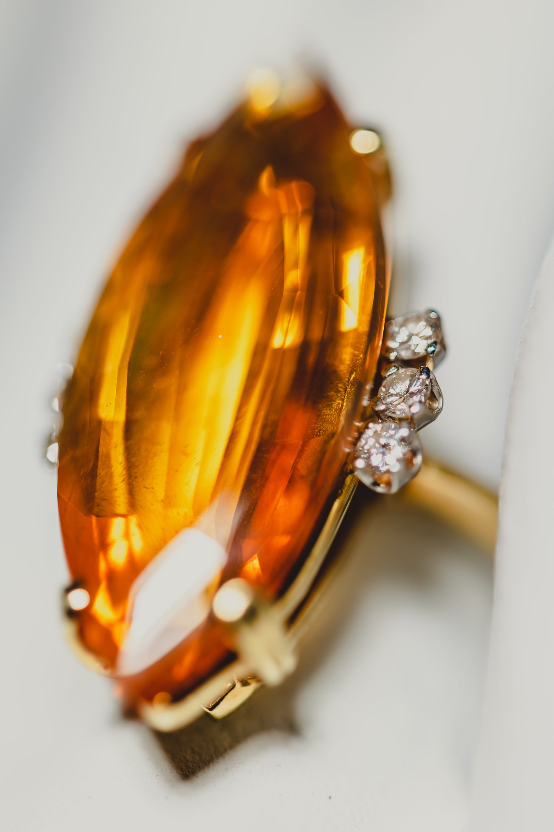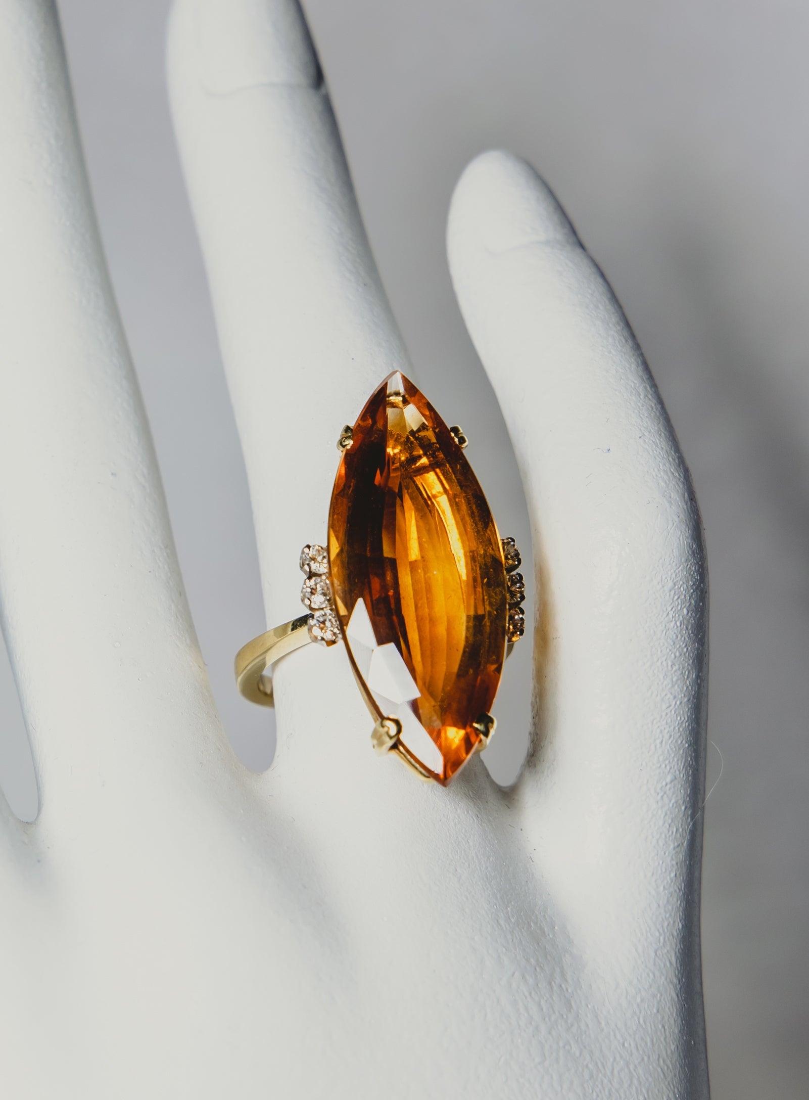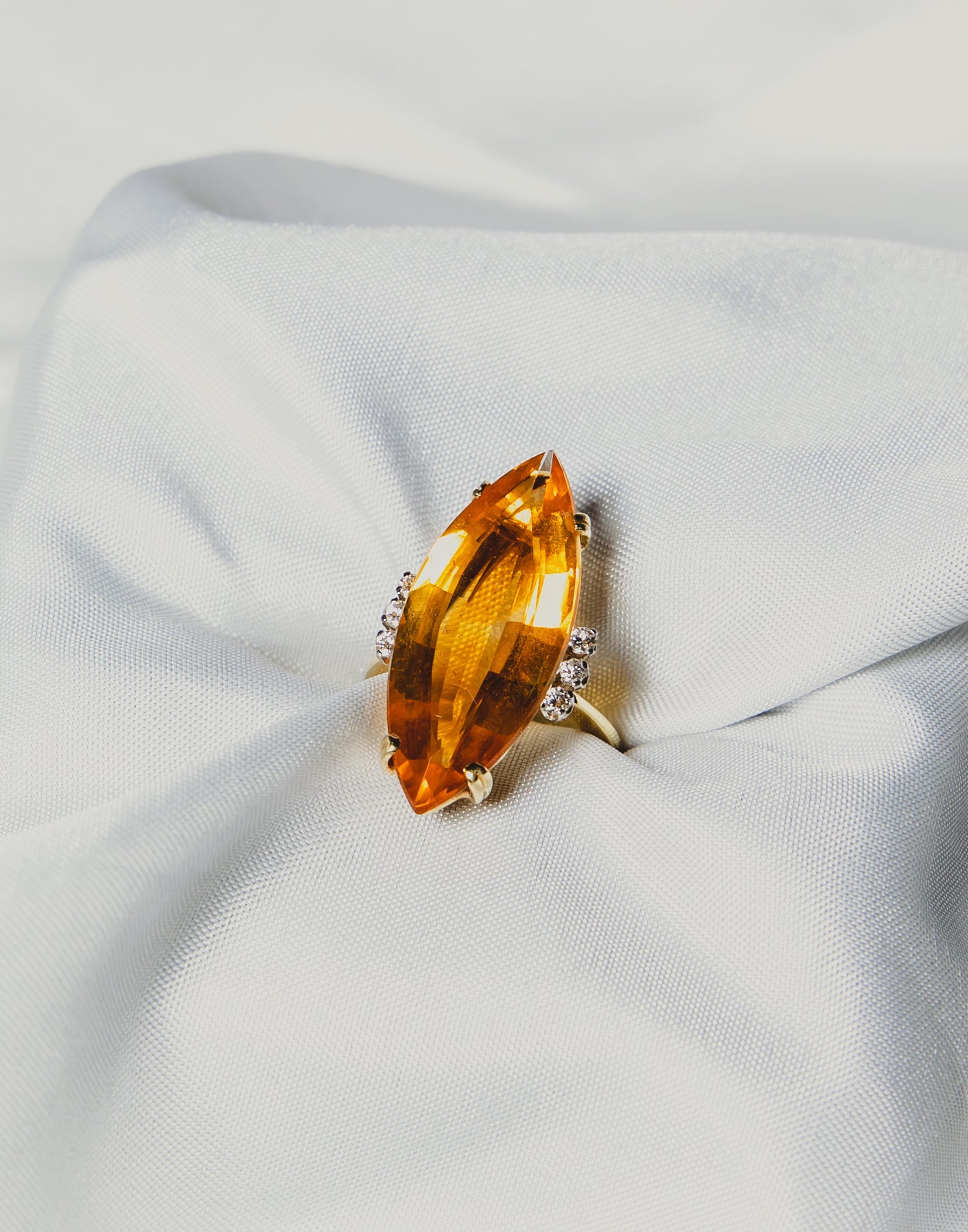 Get ready to be enamored by the magnificence of this Precious Topaz & Diamond Ring.  Crafted from 14K gold and flanked by six small diamonds, this beautiful marquis cut bauble will be a treasured companion for years to come.