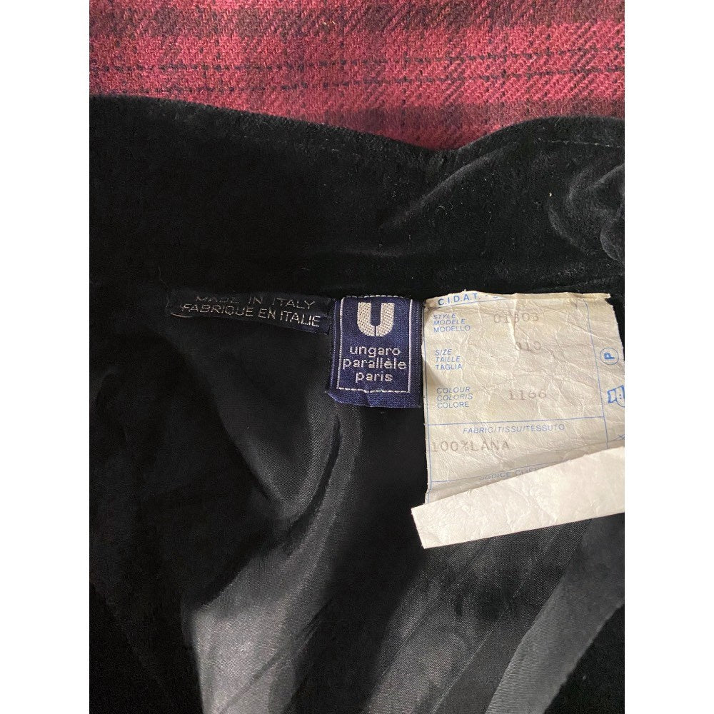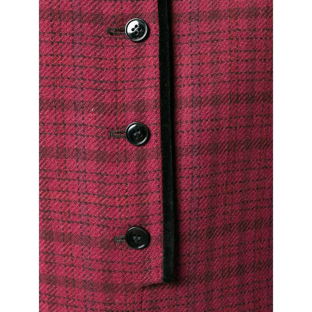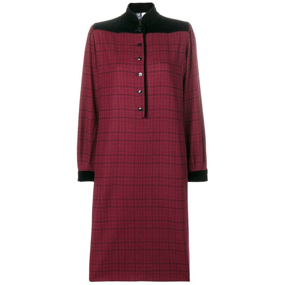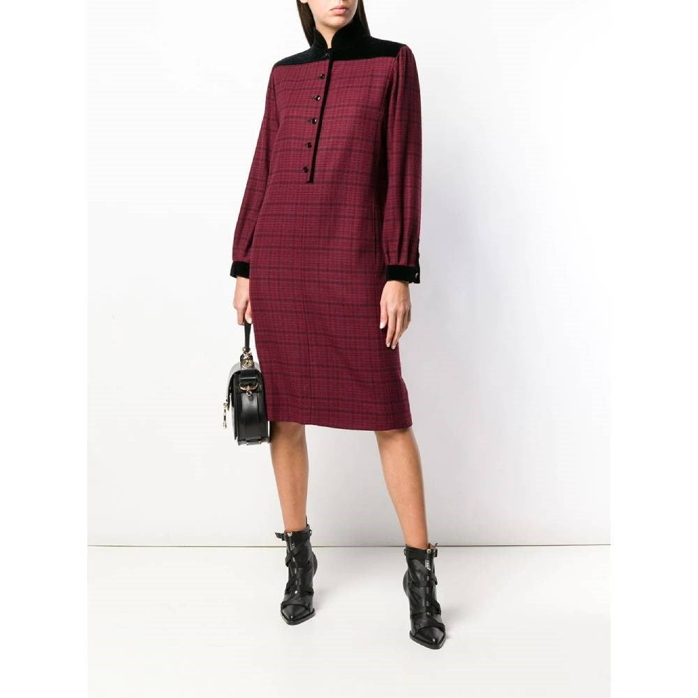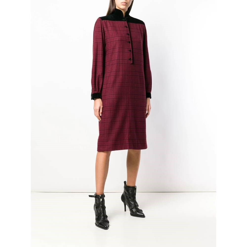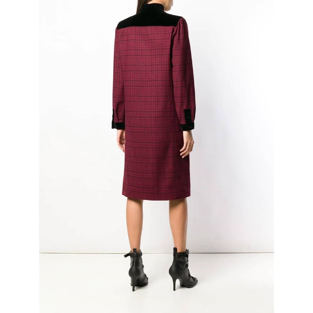 Emanuel Ungaro burgundy wool dress with black checked pattern. Stand-up collar, front buttons and black velvet details.