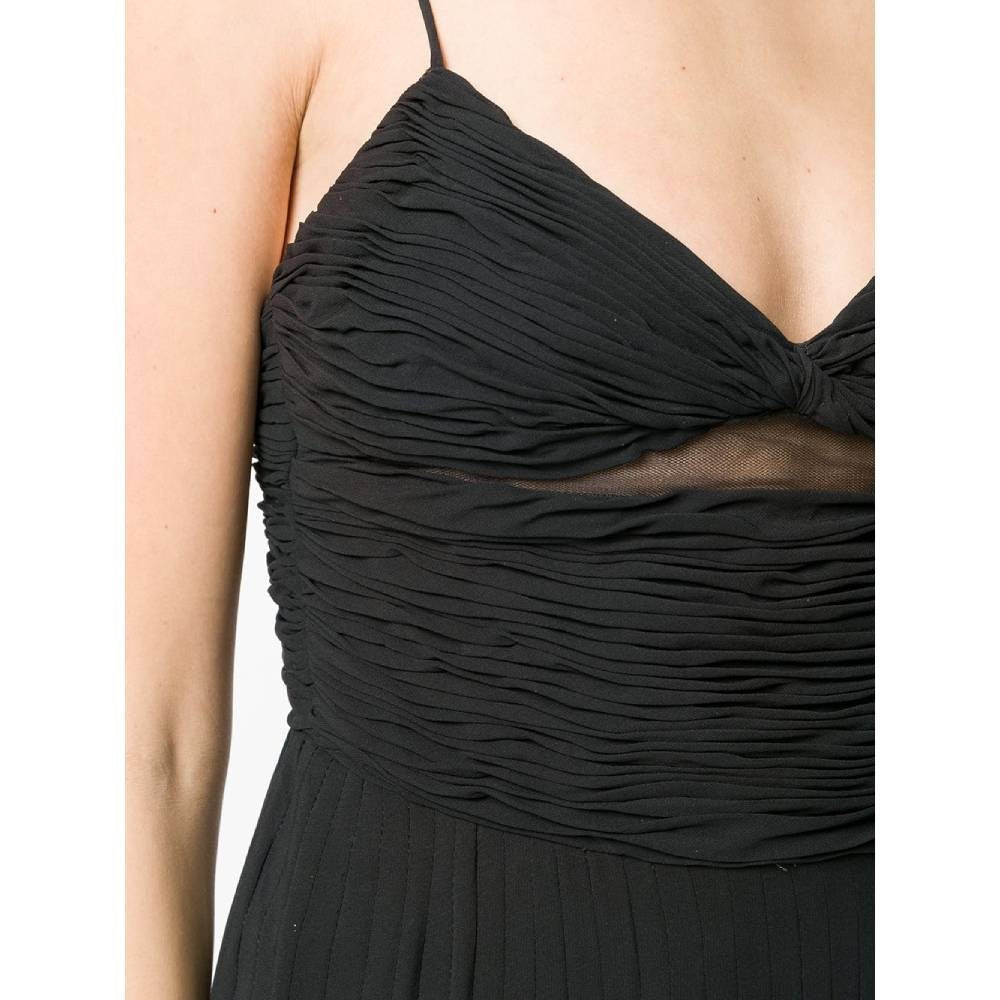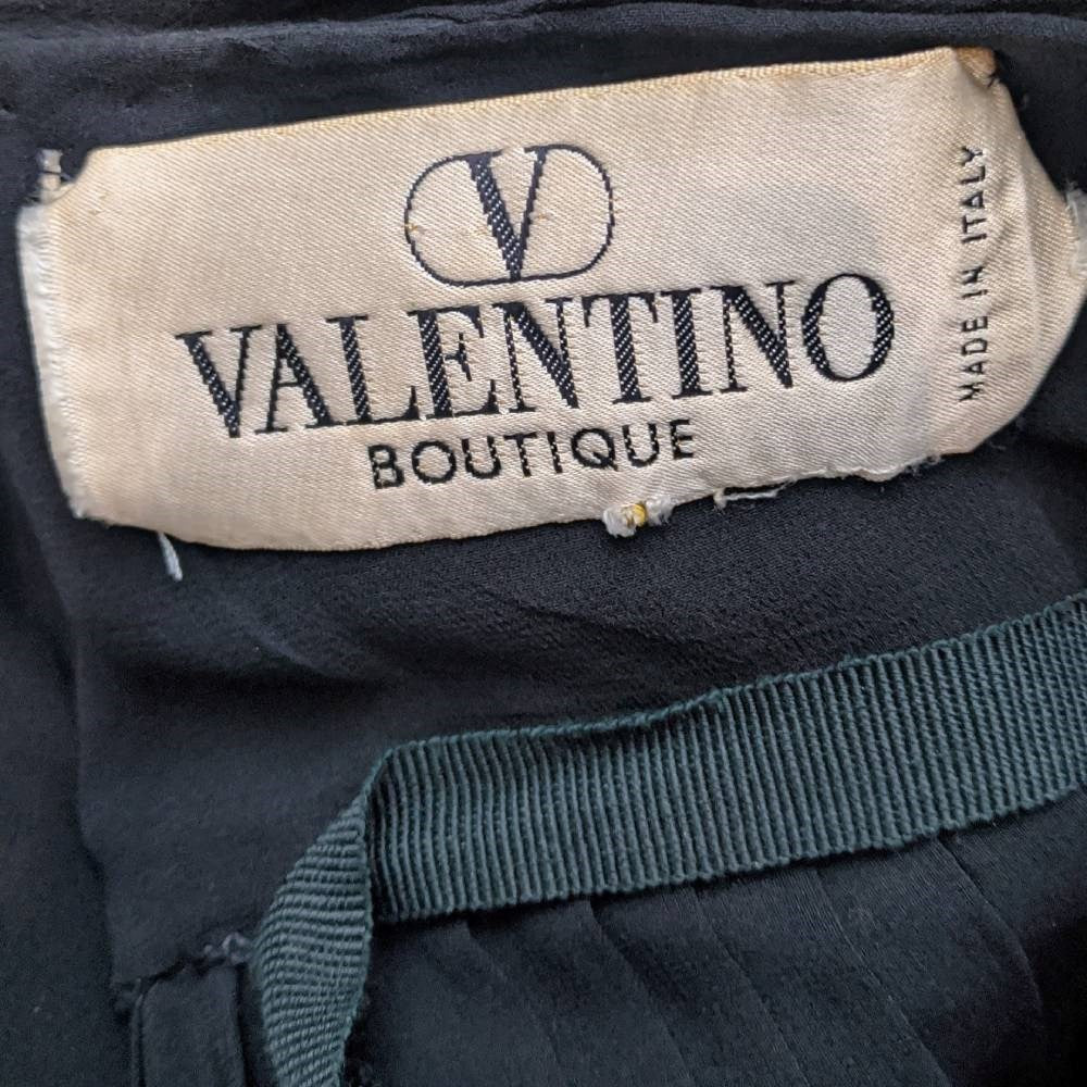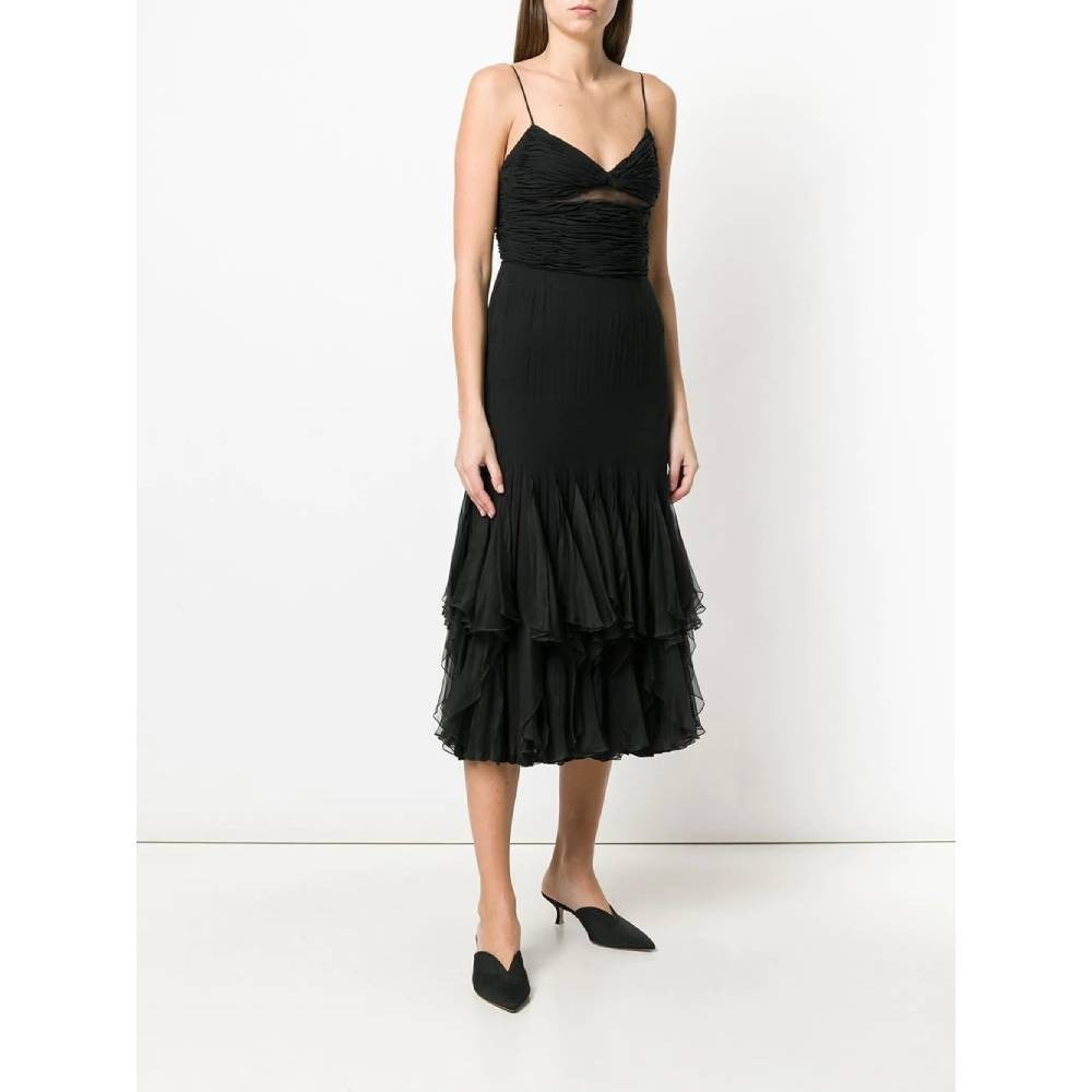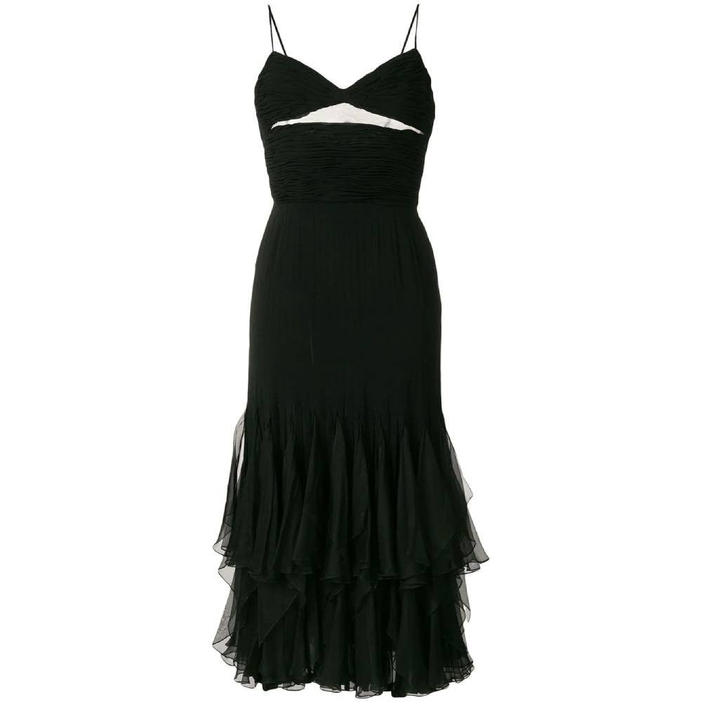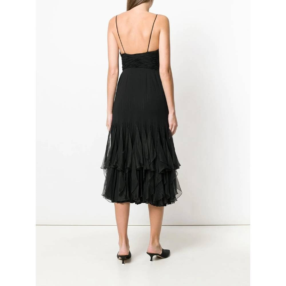 Valentino black silk dress. Model with thin straps, V-neck and curled top, layered ruffle on the bottom. Side zip and hook closure.