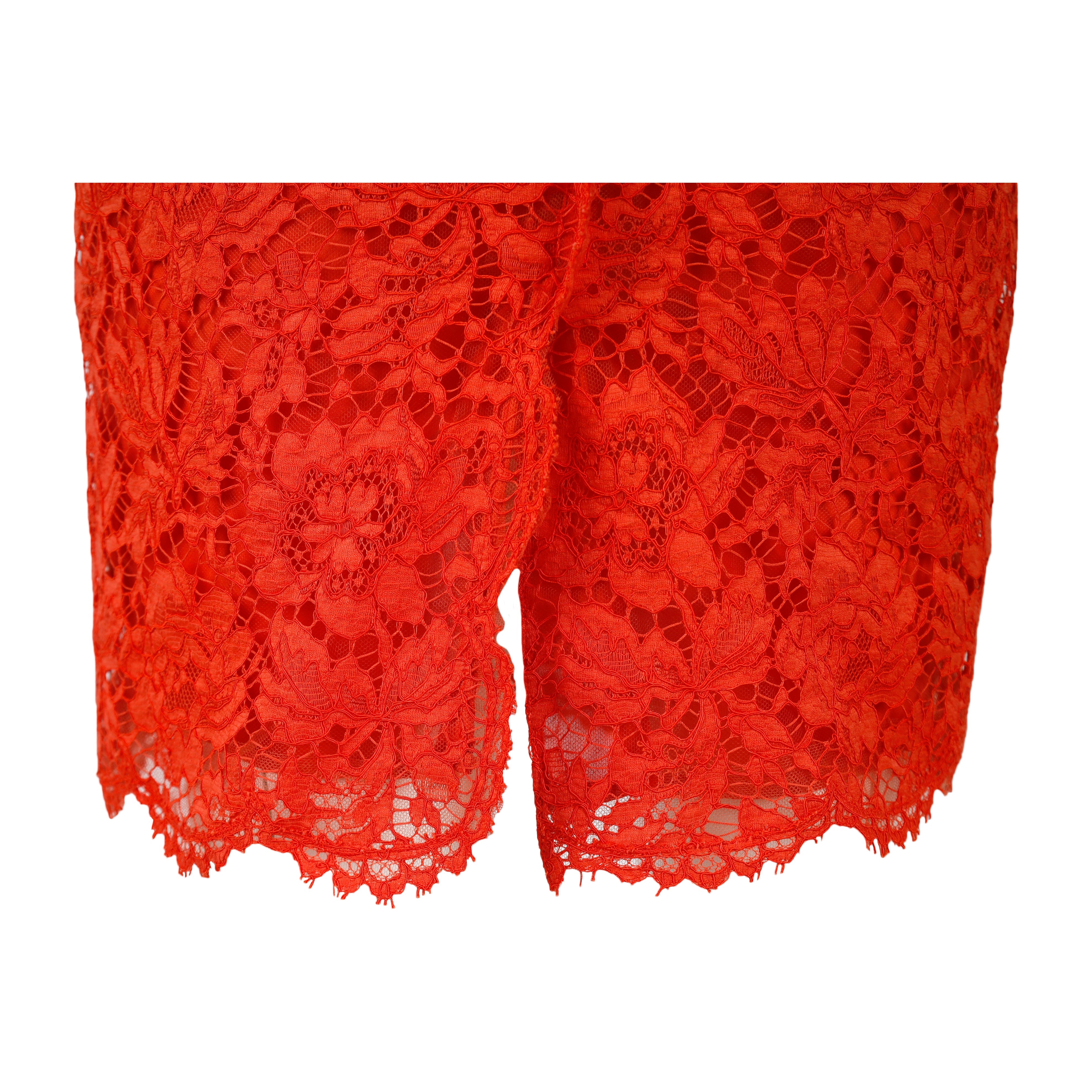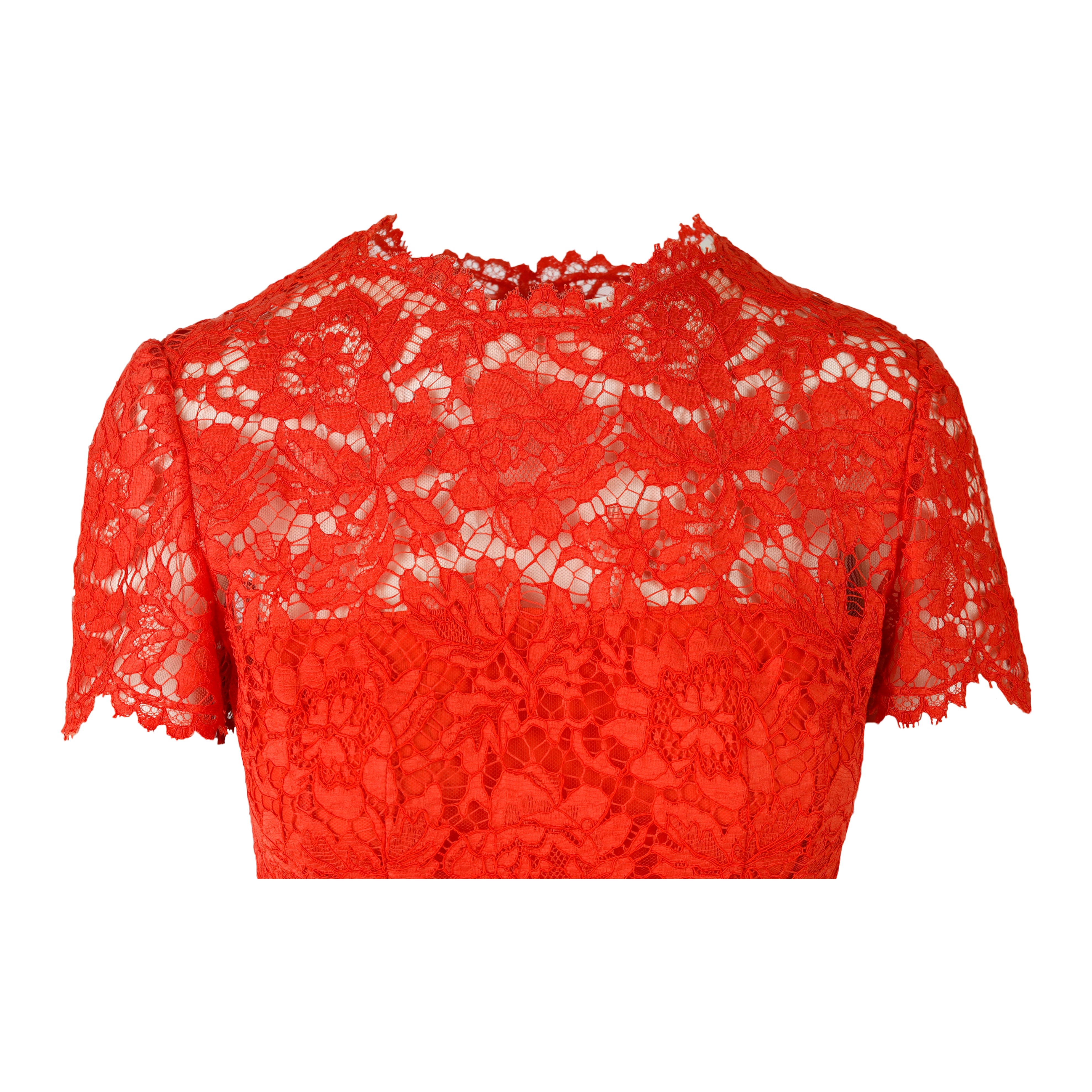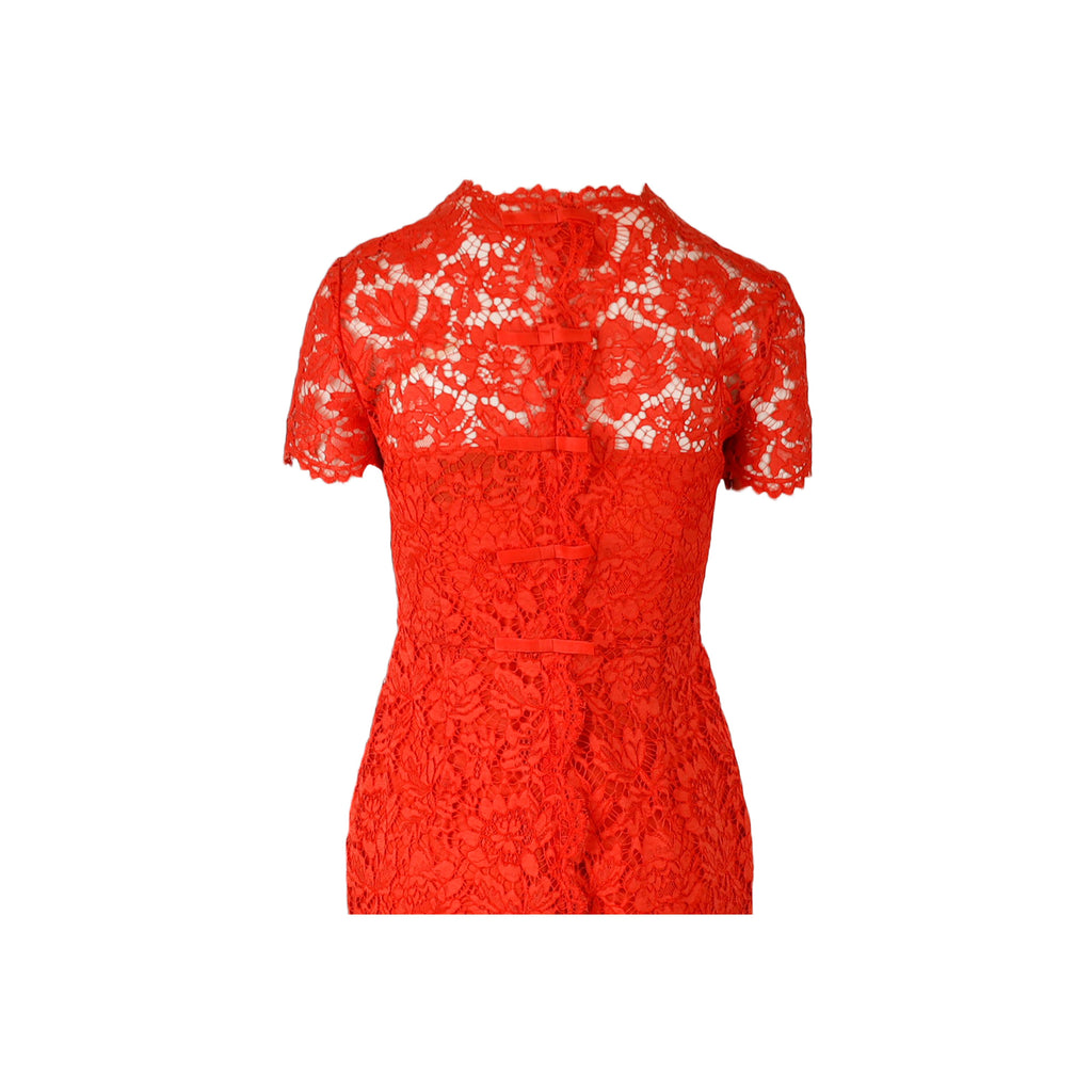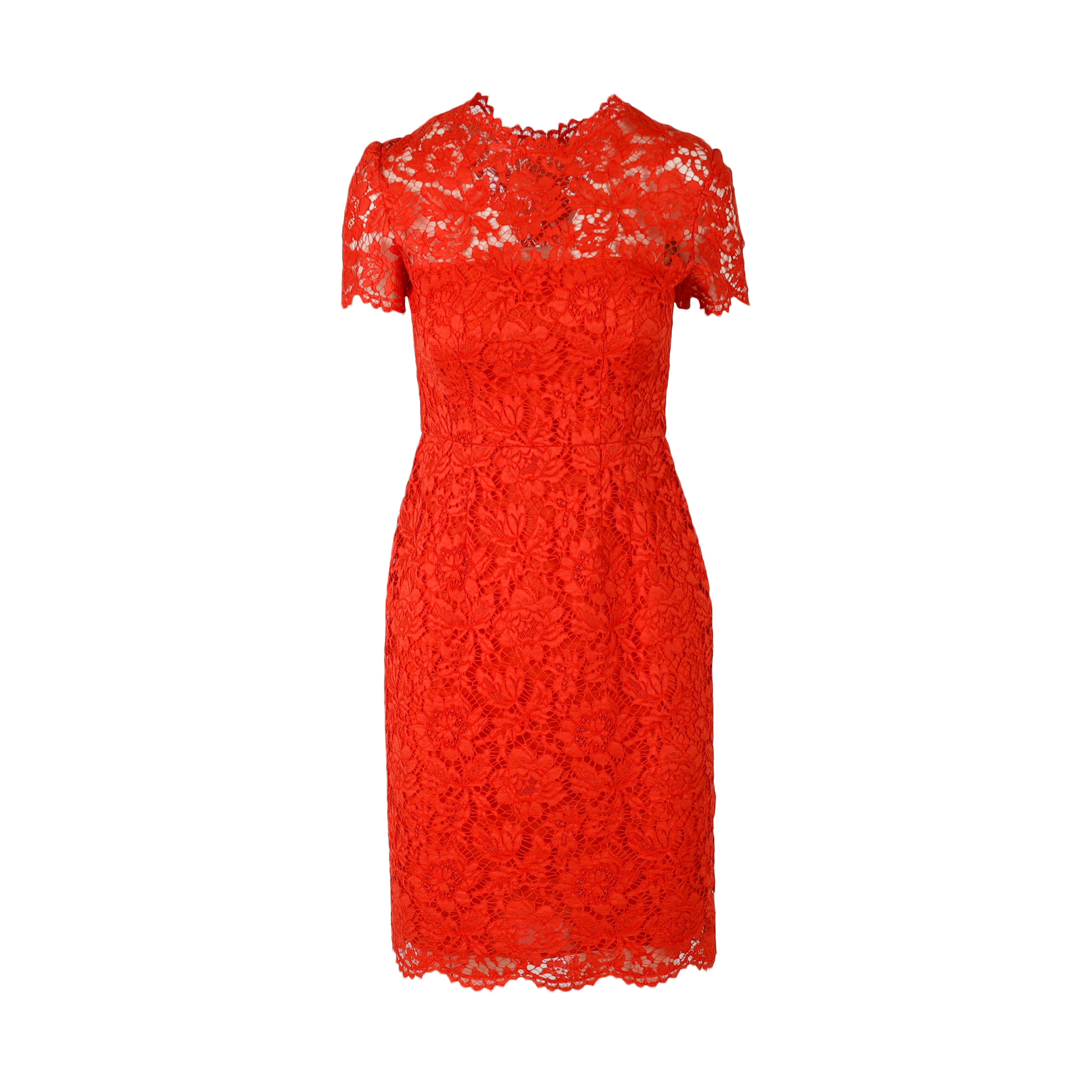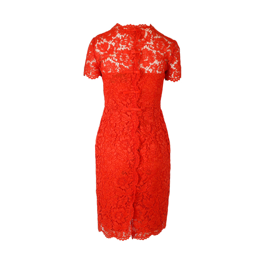 This Valentino Lace Midi Dress offers a slim contour and delicate embroidery for a classic, flattering look. Boasting short sleeves and a lined interior, this dress is further detailed by bows on the back closure and a small slit at the hem.