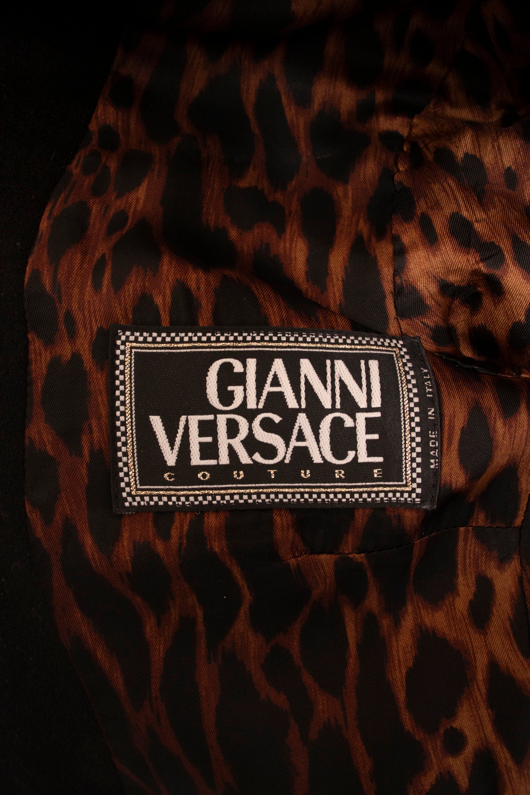 This stunning Versace Couture piece combines luxury materials with iconic design elements. Crafted from premium cashmere with Persian lamb fur accents at the collar and cuffs, it features three signature Medusa head gold buttons that exemplify the brand's distinctive aesthetic. The interior is finished with silk animal print lining.