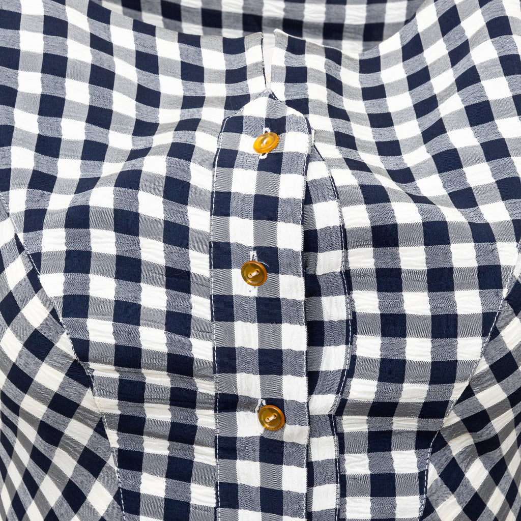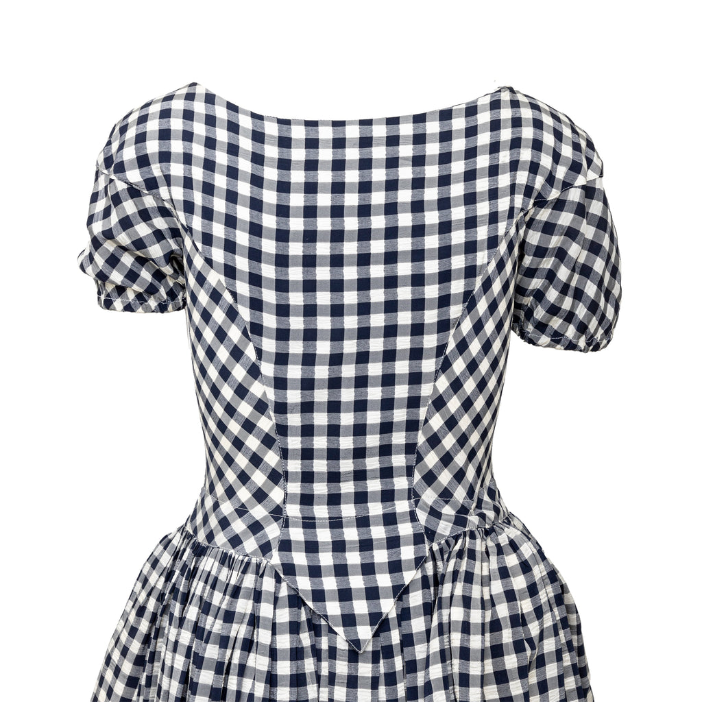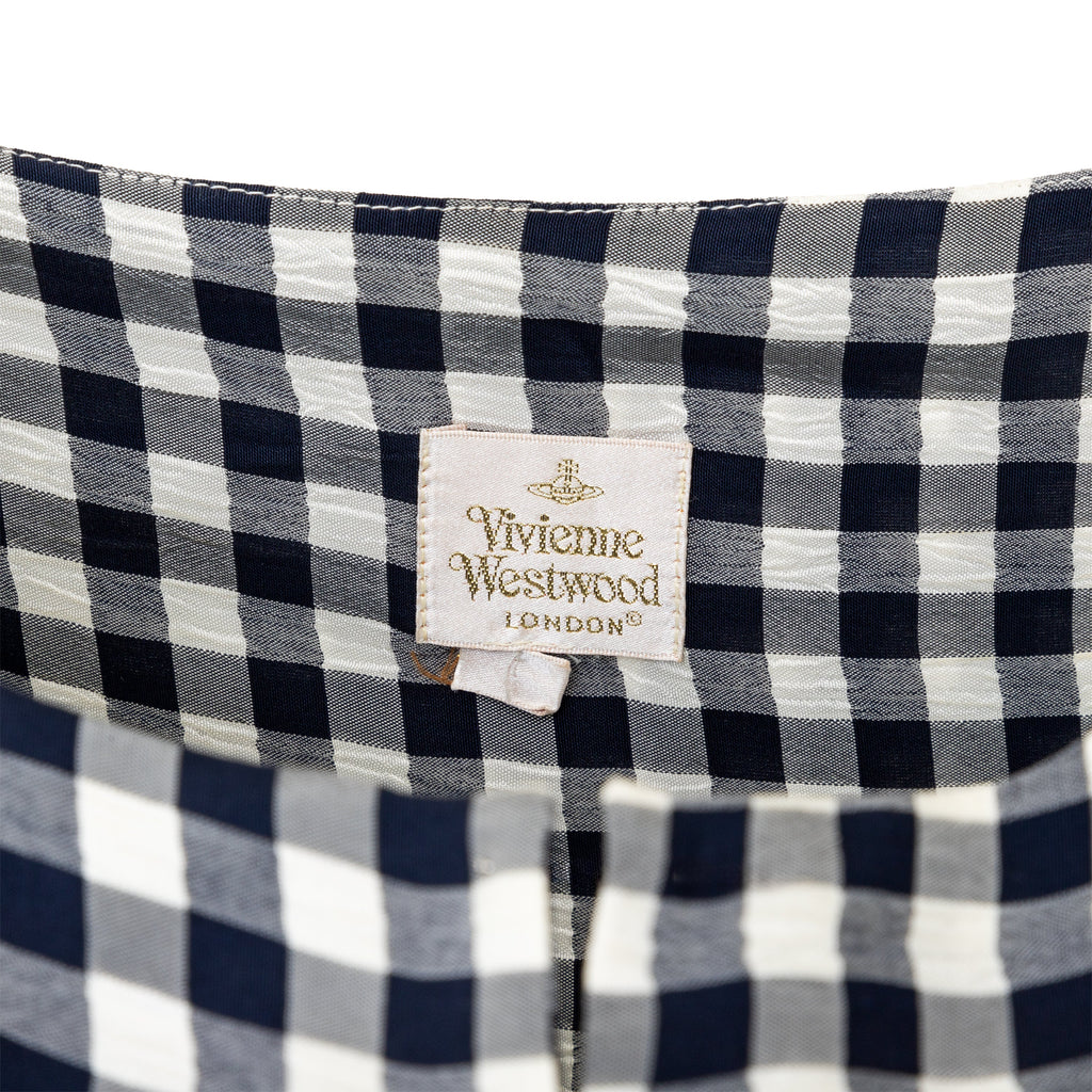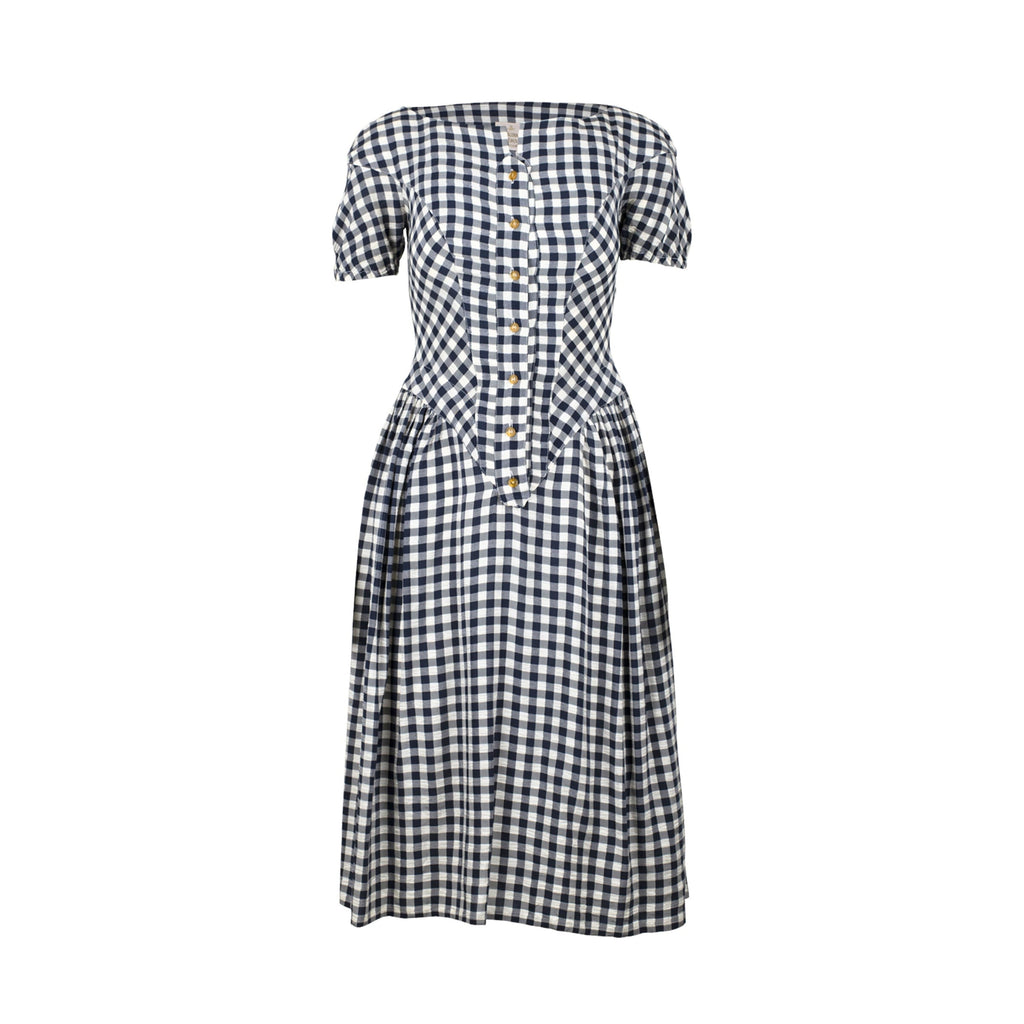 A classic from the 2000s that subtly highlights the feminine silhouette, this Vivienne Westwood Checkered Midi Dress showcases a plaid design with a tight-fitting corset-like top and a flowy bottom. It is a perfect fit for picnics and other summer activities.