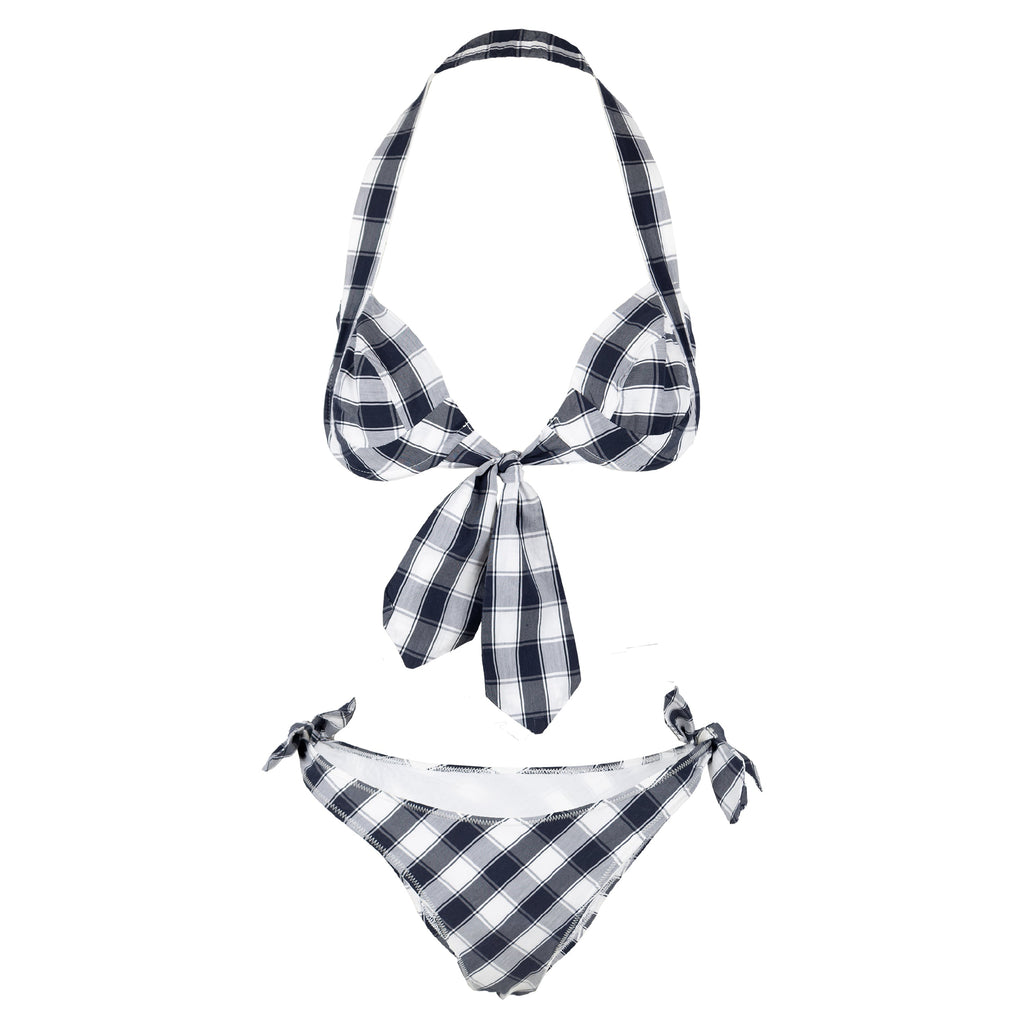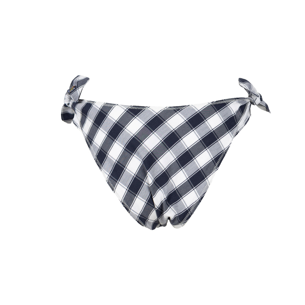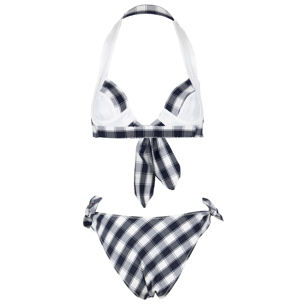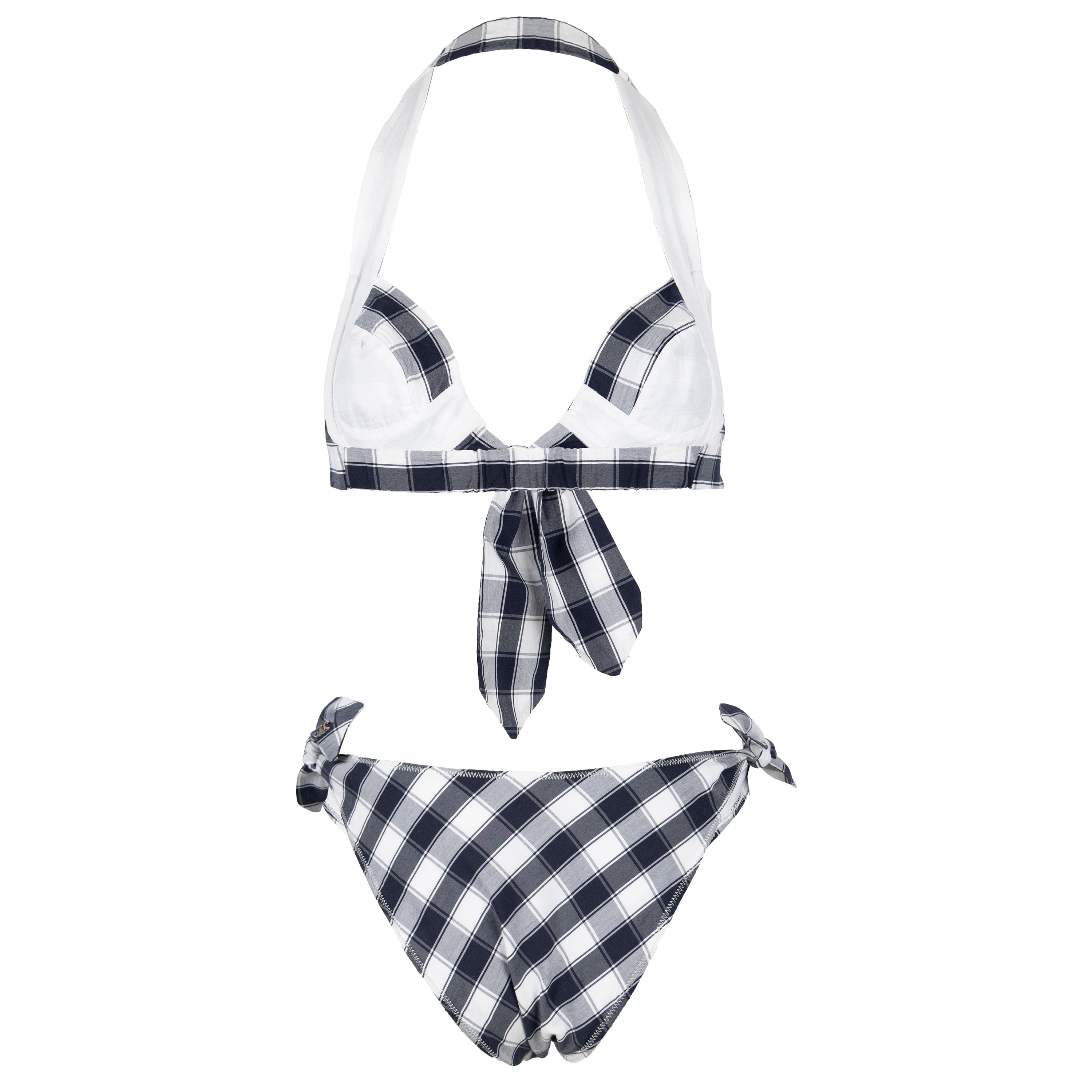 This Vivienne Westwood Red Label two-piece swimwear features black and white checkered pattern, a signature of Vivienne Westwood's design aesthetic. The tie knots, which are located at the sides and front of the swimsuit, add a touch of whimsy and can be easily adjusted to the fit the wearer.