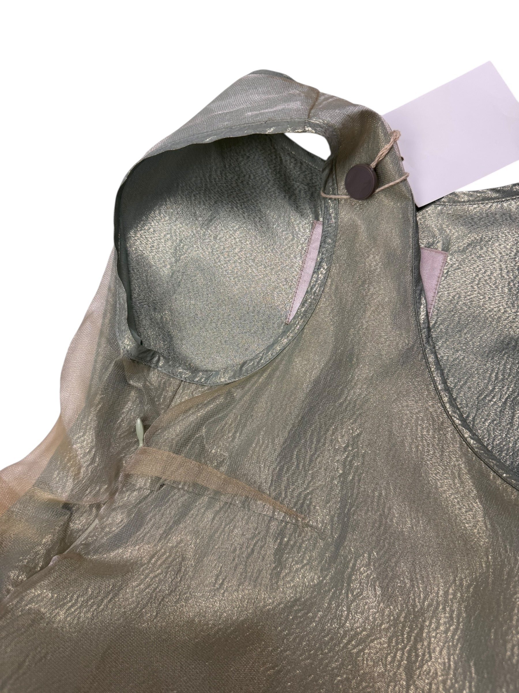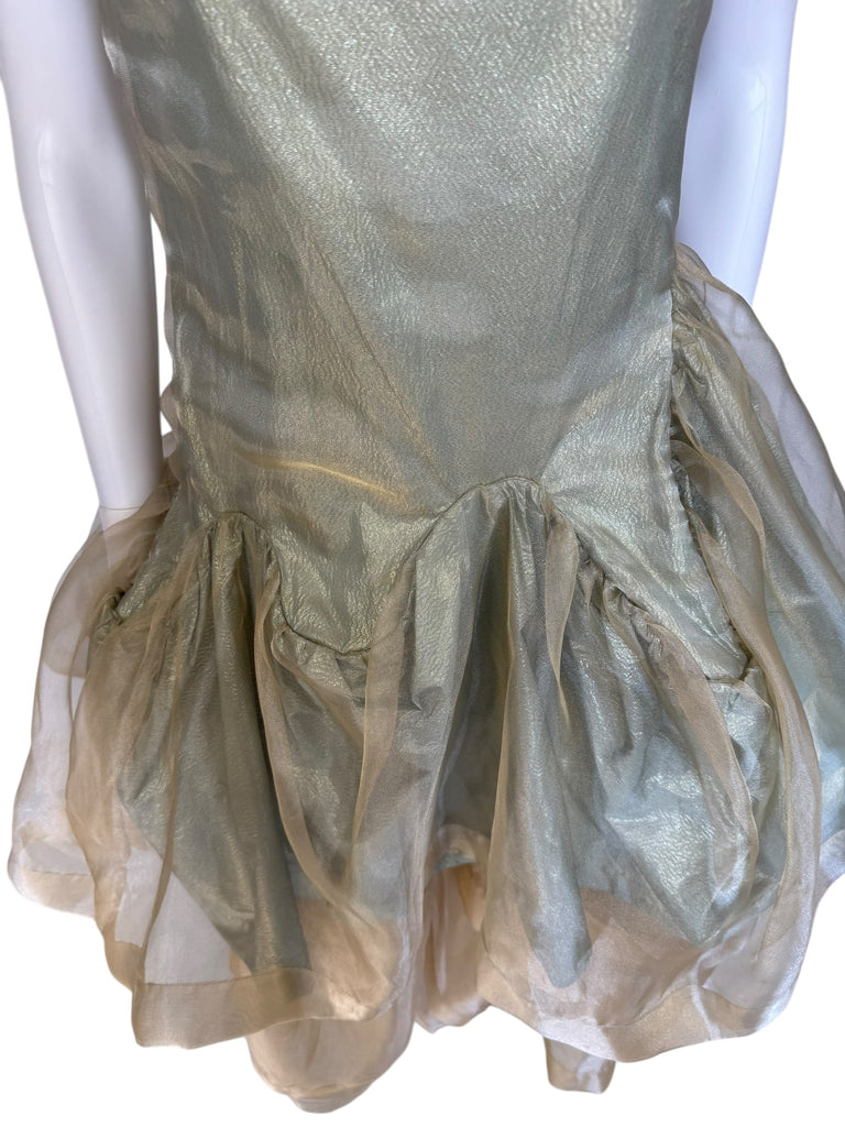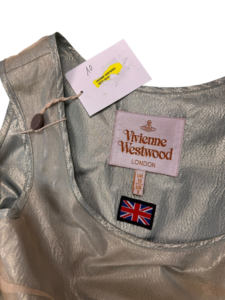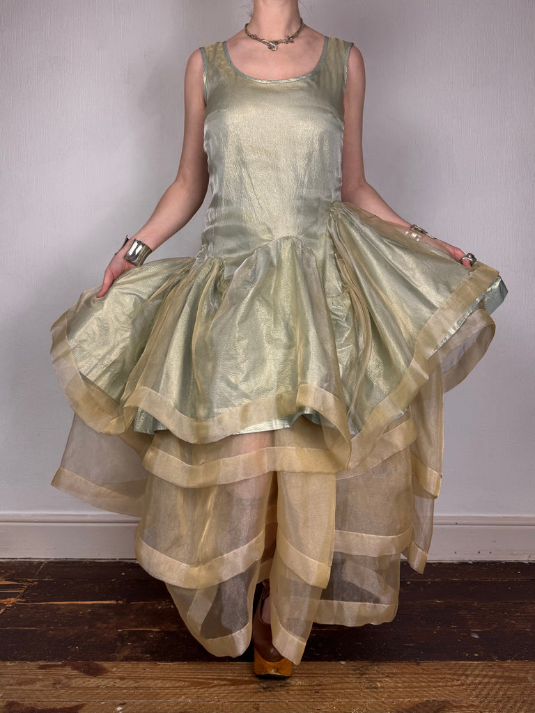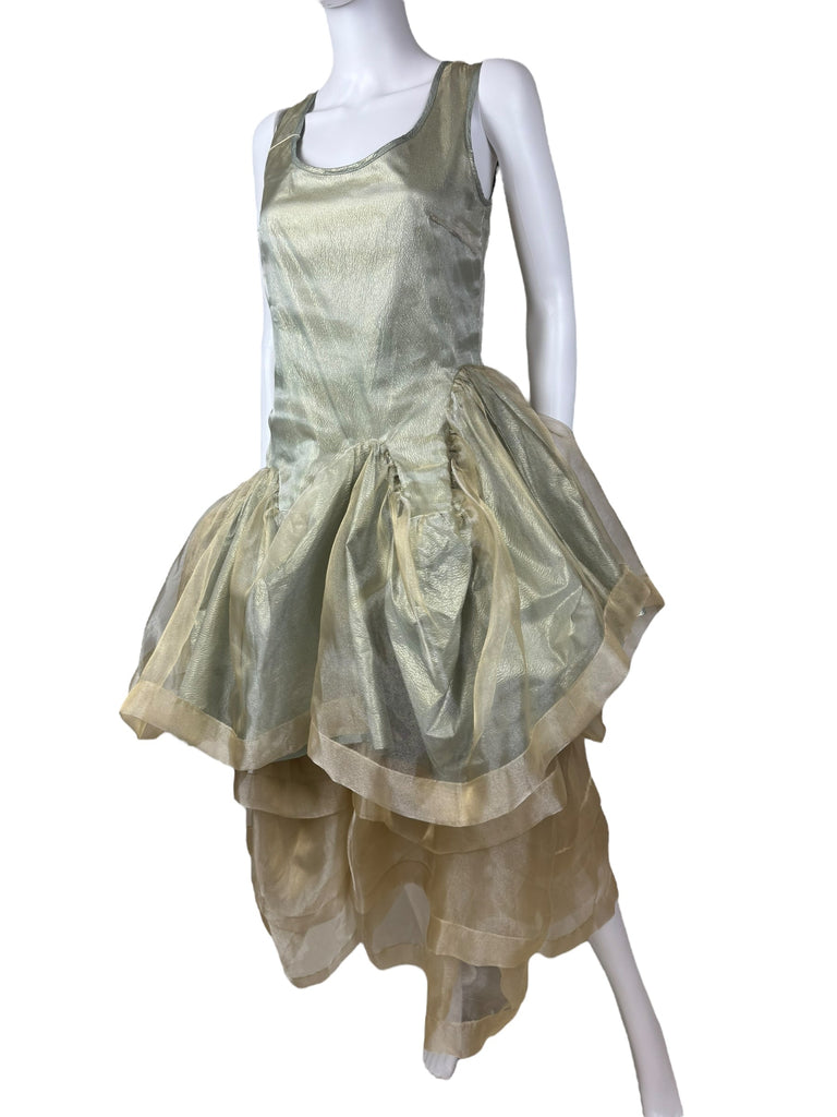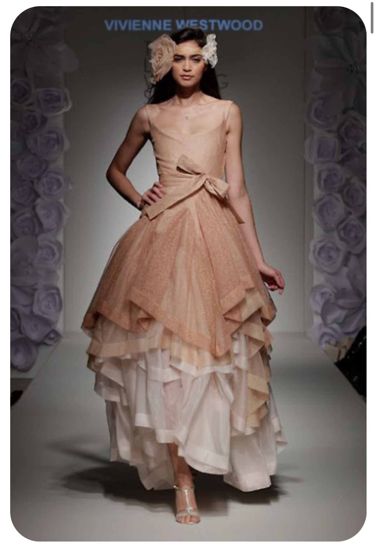 Exquisite Vivienne Westwood Demi-Couture Gold Label dress with lamé green foil base and gold fine organza top layer. The layered skirt section has loosely structured panels, creating a voluptuous silhouette. This dress first appeared in the F/W 2010 Gold Label collection and was worn by Sarah Jessica-Parker to the Tokyo premiere of Sex and the City 2 earlier in the year. A corseted bridal version of this dress was released in the Autumn 2011 Luxury Wedding Show Catwalk at The Saatchi Gallery, London. The dress was then released in a peach and a black colourway for The Queen’s Diamond Jubilee capsule collection in 2012, and some of the gowns from this small 9-piece collection featured on the F/W 2012 runway collection titled ‘The Red Carpet Capsule Collection’. Vivienne Westwood muse and Queen of Gothica, Helena Bonham-Carter, wore the black corseted version to the 2013 Oscars. Rita Ora wore the peach gold corseted version more recently in her 2017 ‘Anywhere’ music video. And this dress has been reimagined once again for the latest 2026 Bridal collection in a corset and skirt version very similar to the F/W 2010 ‘Sarah Jessica-Parker’ one, with a slightly different Pierre Joseph Redouté-inspired rose print, as seen on actress Vicky Krieps. UK10. All details below👇