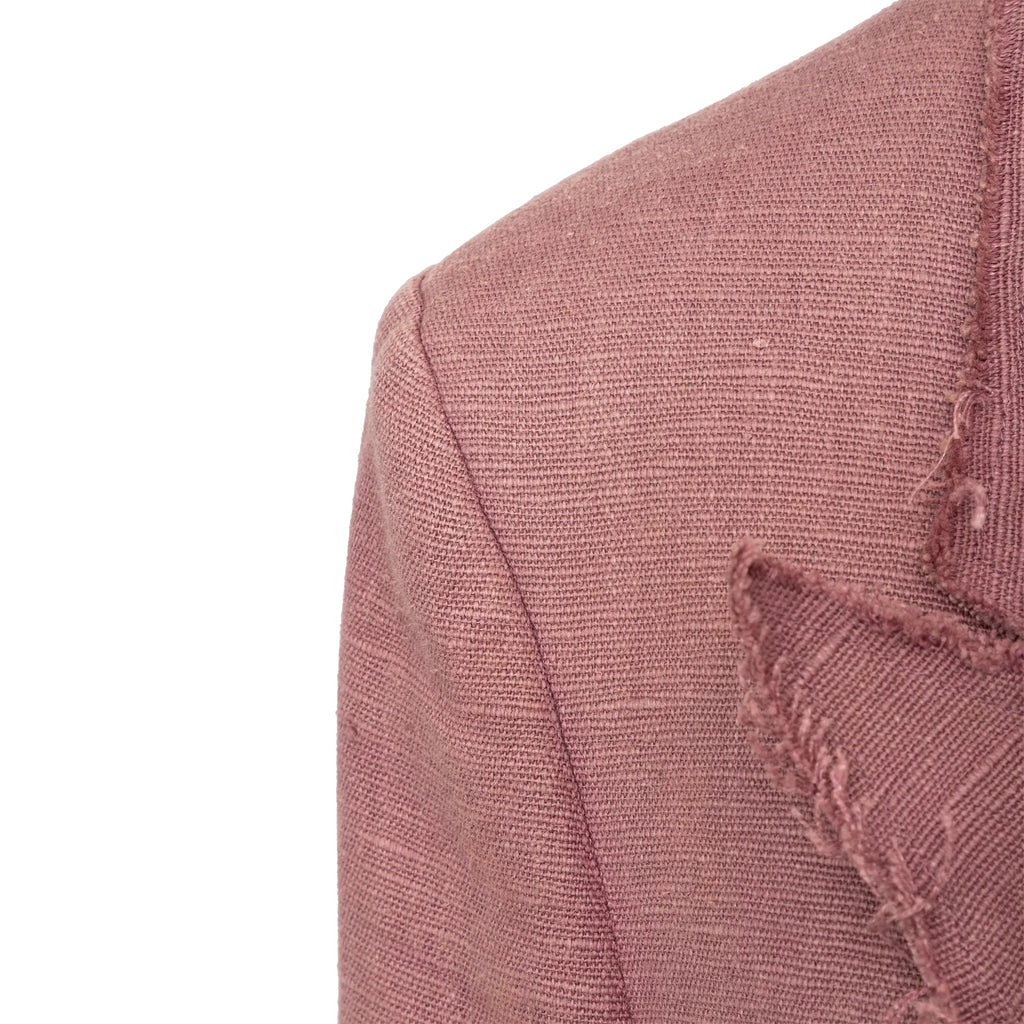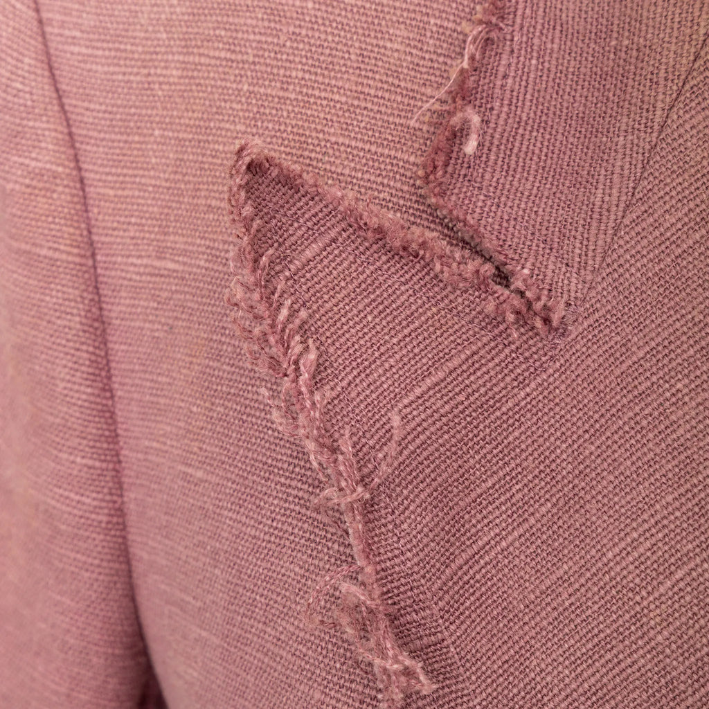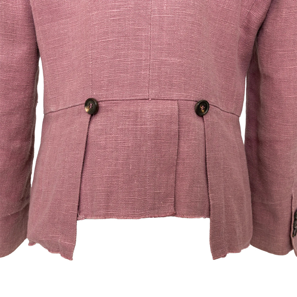 Vivienne Westwood Frock Coat in hemp canvas fabric. Cropped, raw-edged design with peak lapels and vented waist. Eco-conscious and sharp tailoring.