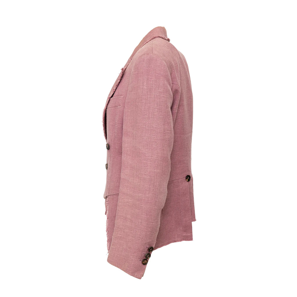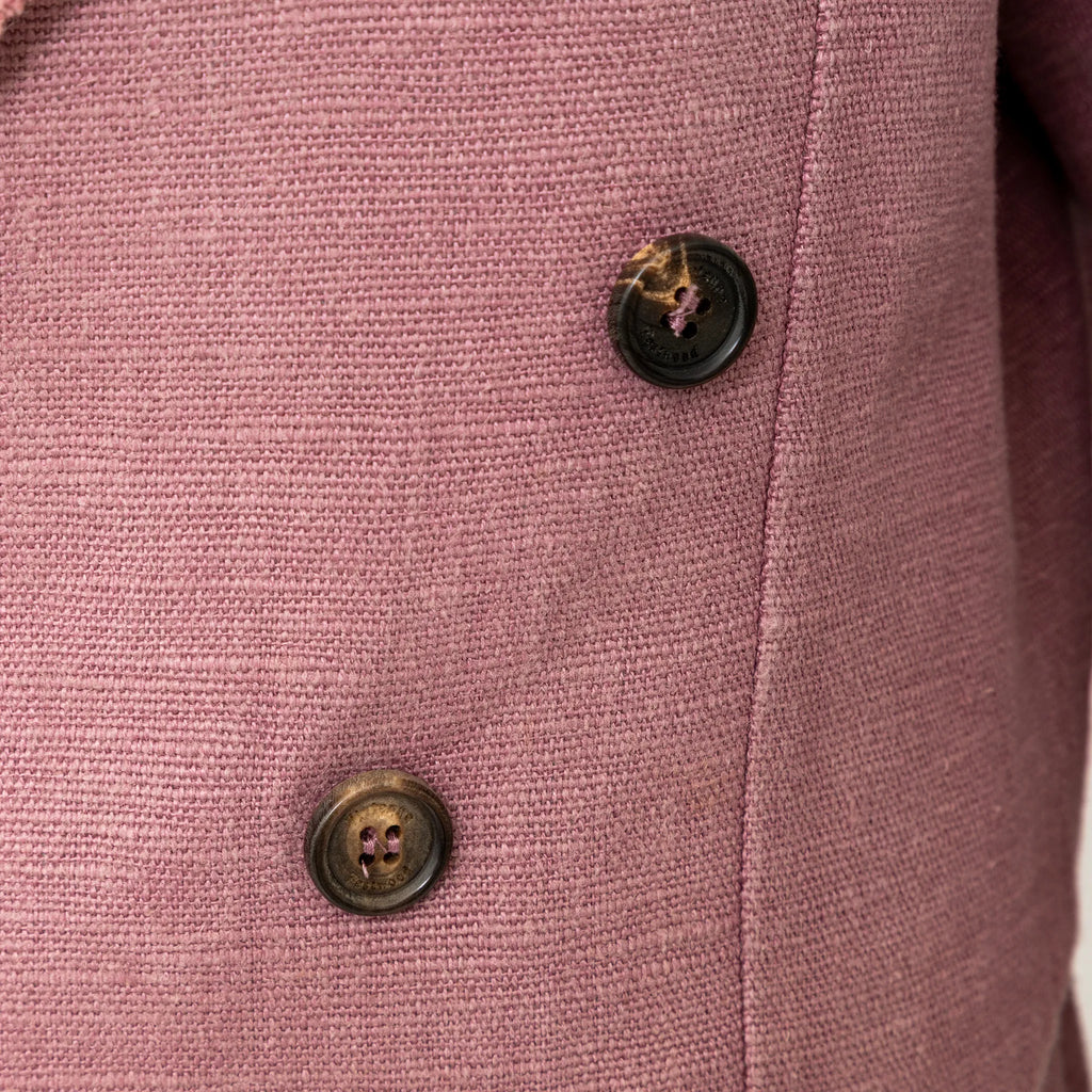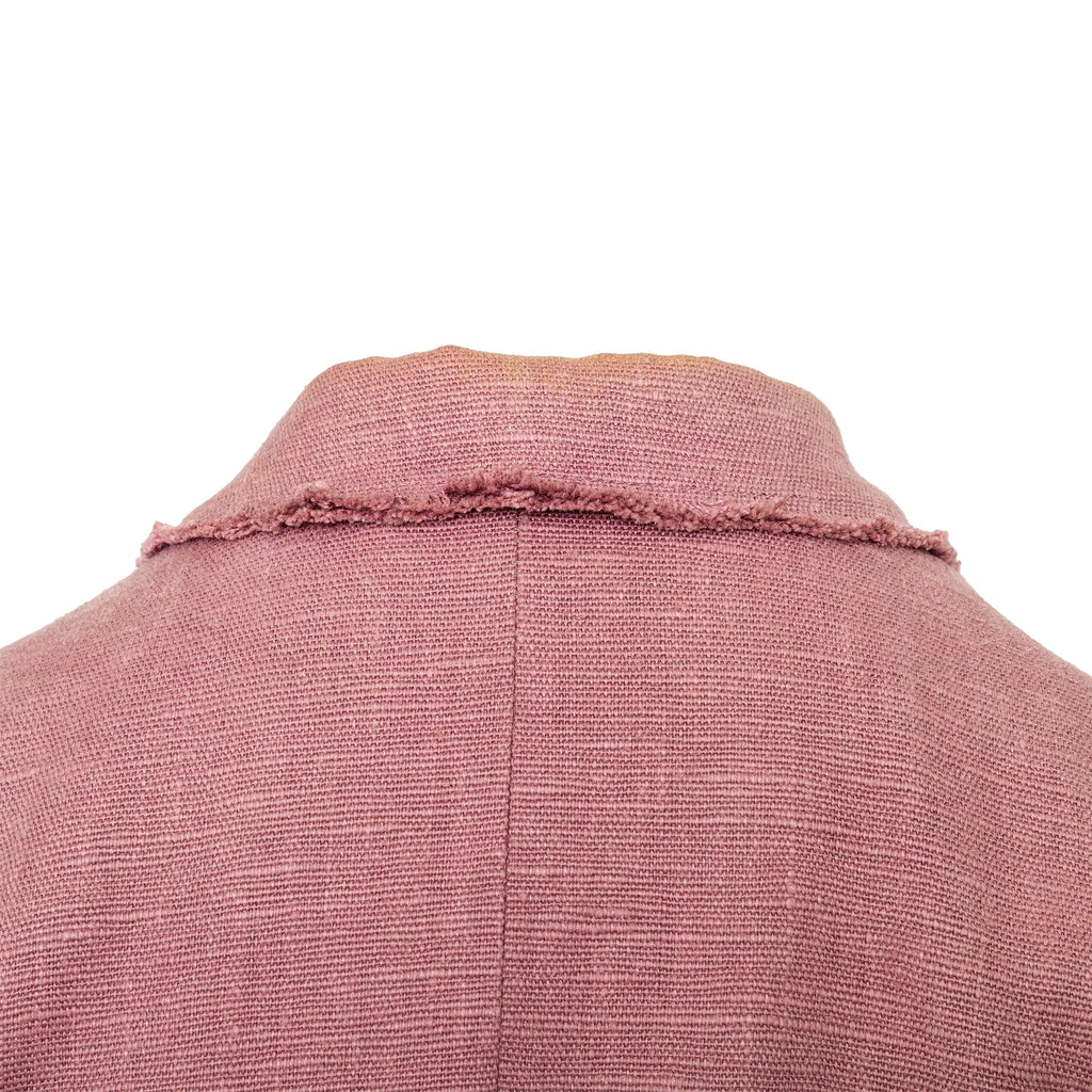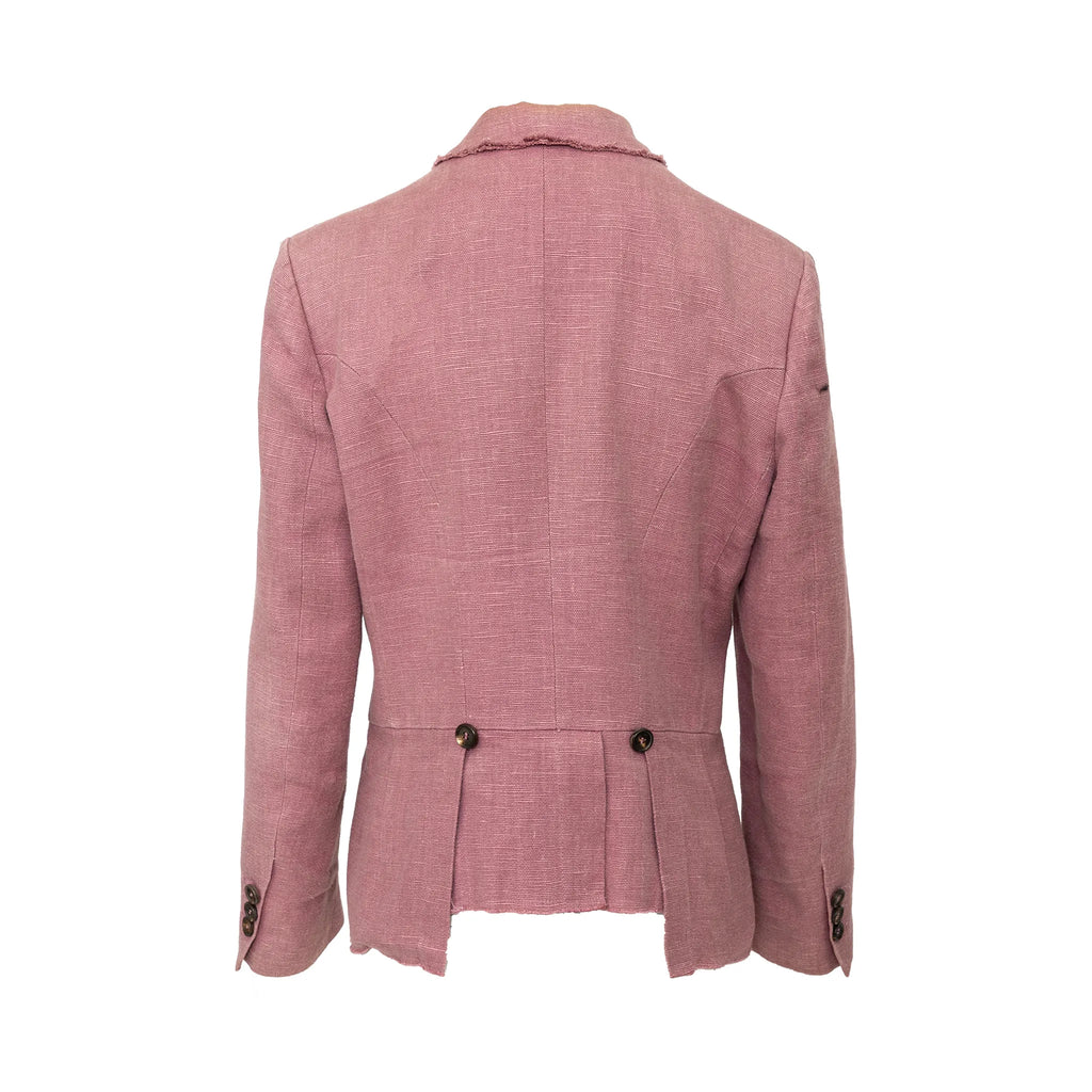 Vivienne Westwood Frock Coat in hemp canvas fabric. Cropped, raw-edged design with peak lapels and vented waist. Eco-conscious and sharp tailoring.