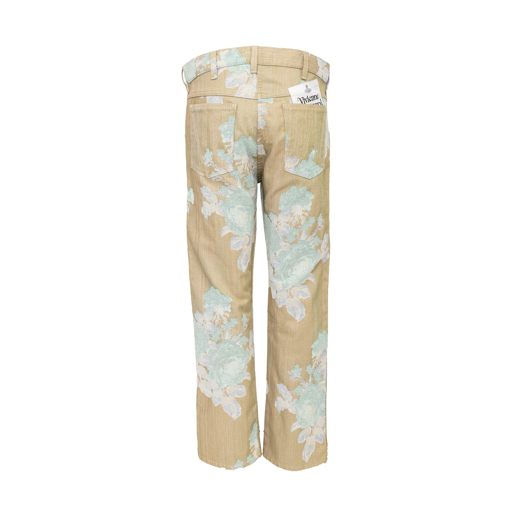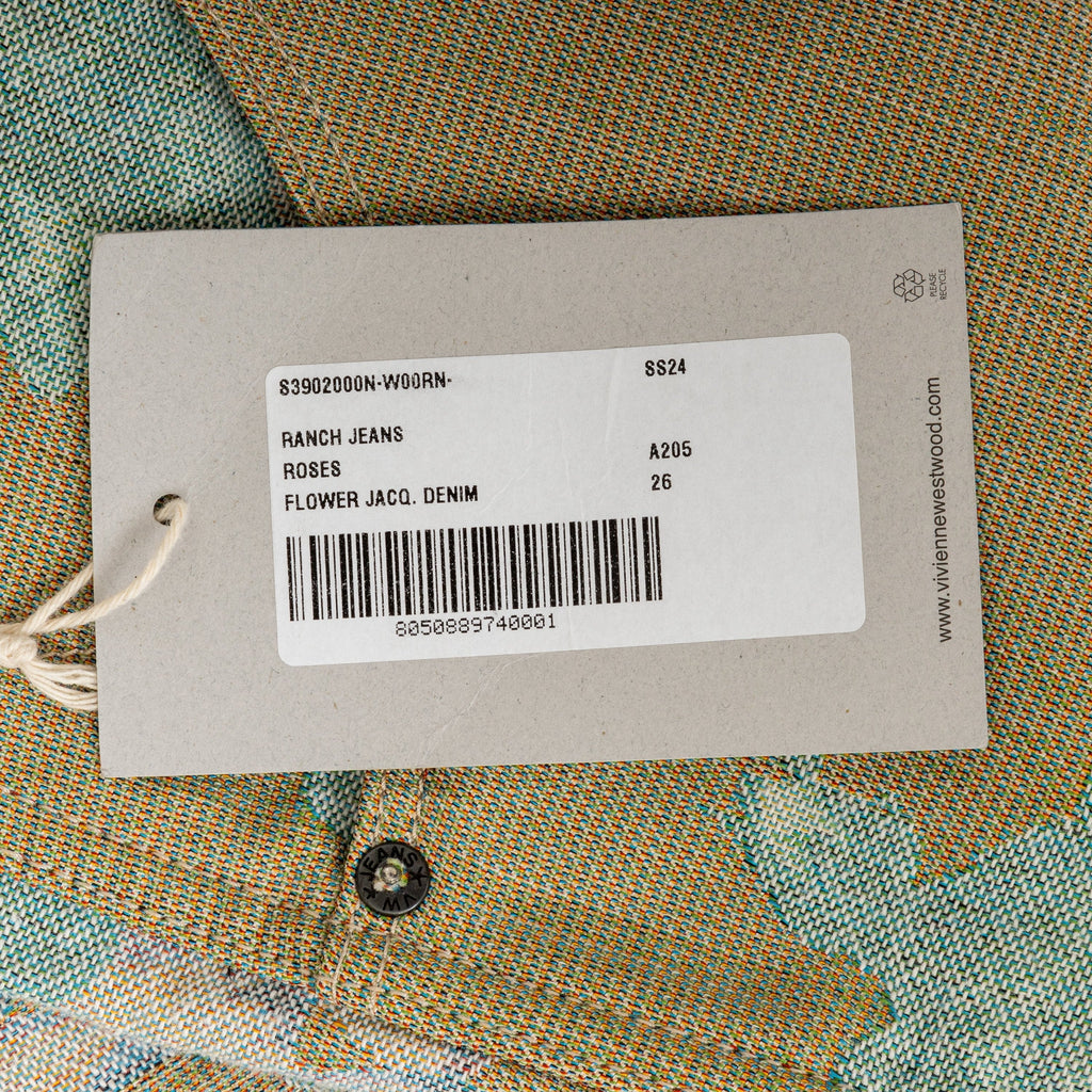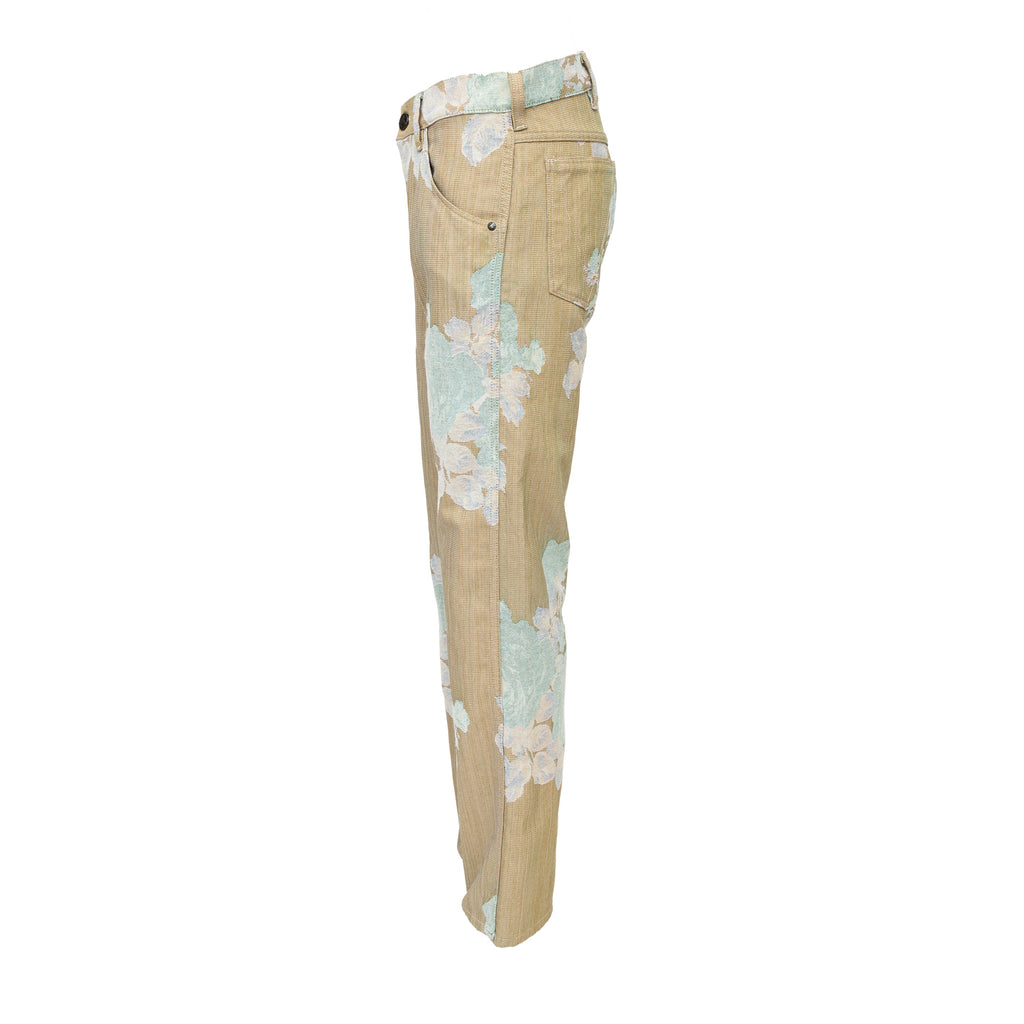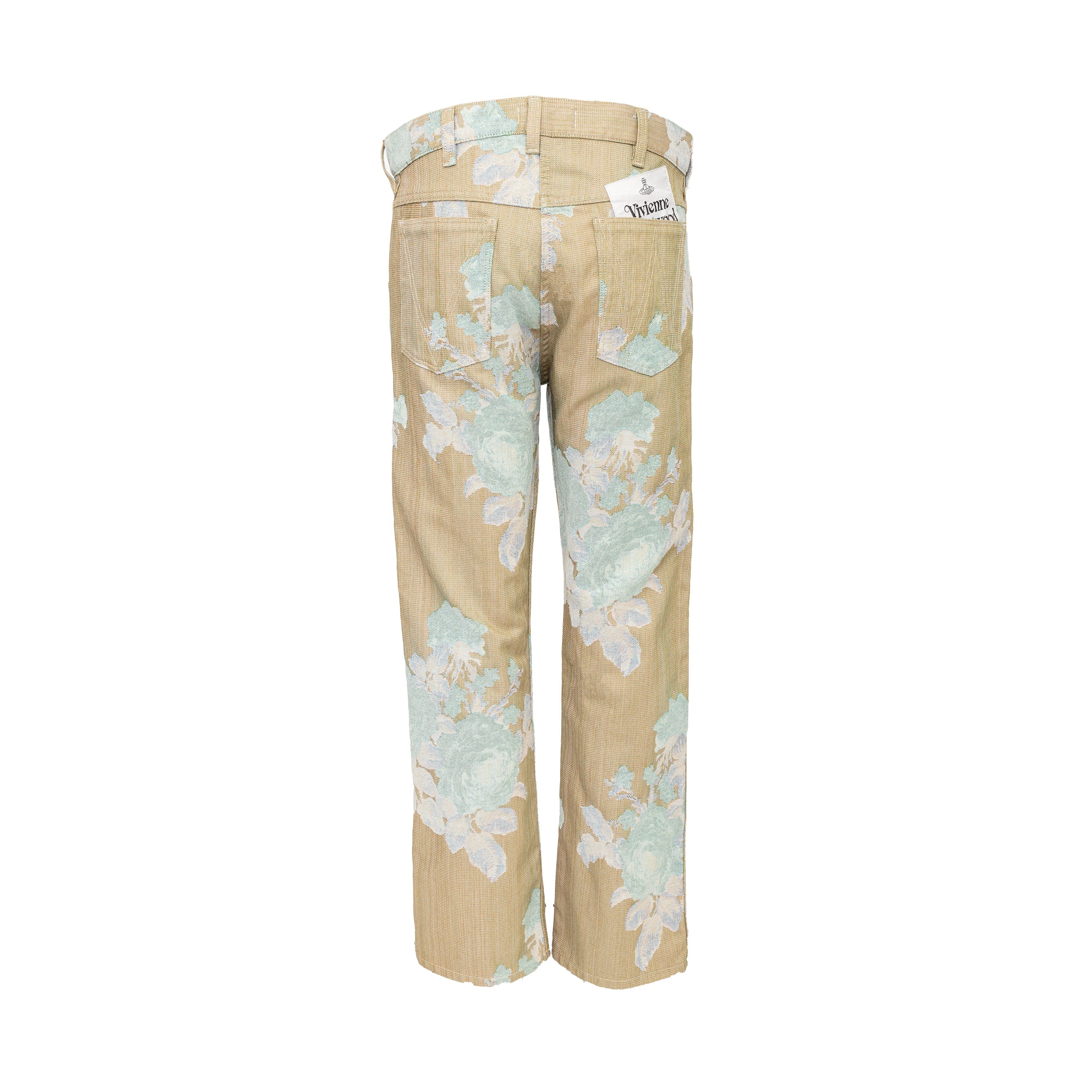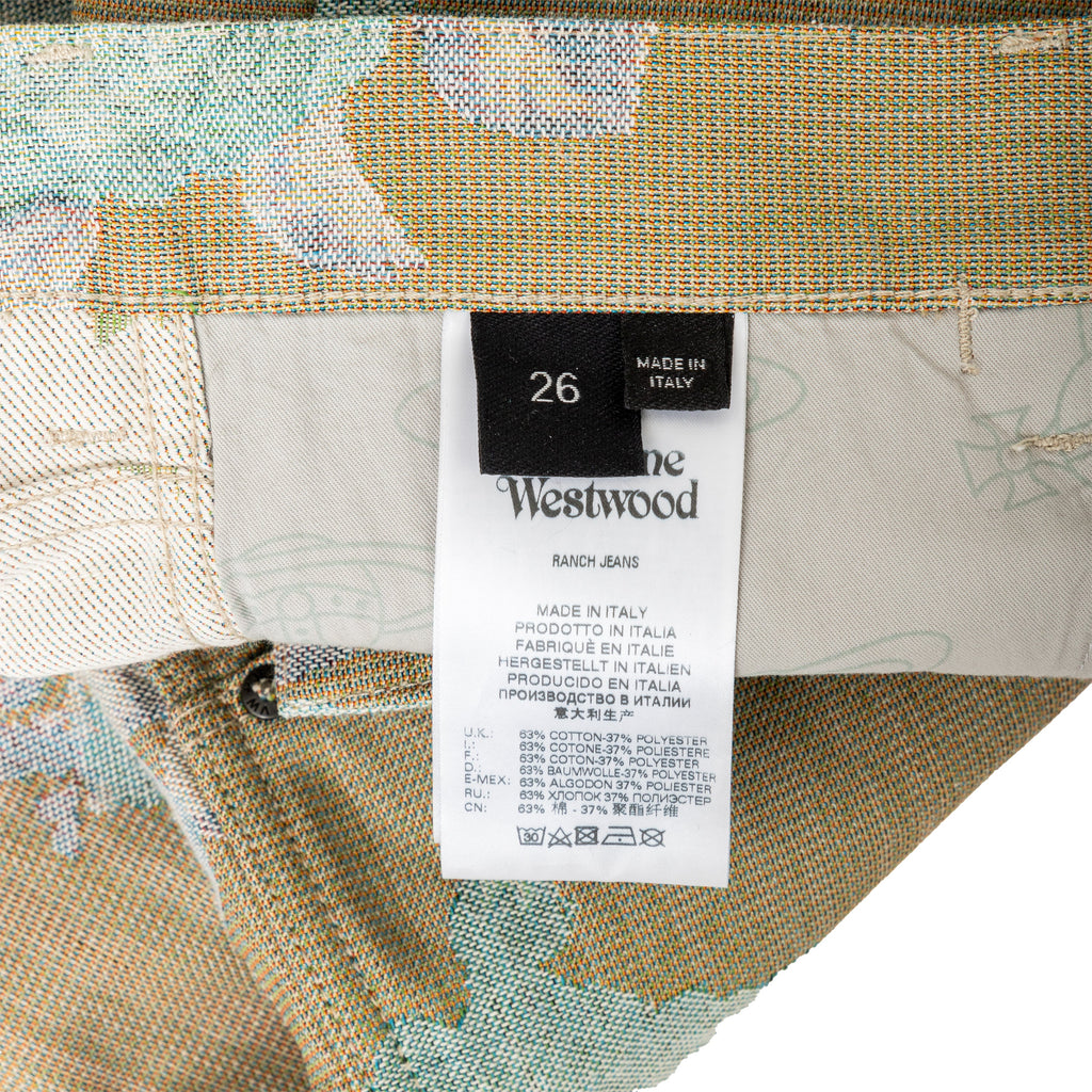 These Vivienne Westwood Ranch Jeans are made of high-quality cotton blend denim with a unique floral jacquard pattern. The mid low waist and straight cut create a comfortable and flattering fit. The back application features the iconic Vivienne logo, adding a touch of luxury to these khaki beige jeans.