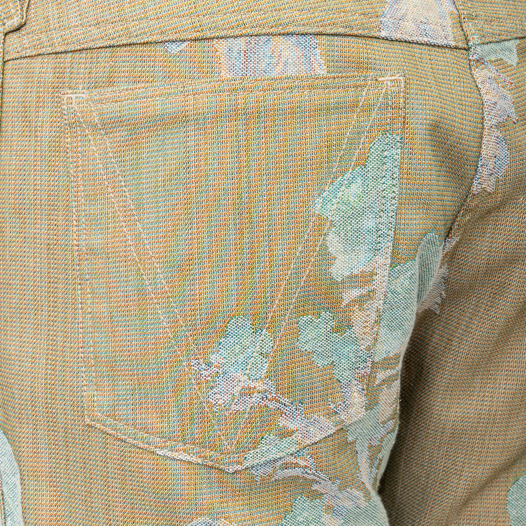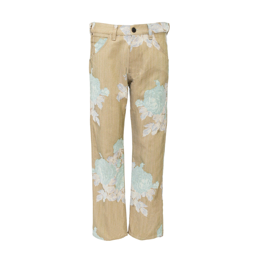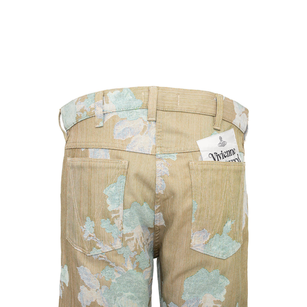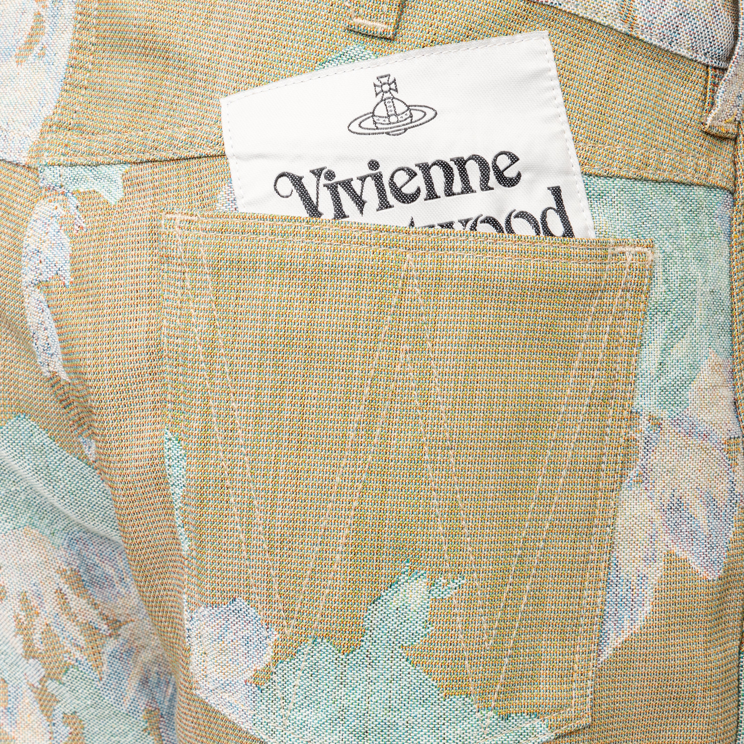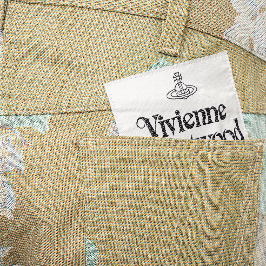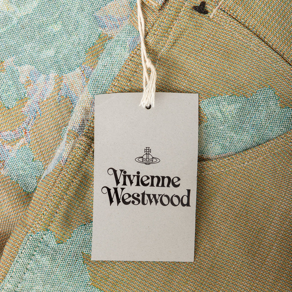 These Vivienne Westwood Ranch Jeans are made of high-quality cotton blend denim with a unique floral jacquard pattern. The mid low waist and straight cut create a comfortable and flattering fit. The back application features the iconic Vivienne logo, adding a touch of luxury to these khaki beige jeans.