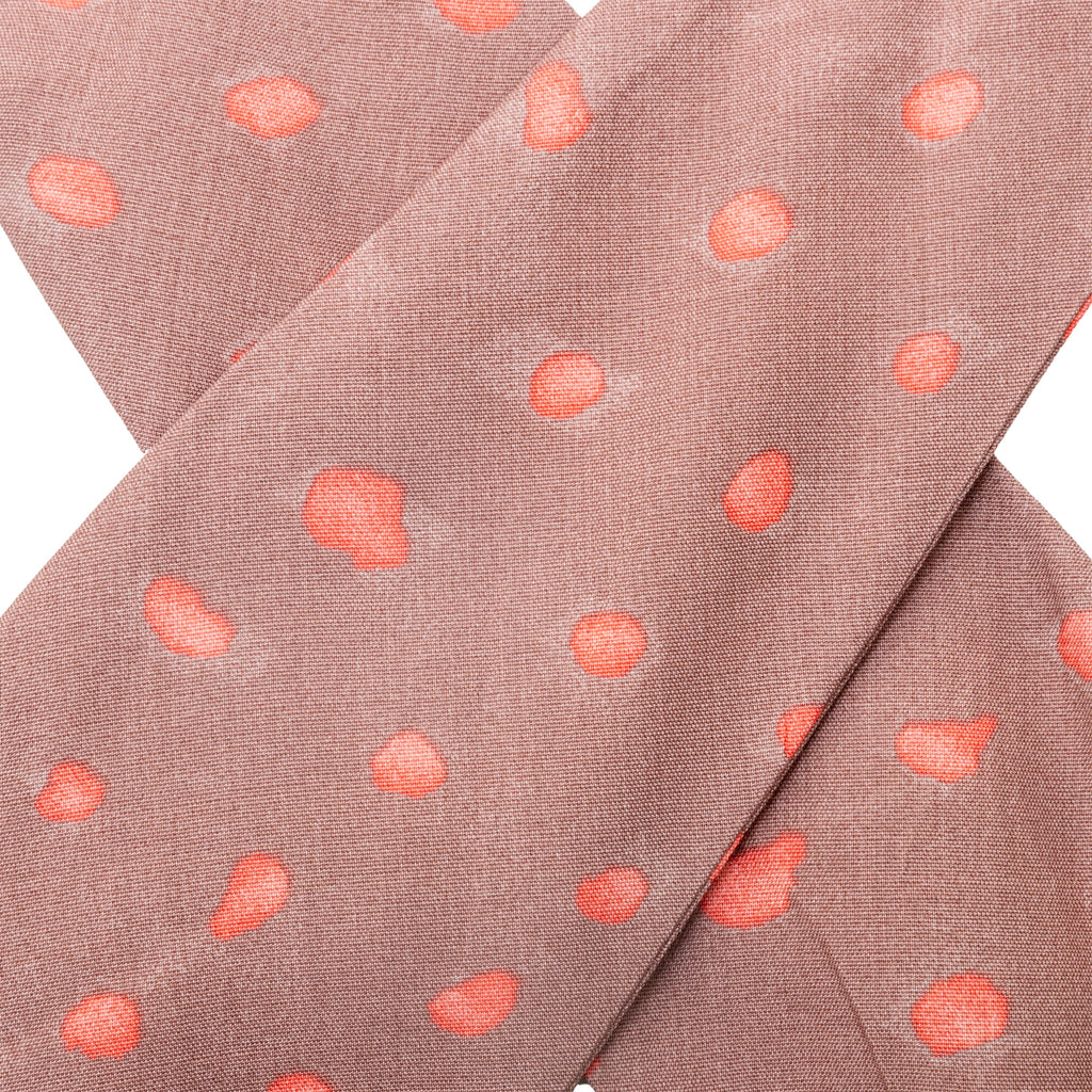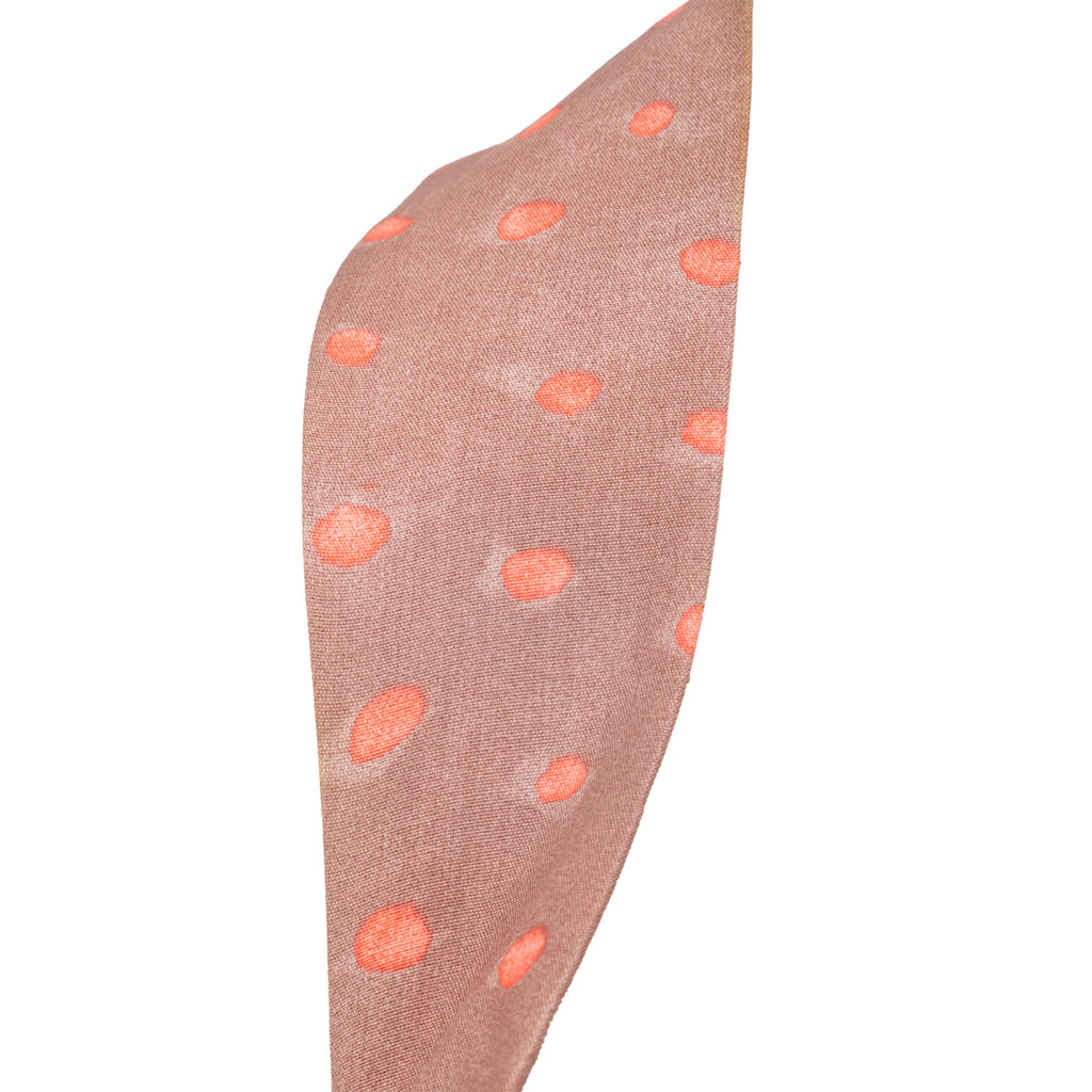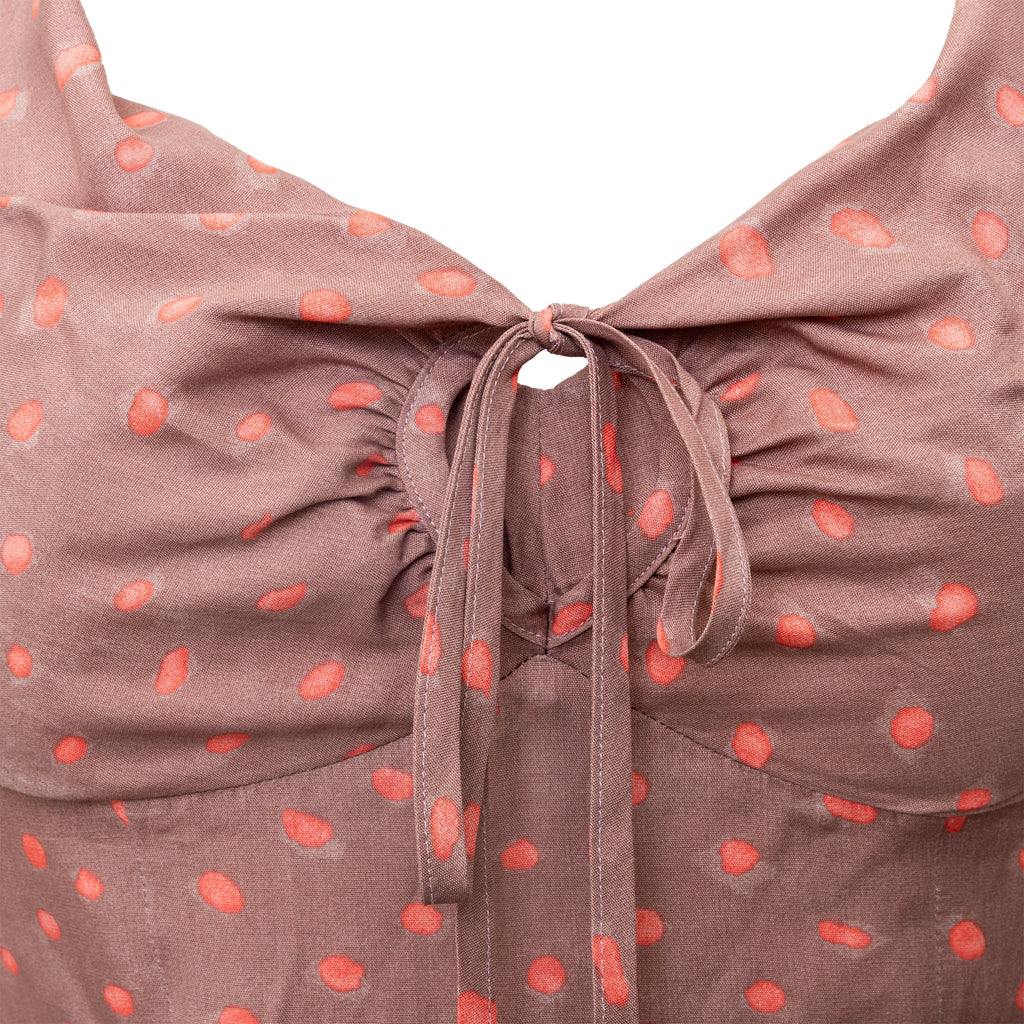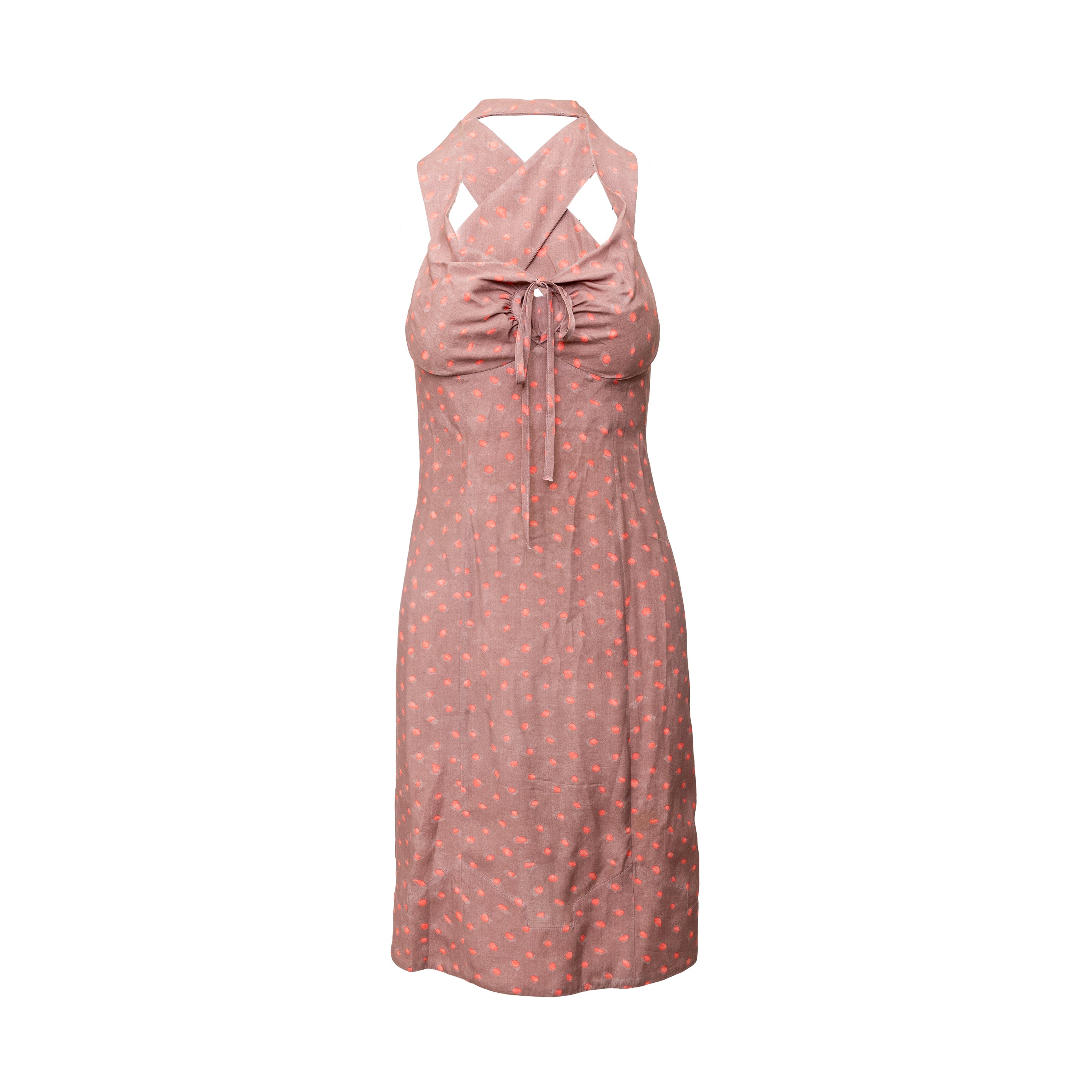 This Vivienne Westwood soft rayon dress from the iconic Red Label has a duo-tone polka dot pattern, cross-back design, tie-knot neckline, and ruches.