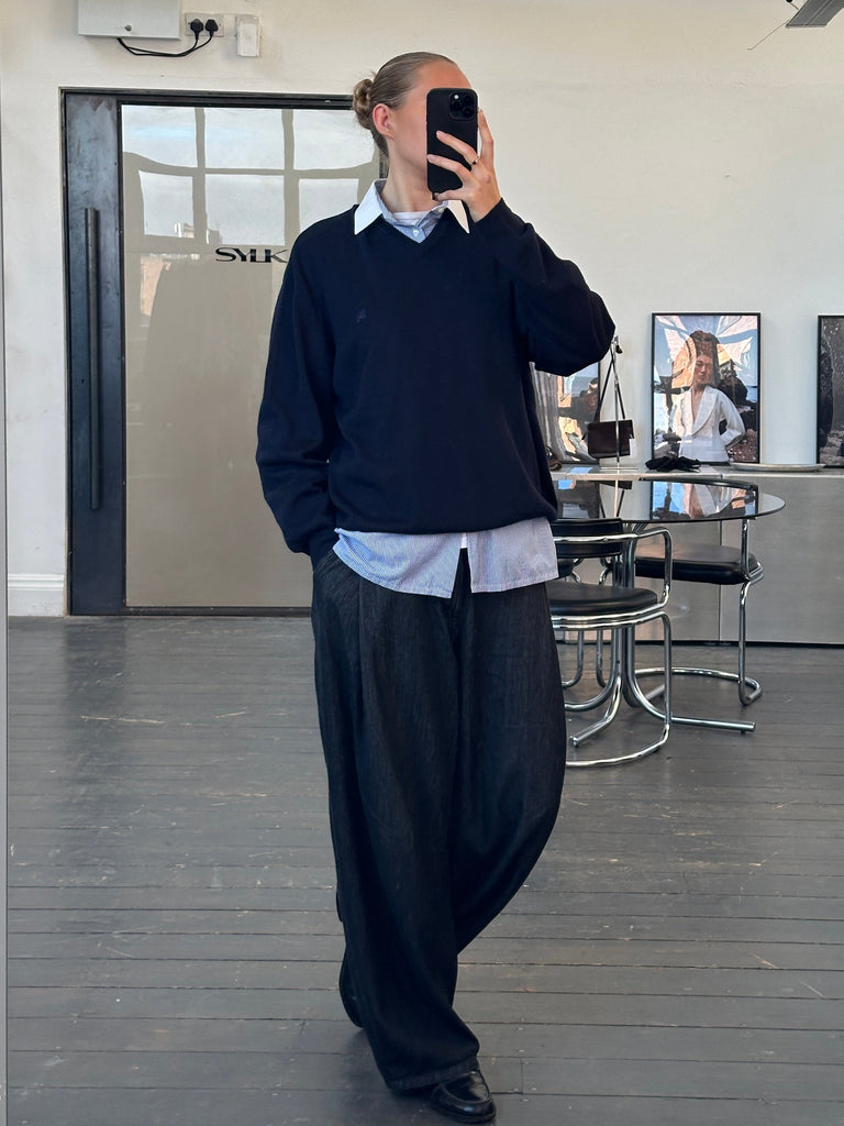 Vintage soft merino wool navy V neck jumper featuring the discreet tonal Equestrian Knight logo and classic Burberry London construction from the 2000s era.