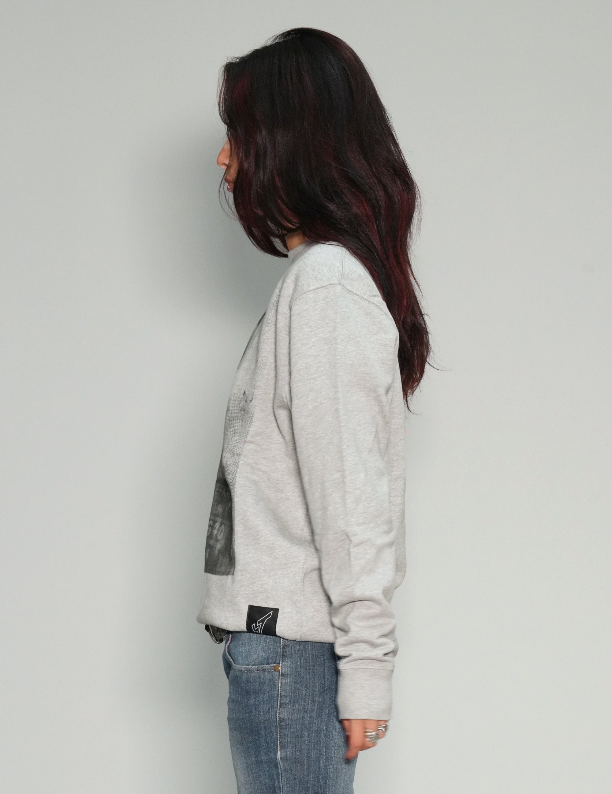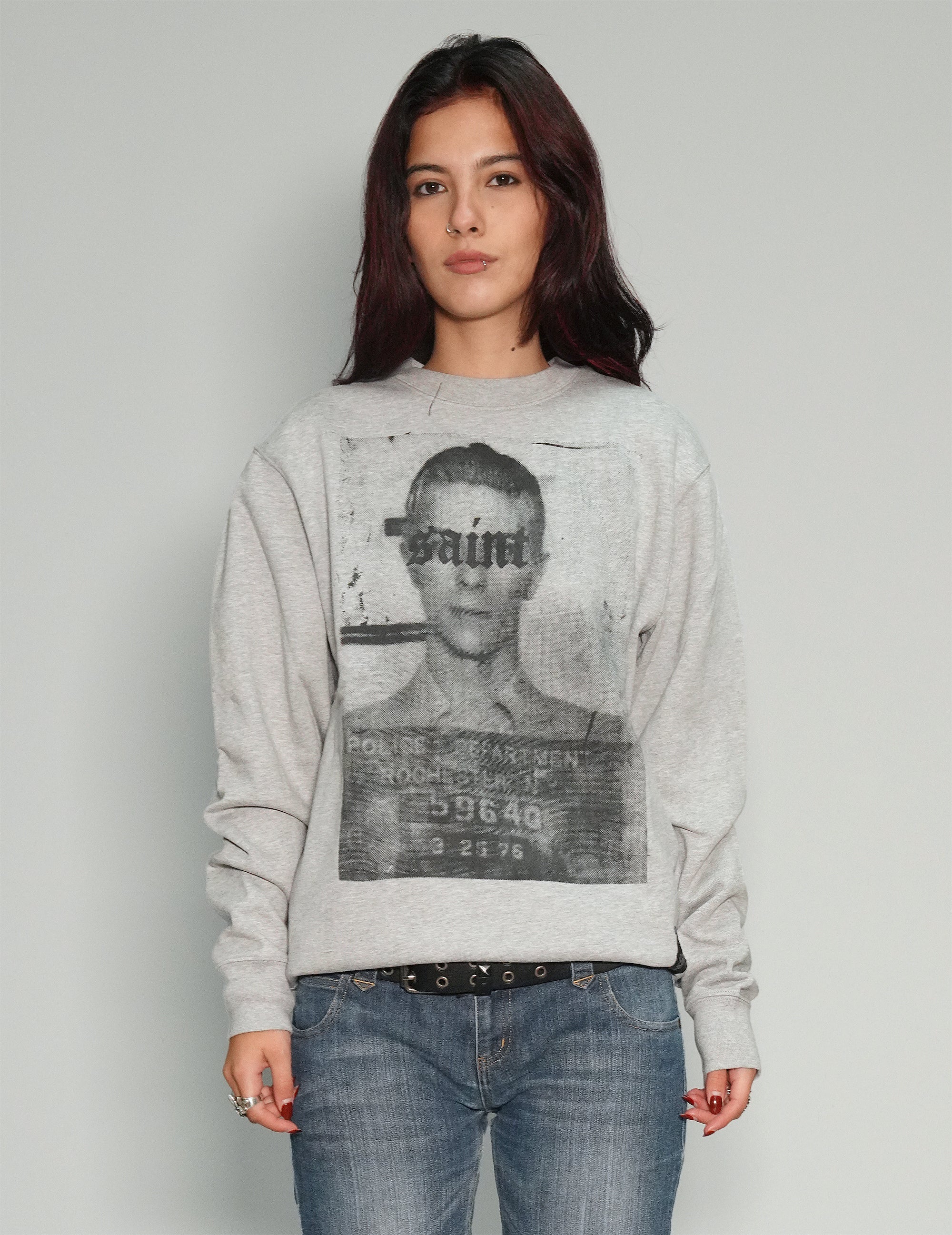 Women's grey sweatshirt crafted from 100% GOTS certified recycled cotton made from in-house organic cutting waste, features Bowie inspired mugshot print on the front,  1x1 rib at collar, hem and cuffs.