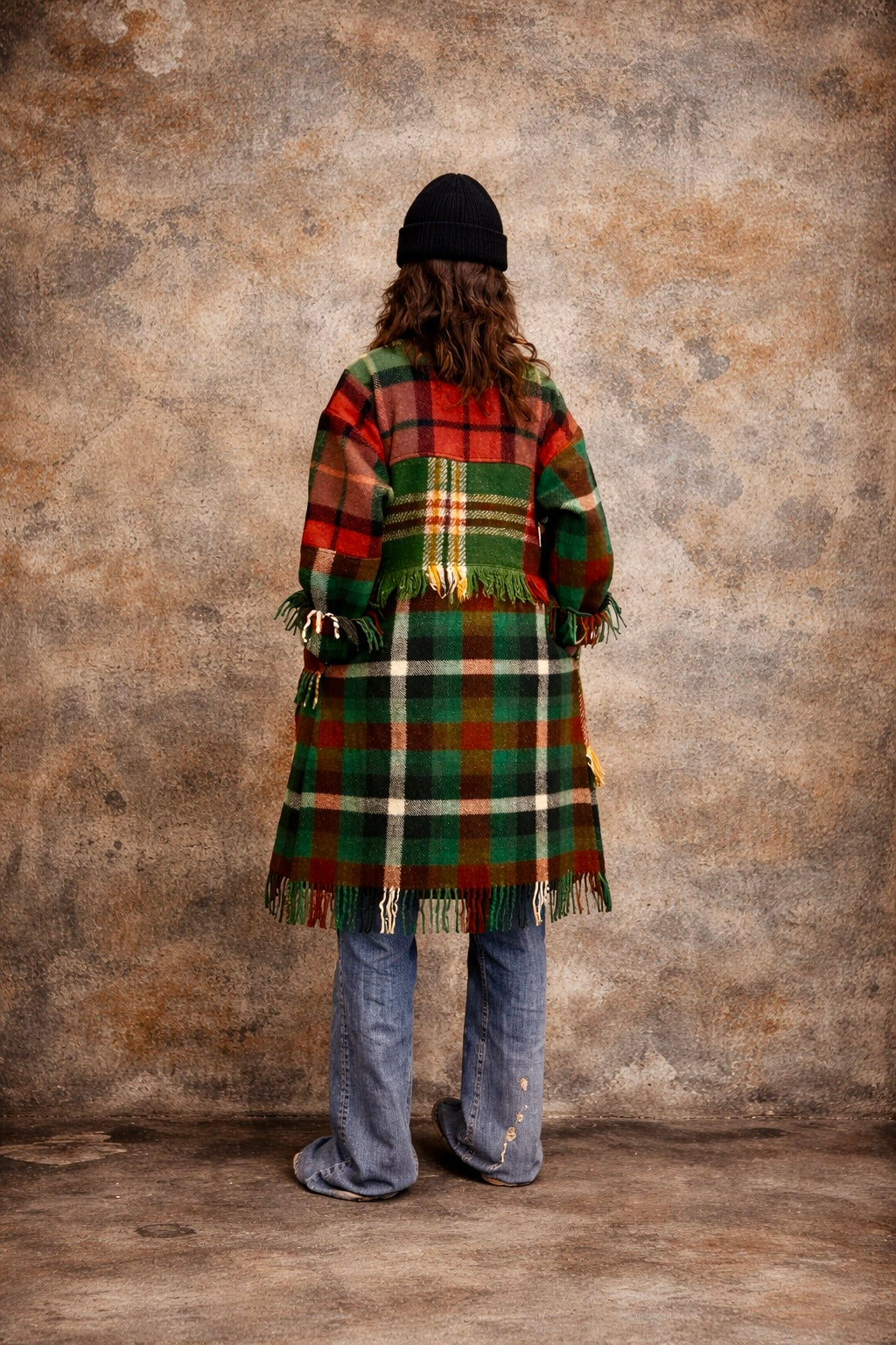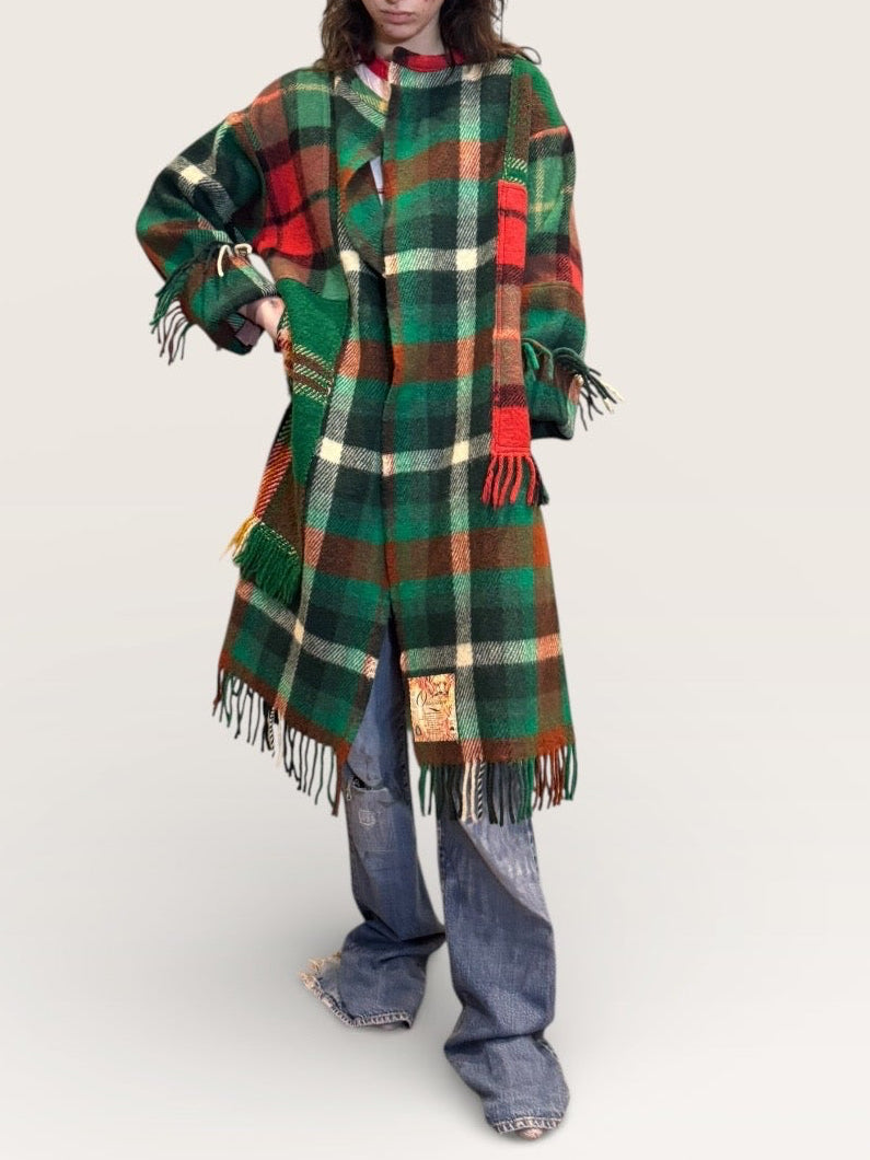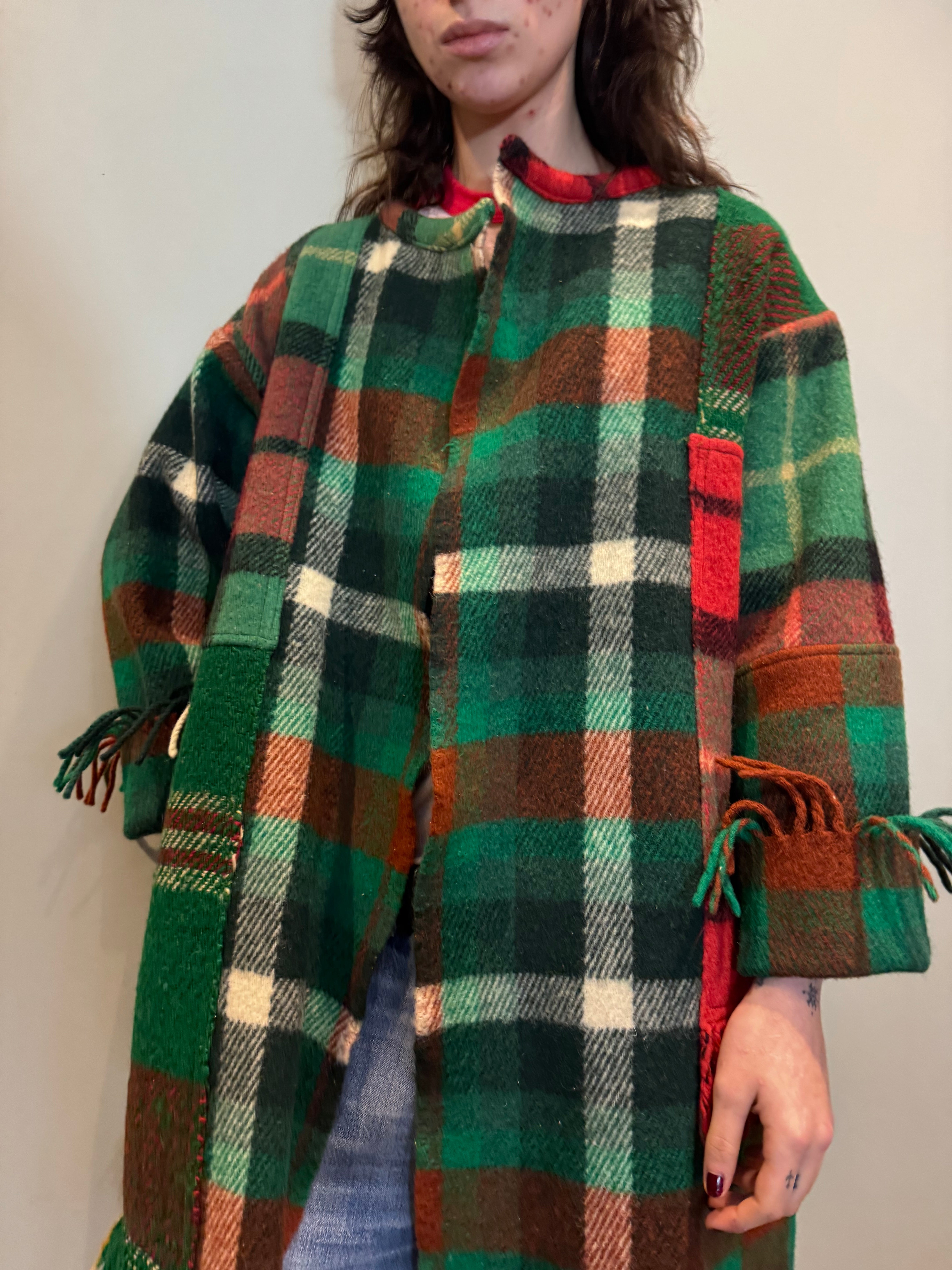 This one-of-a-kind 70s patchwork soft wool blanket coat is a true original. Featuring a unique mix of vintage check blankets, it has long sleeves, a straight fit, and silk side pockets in a vibrant vintage  print.