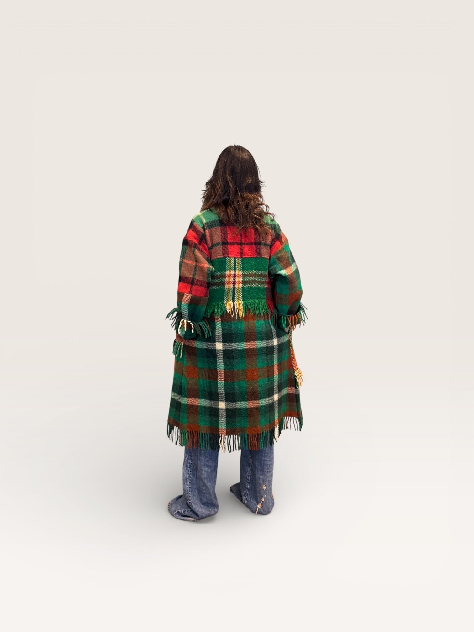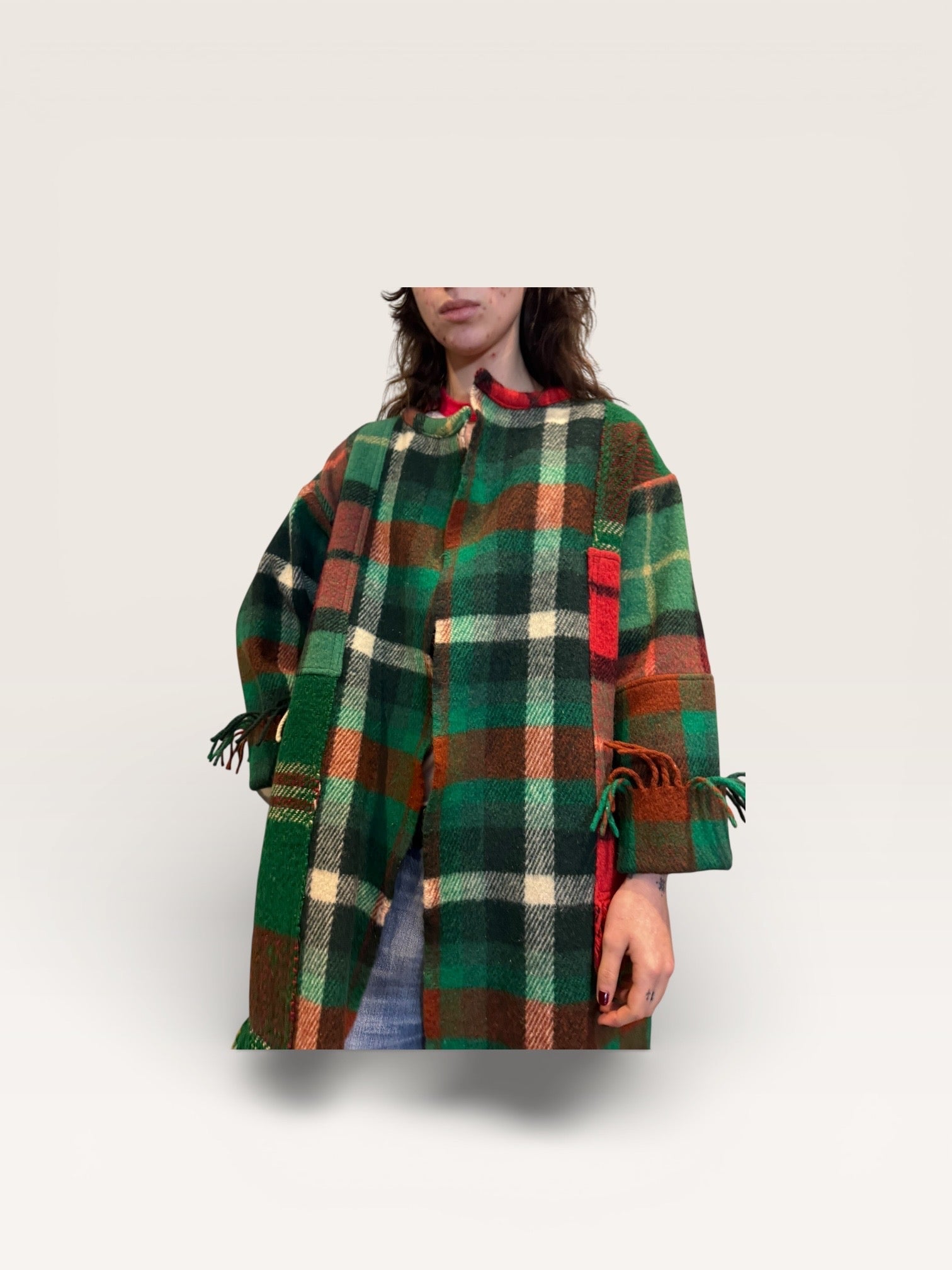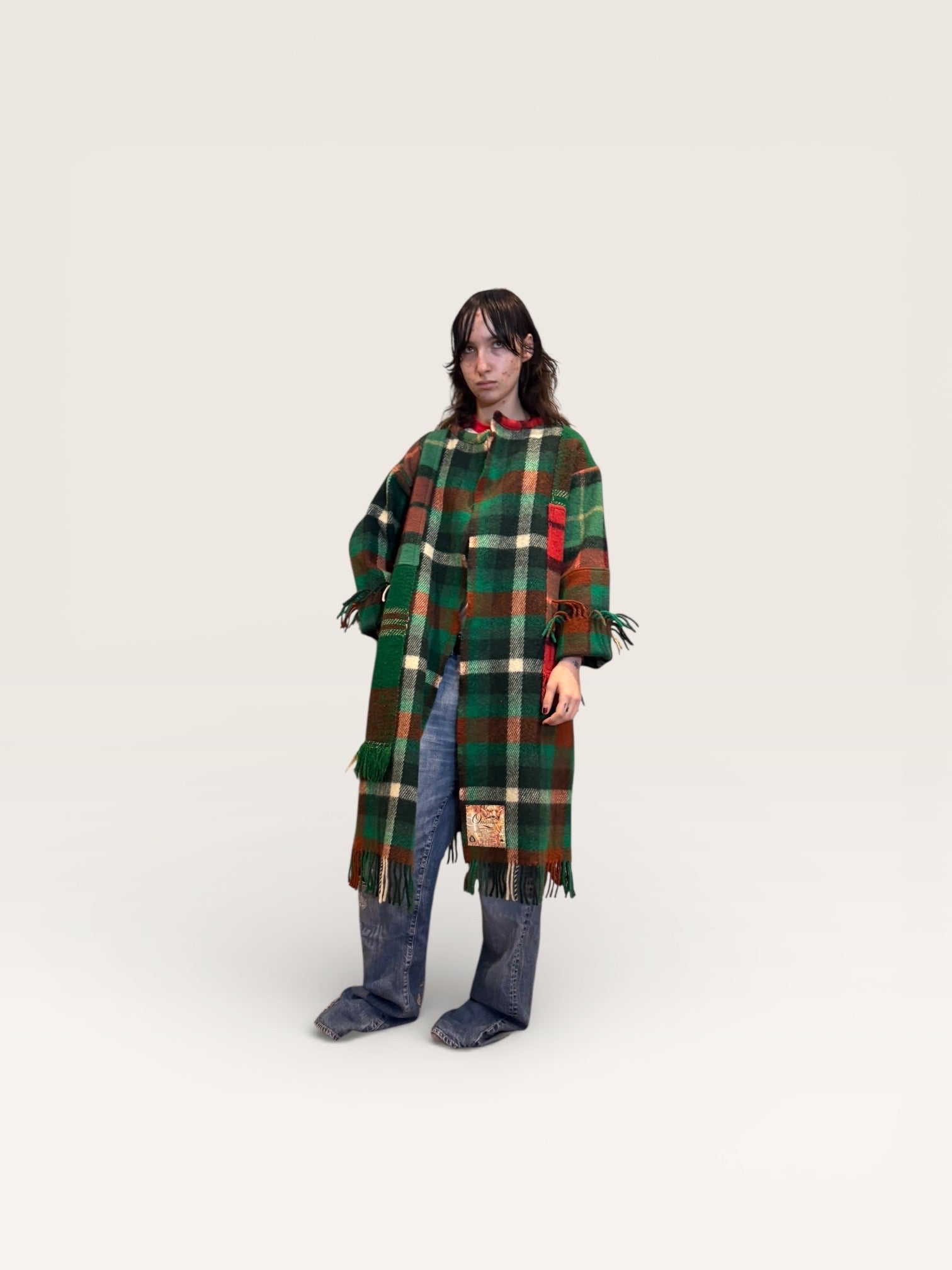 This one-of-a-kind 70s patchwork soft wool blanket coat is a true original. Featuring a unique mix of vintage check blankets, it has long sleeves, a straight fit, and silk side pockets in a vibrant vintage  print.