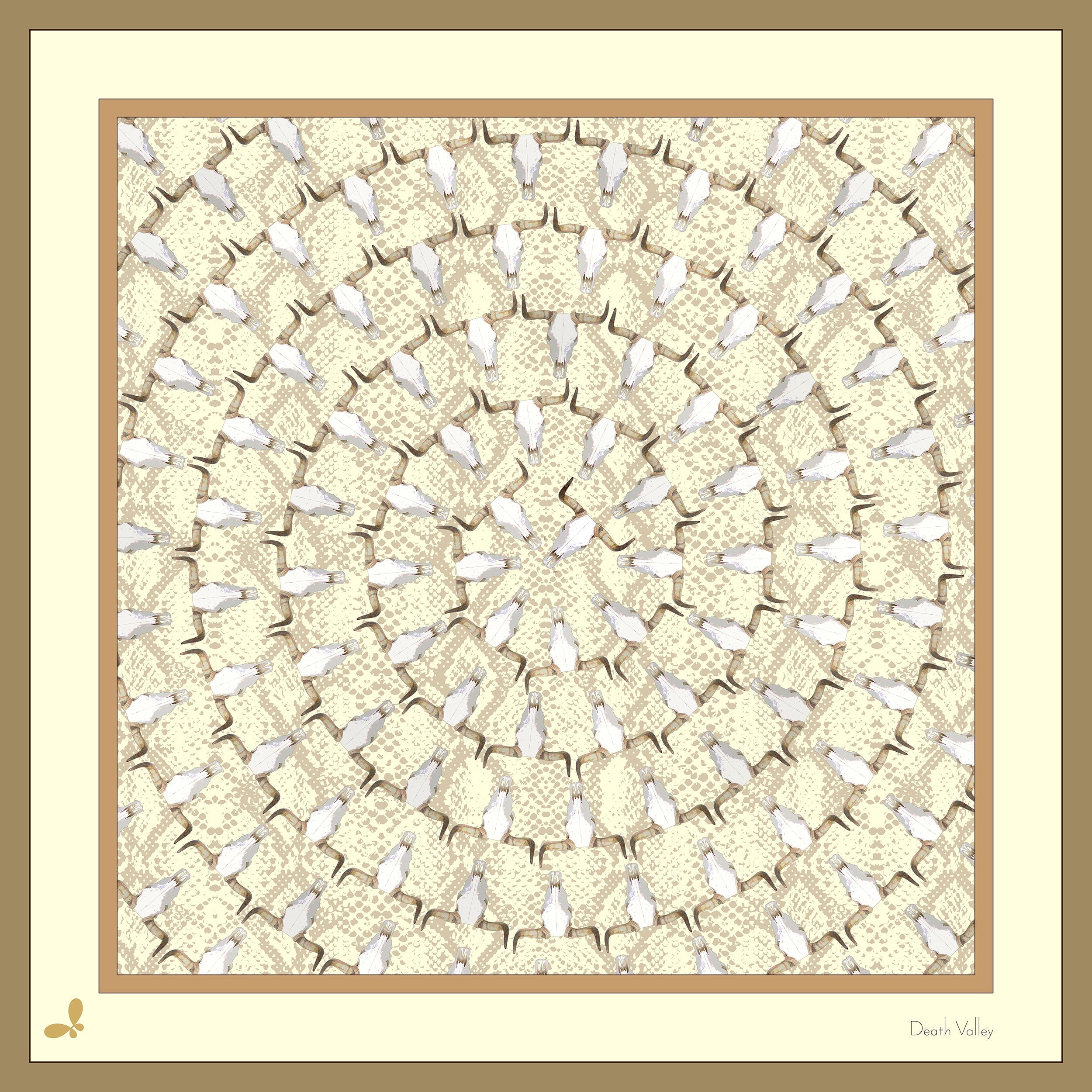 A swirl of snakeskin and goats skulls. Inspired by the extreme, baron and mysterious desert landscape at Death Valley. Big enough to bandana, neck tie and hair tie, small enough to tie on a bag strap or wrist. As modeled by Tula. Cream, ivory, sand and caramel shades.