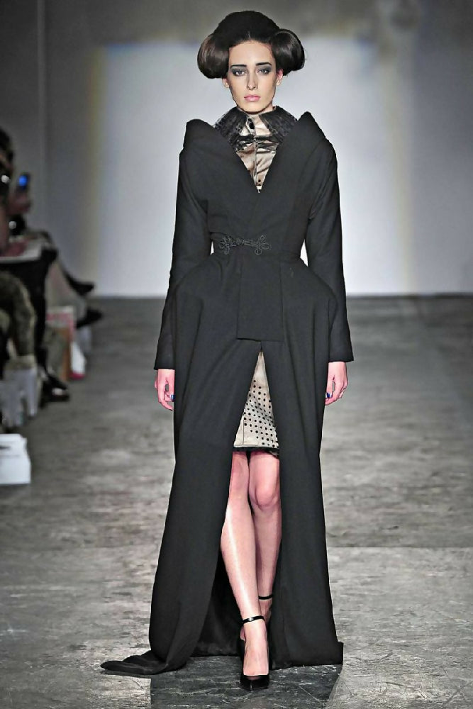 Evening Frock Coat S/S 2012: Draped long sleeve fitted evening coat, kimono style centre front neckline, shoulders and back. Large embroidered closure sewn outside on the centre front of the evening coat for opening and closing. Outer fabric:100% wool in black, Lining:100% silk satin in black. Size 10 LAST ONE