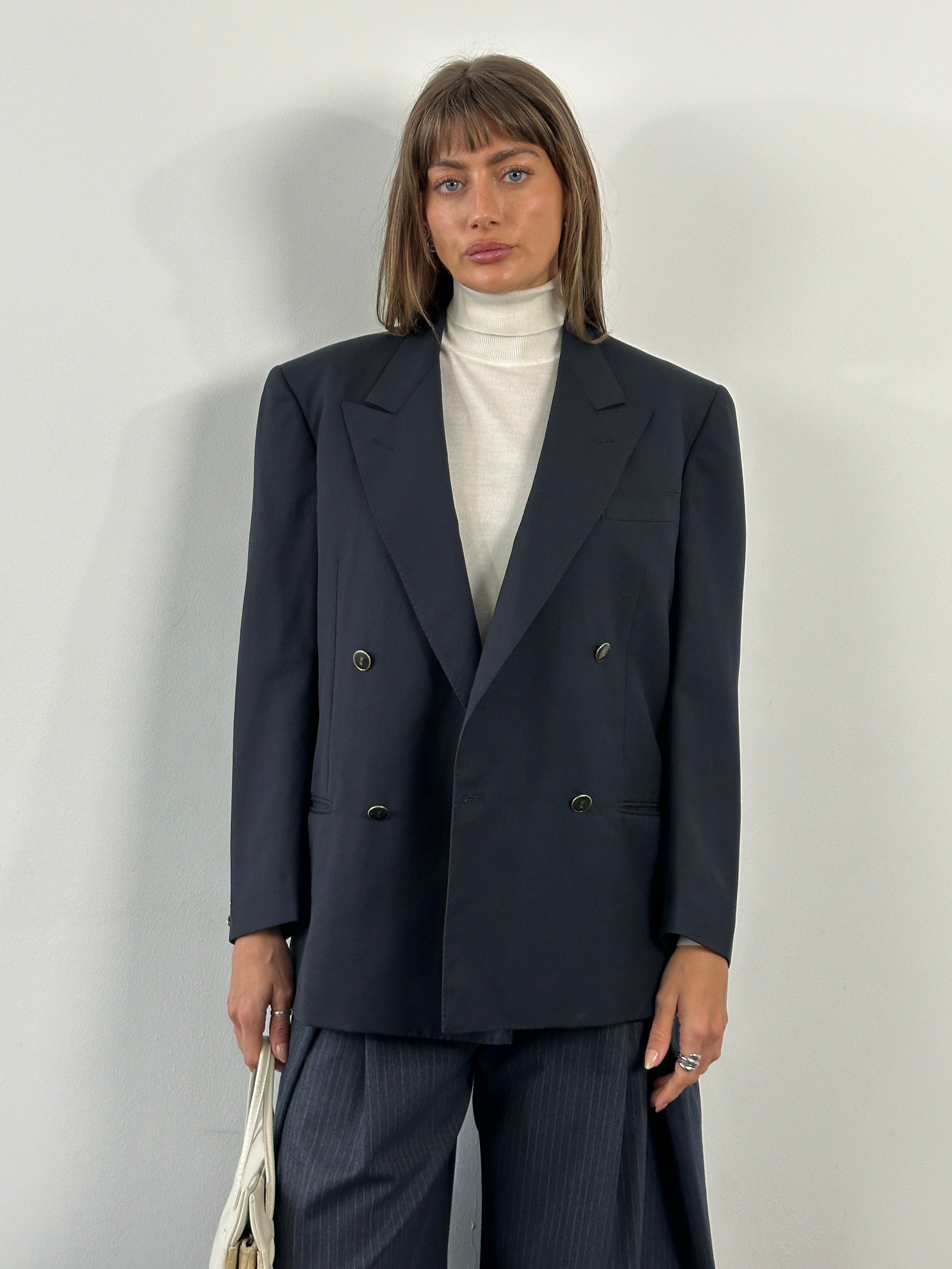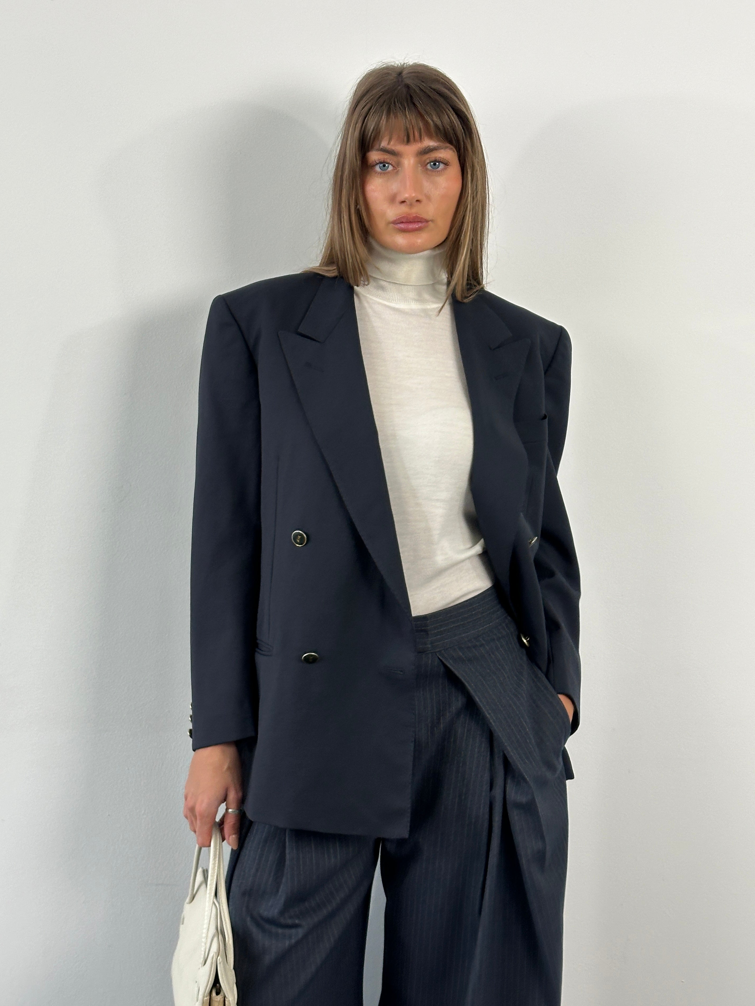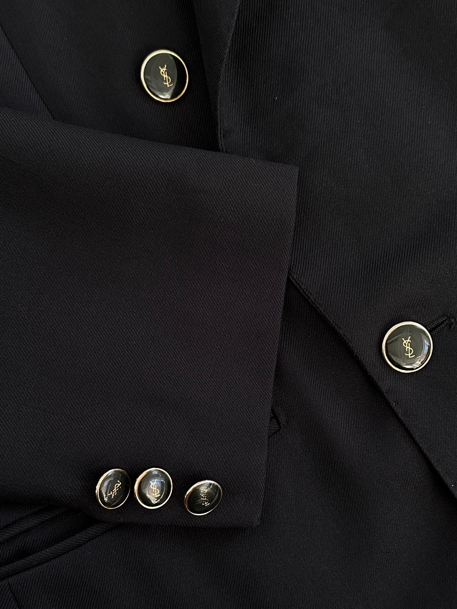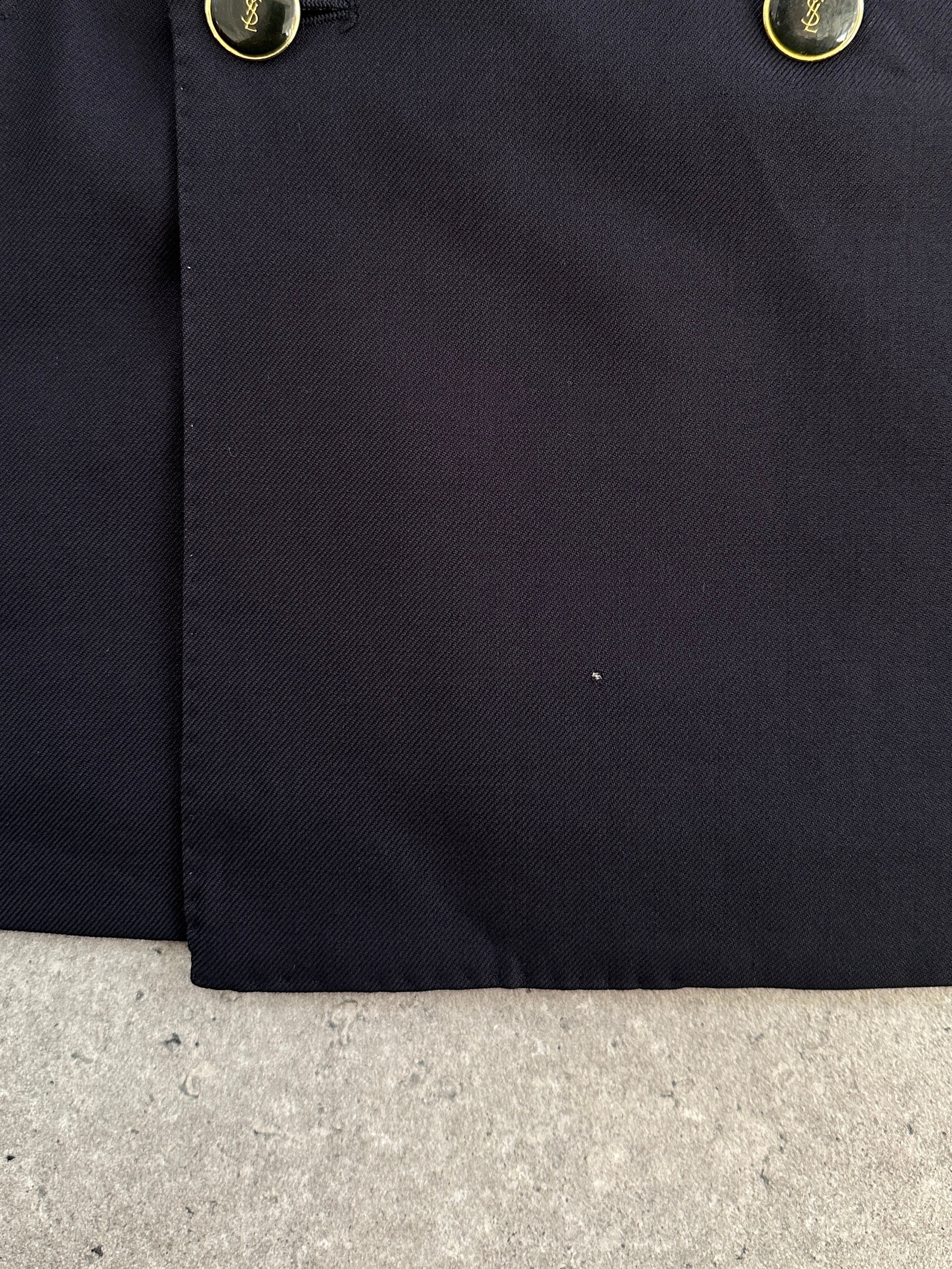A vintage 1990s Yves Saint Laurent double breasted blazer in a deep navy tone with bespoke gold and black buttons. A sharp tailored silhouette with classic menswear proportions and refined YSL detailing.