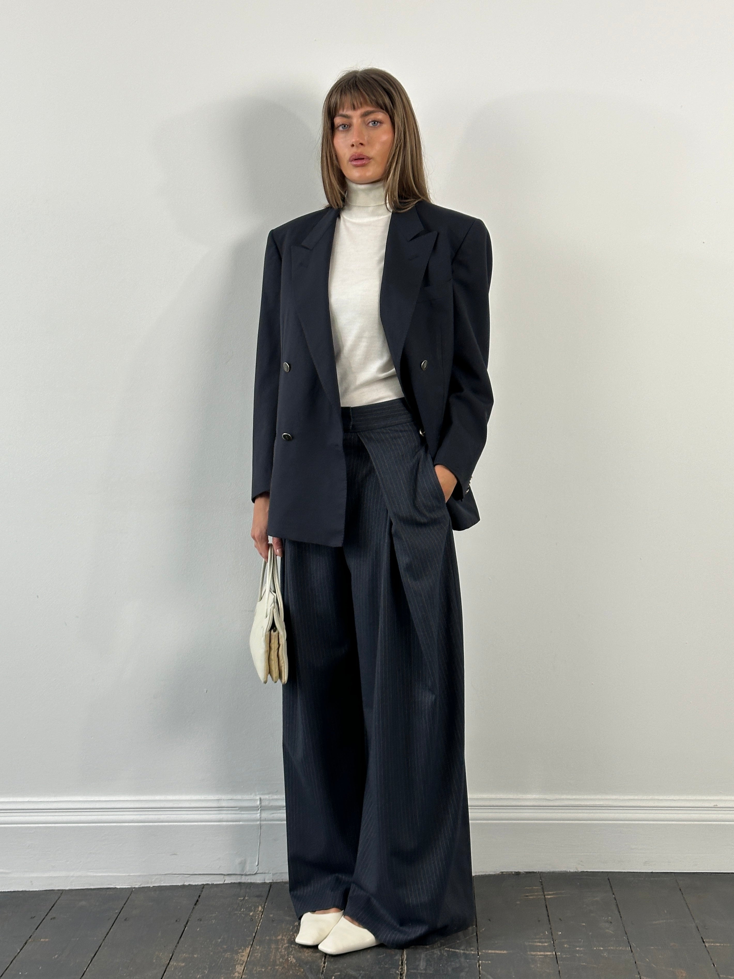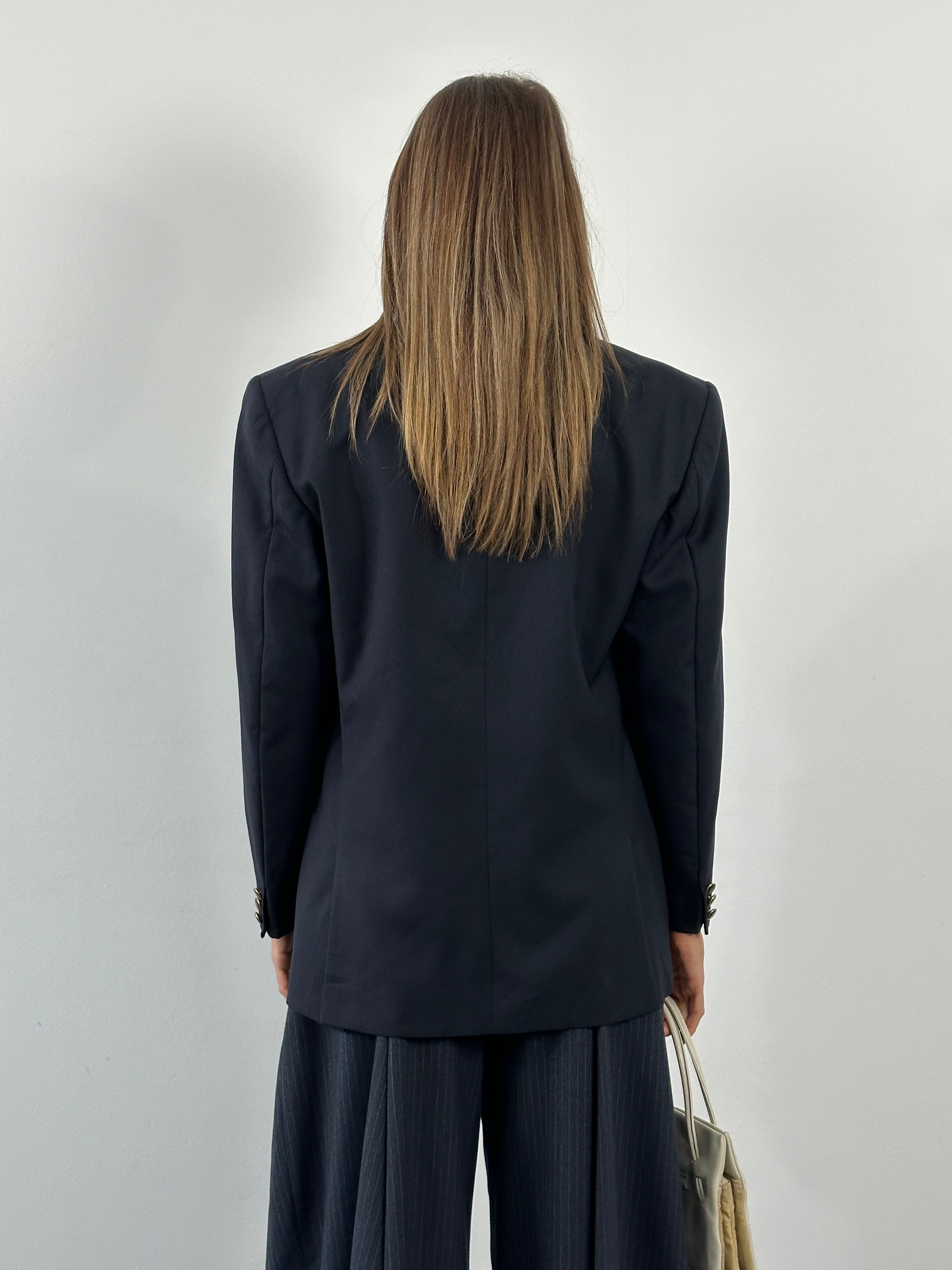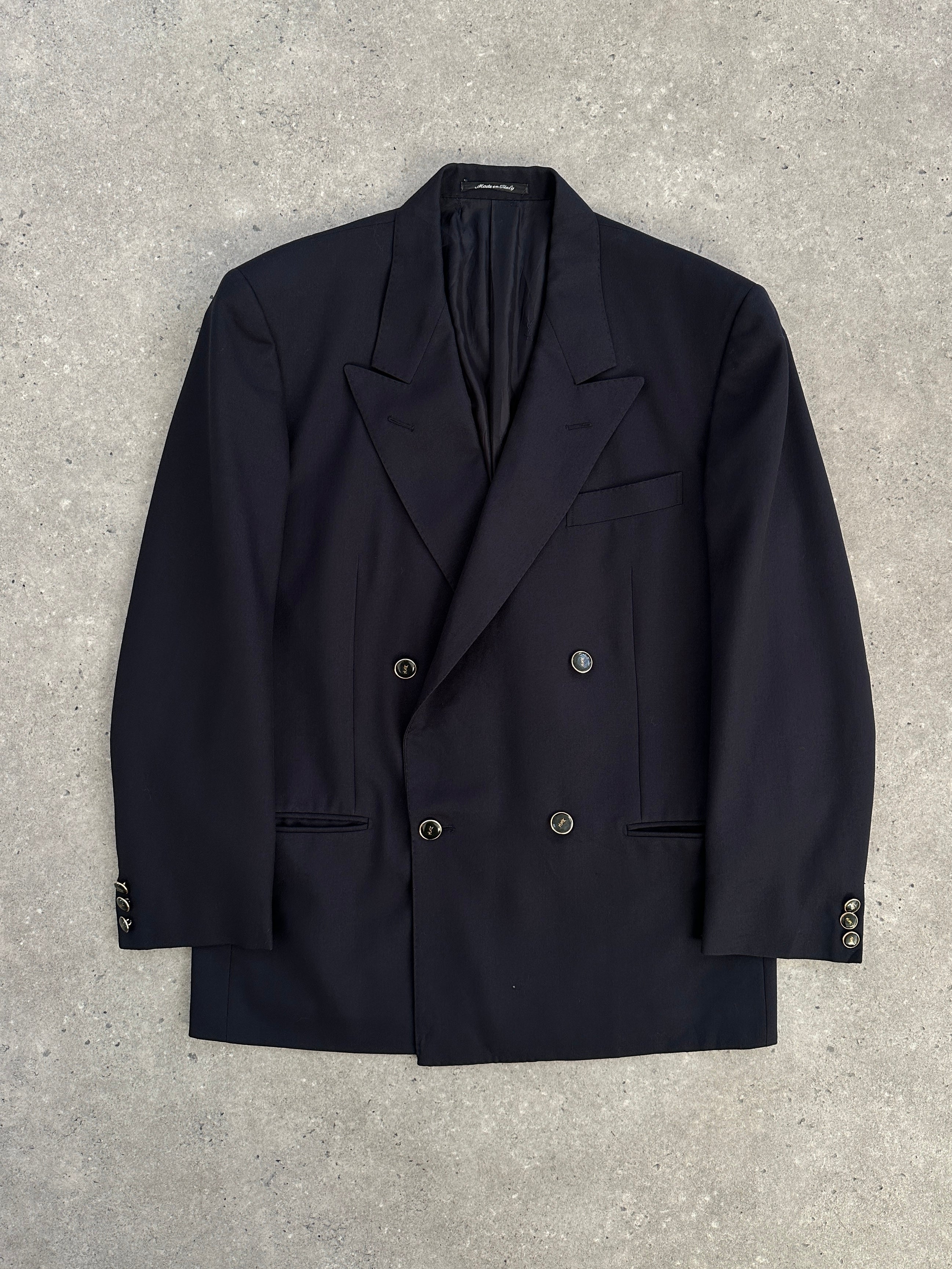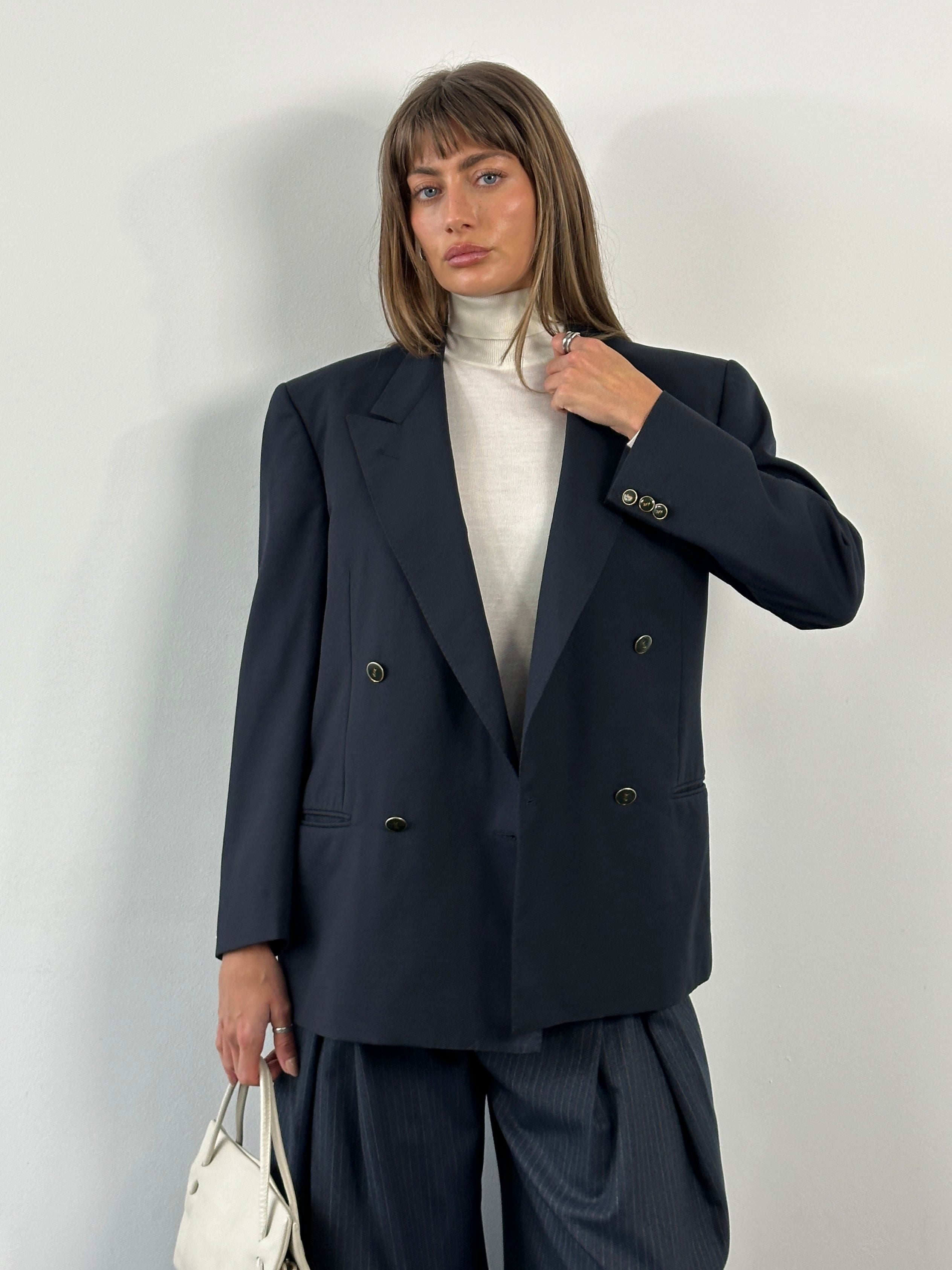 A vintage 1990s Yves Saint Laurent double breasted blazer in a deep navy tone with bespoke gold and black buttons. A sharp tailored silhouette with classic menswear proportions and refined YSL detailing.