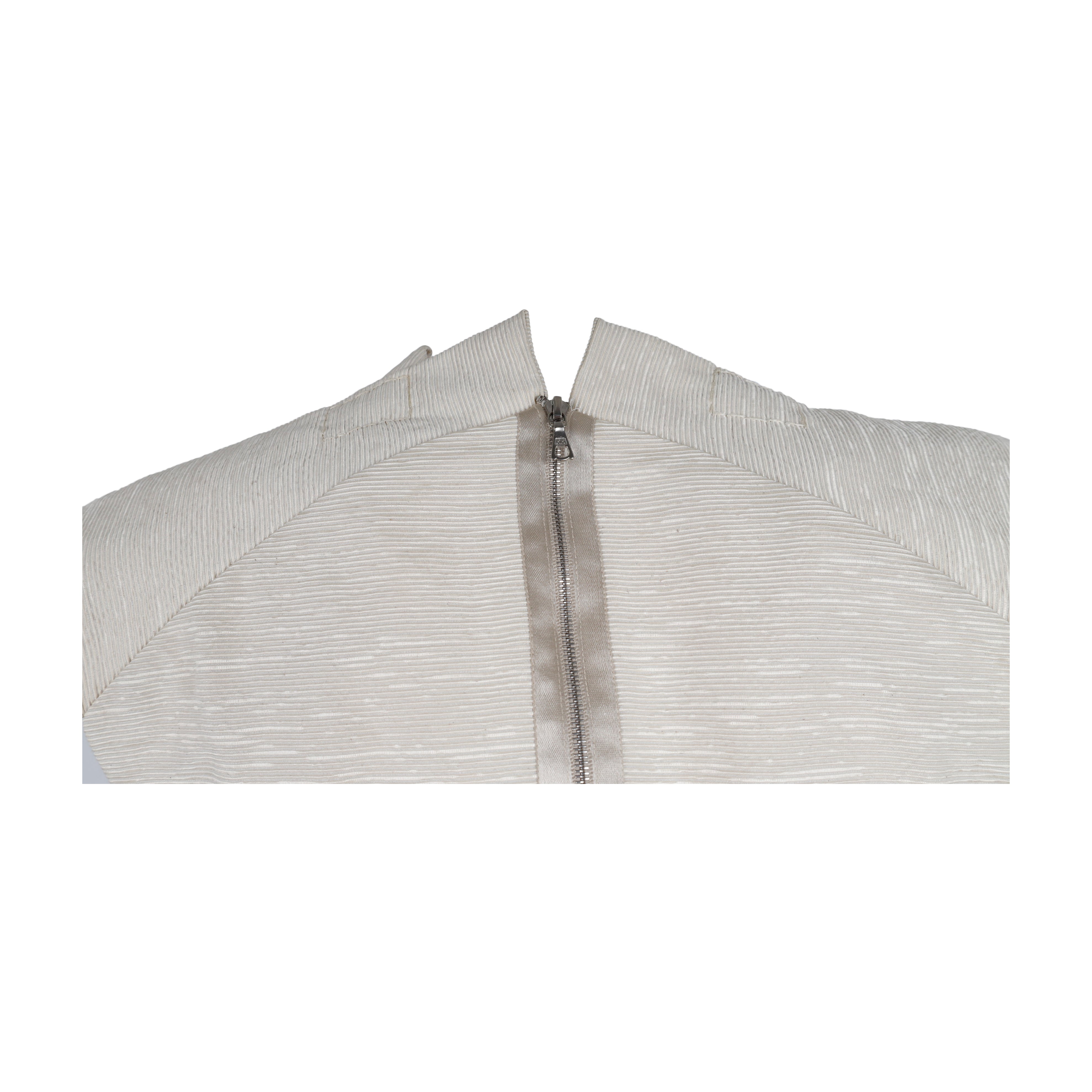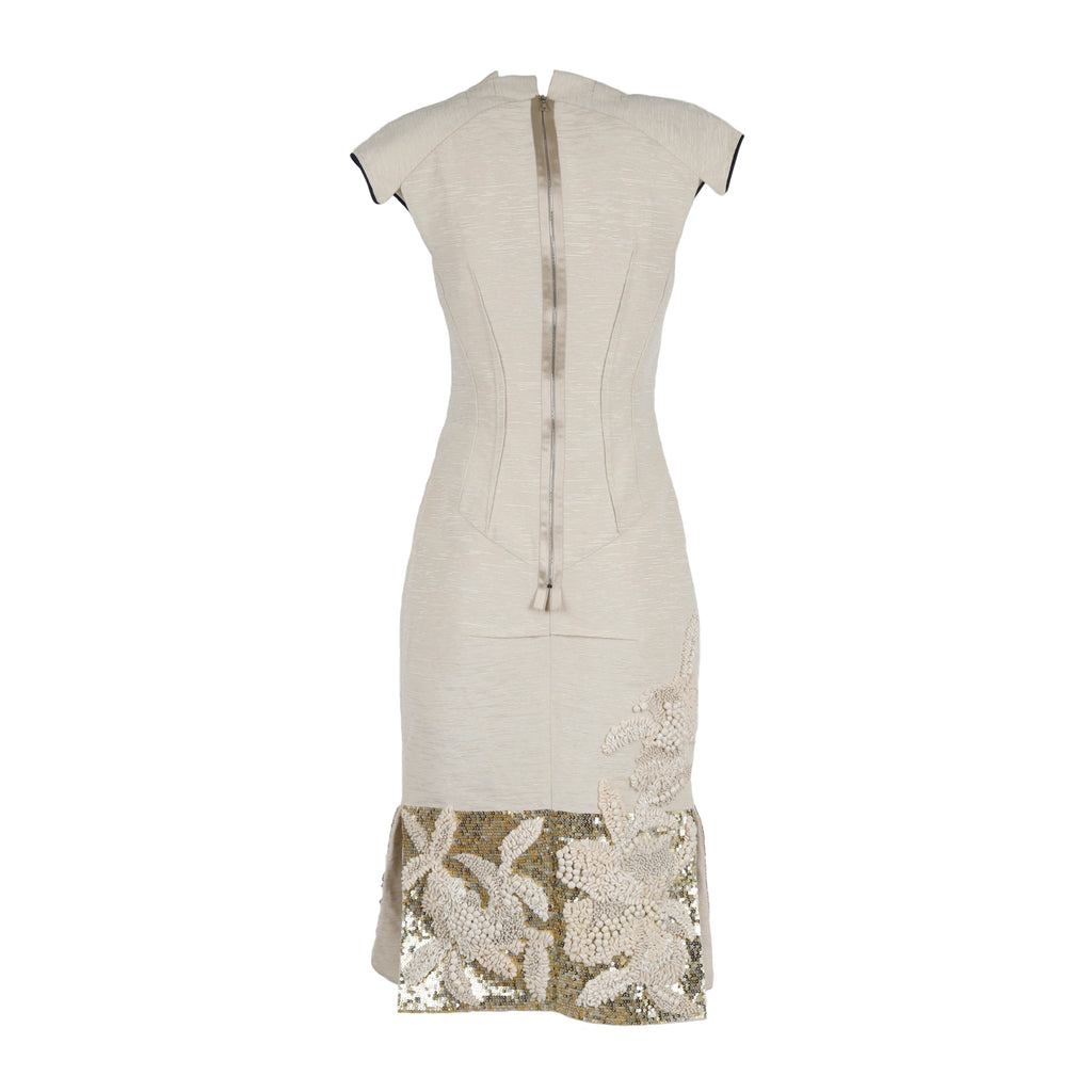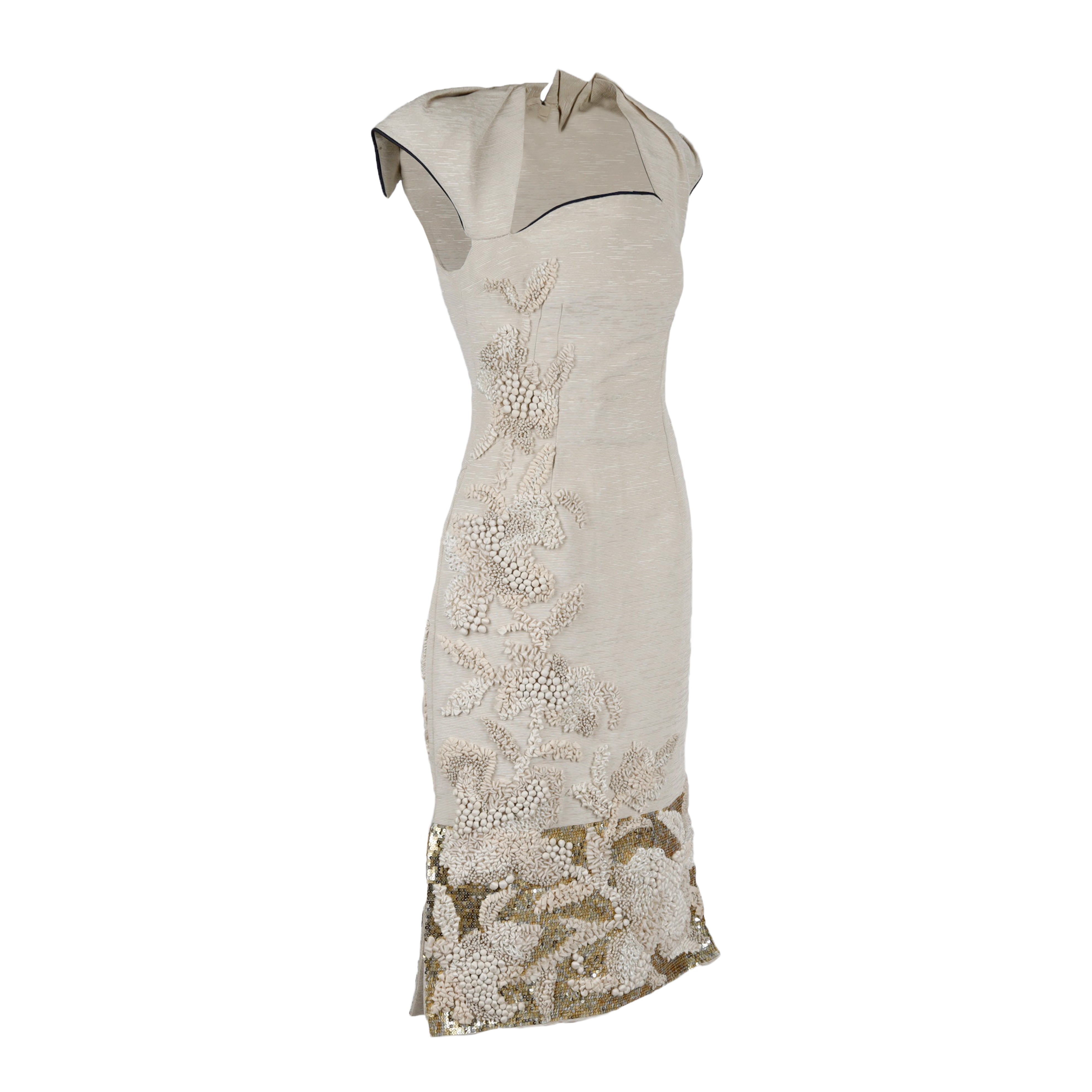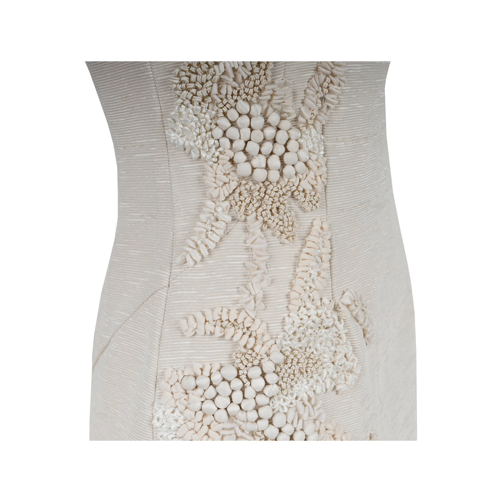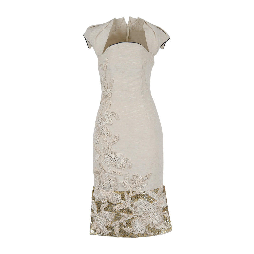 This 6267 Embroidered Dress is a haute couture piece crafted from ottoman textured fabric, with contrast piping and elaborate embellishments of sequin and multi textured fabric. Structured to stand out with its unique sculpturing and attention to detail, the dress features pleated sleeves and intricate detailing.