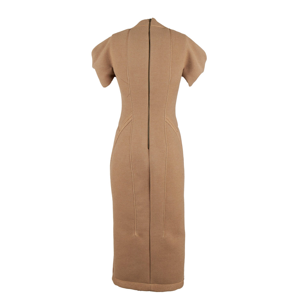 From the Fall 2006 collection, this 6267 Wool Sheath Dress is made of a luxurious blend of camel and virgin wool for superior warmth and comfort. Designed with a fitted silhouette, this dress features two side slits, a criss cross stitch detail over the waist, and gathering pleated sleeves. A high neck with a deep square neckline completes this sophisticated look in tan brown.