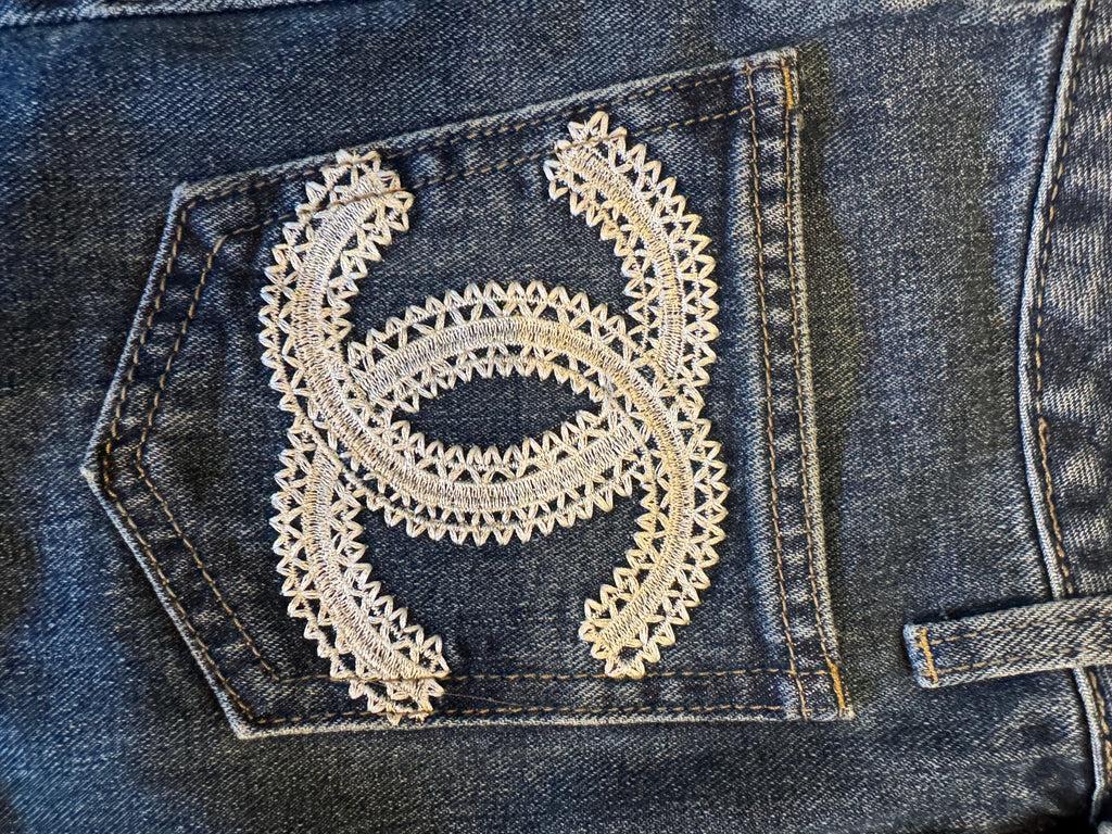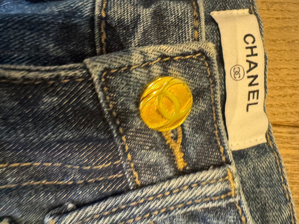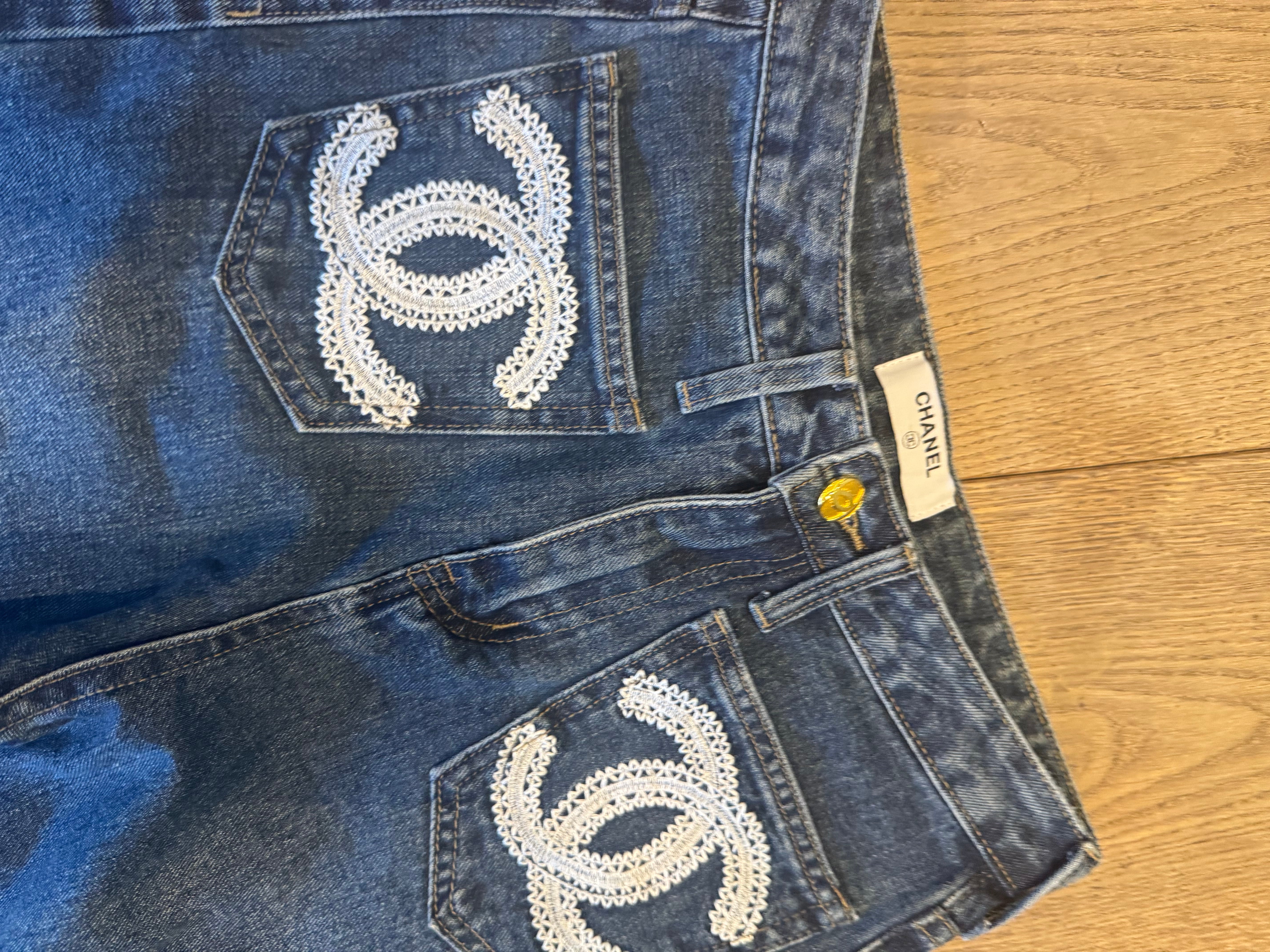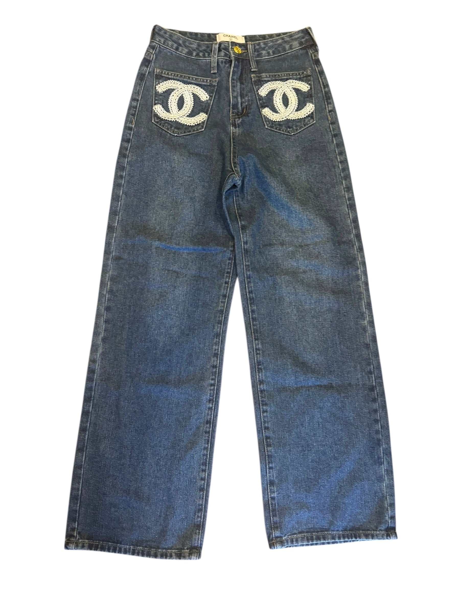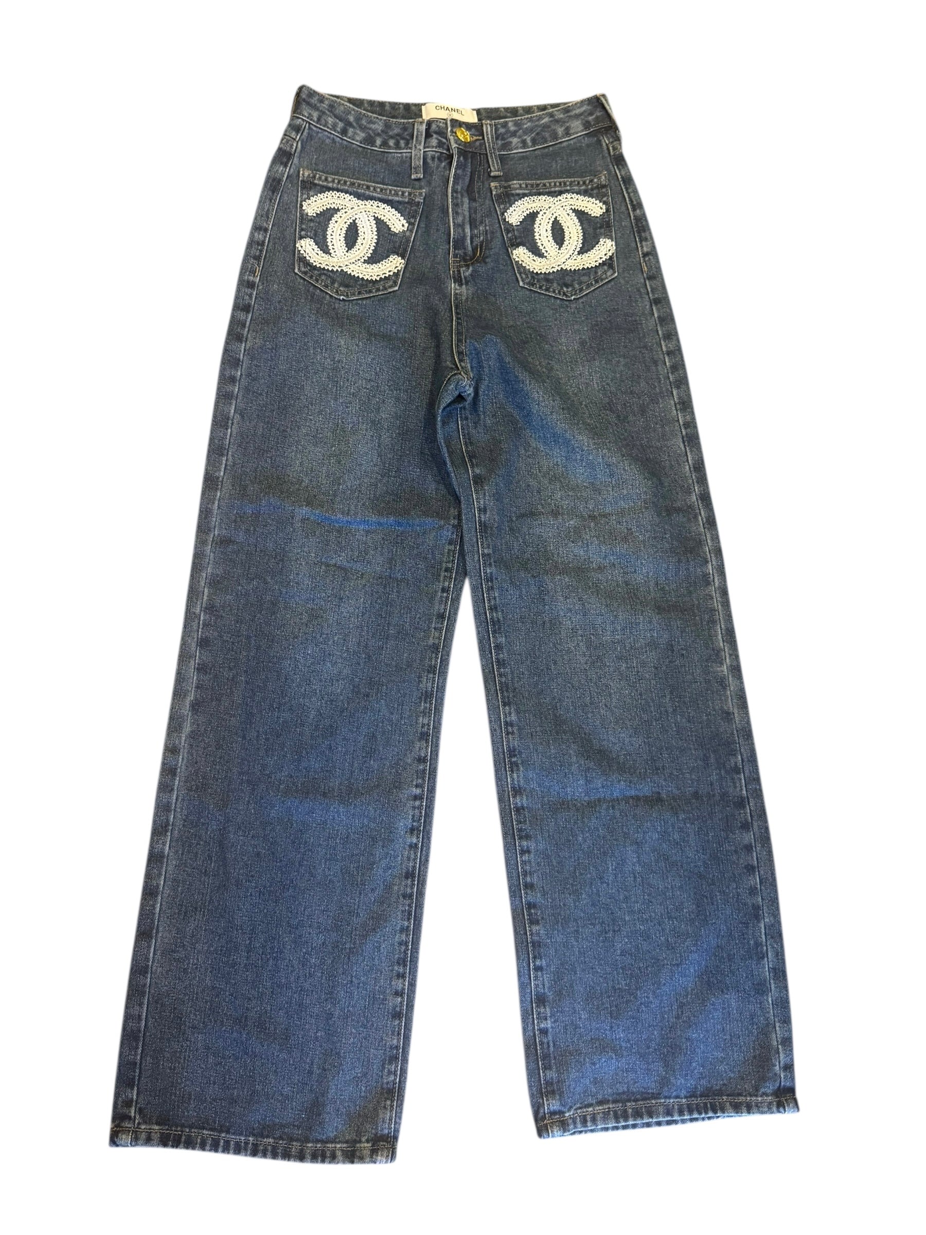 Hard to find in such good condition, Y2K Chanel jeans, featuring intricate monogram embroidery on the front pockets. Designed with a mid-rise fit and slight barrel silhouette for a stylish yet comfortable look. Hardly worn and in excellent condition, these collectible jeans make for a timeless classic.