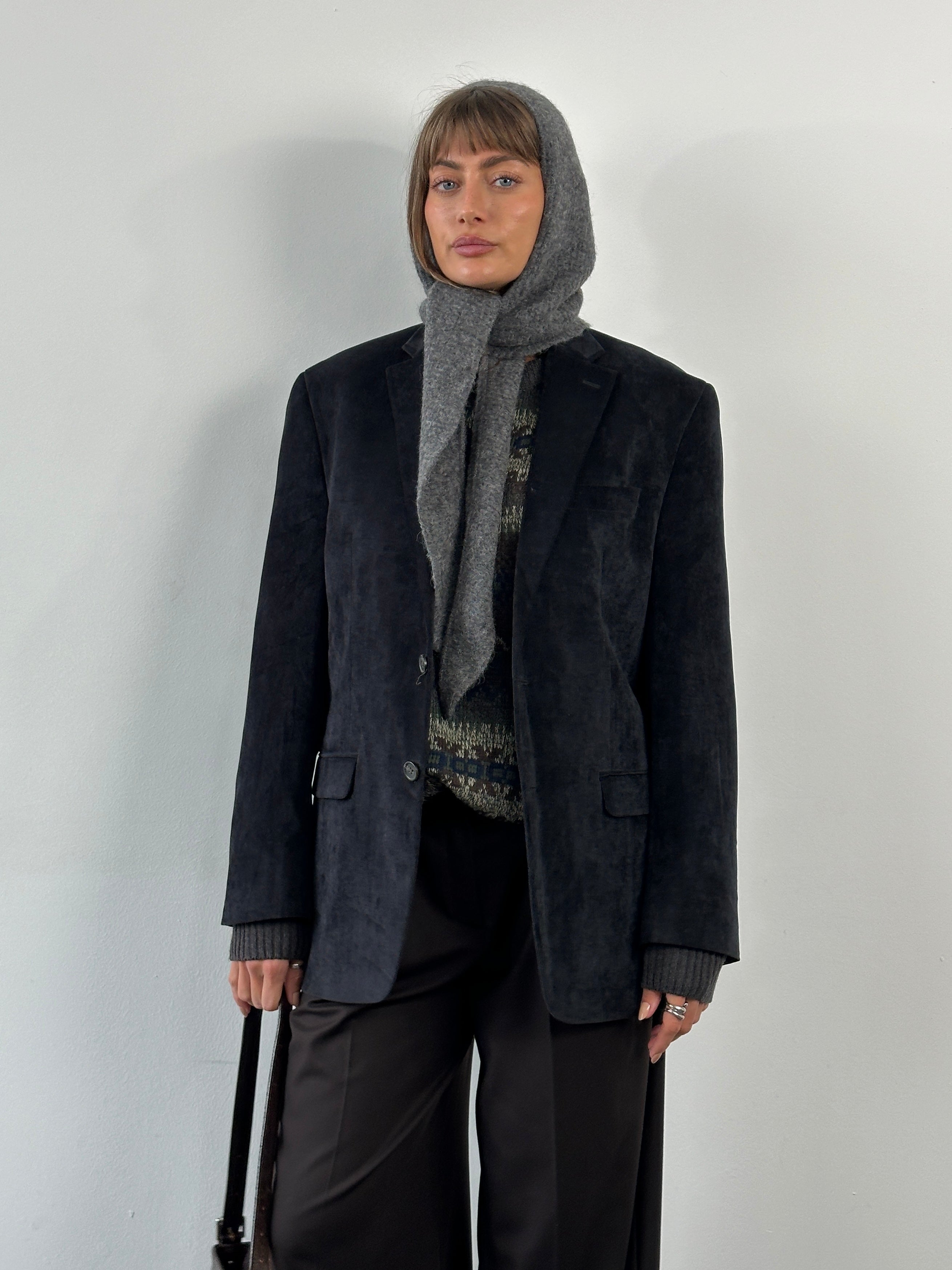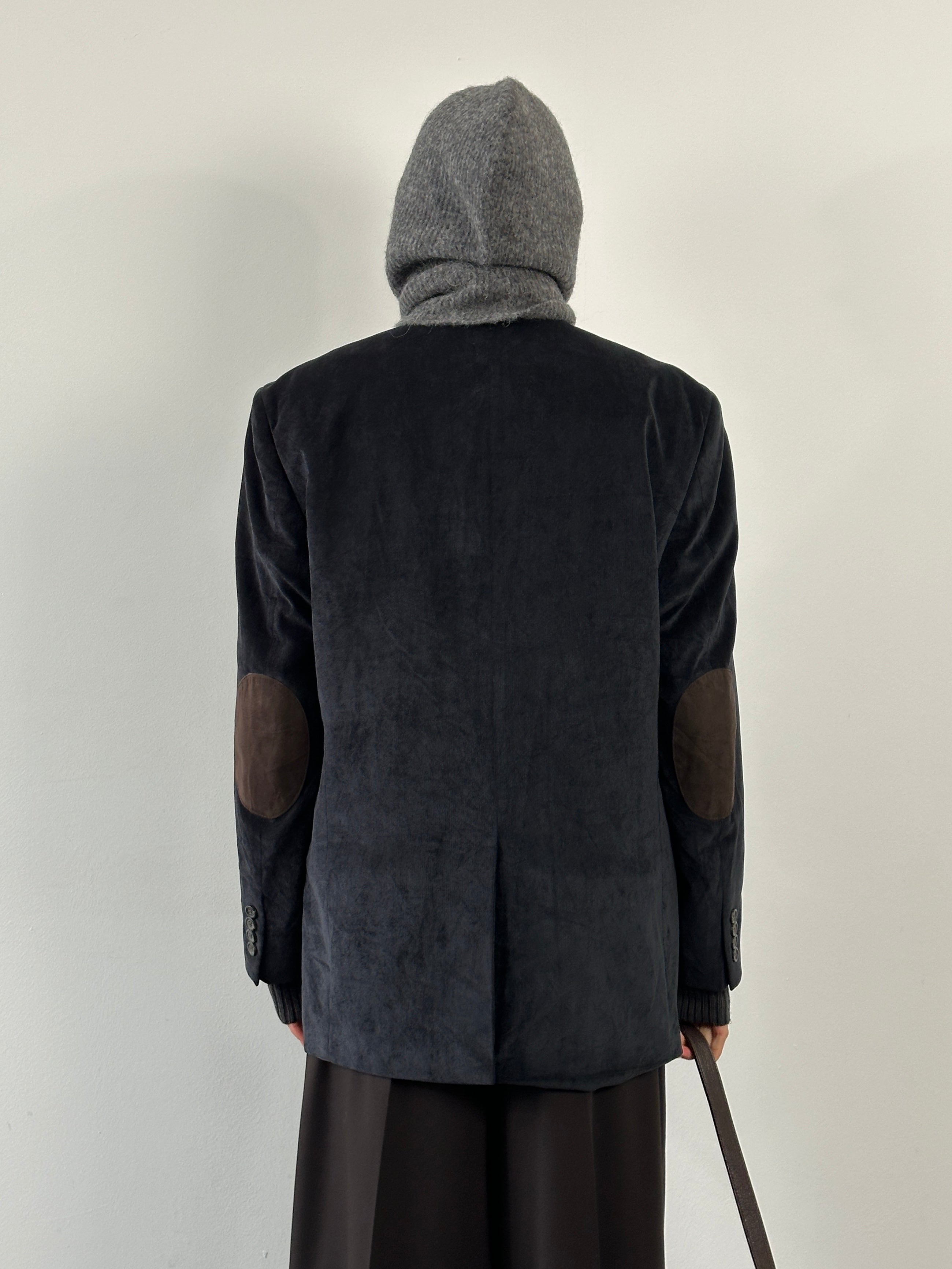 A vintage 2000s Chaps single breasted blazer in a deep navy tone with a soft handle and brown elbow pads. A relaxed tailored silhouette finished with a patterned paisley lining for a subtle heritage feel.