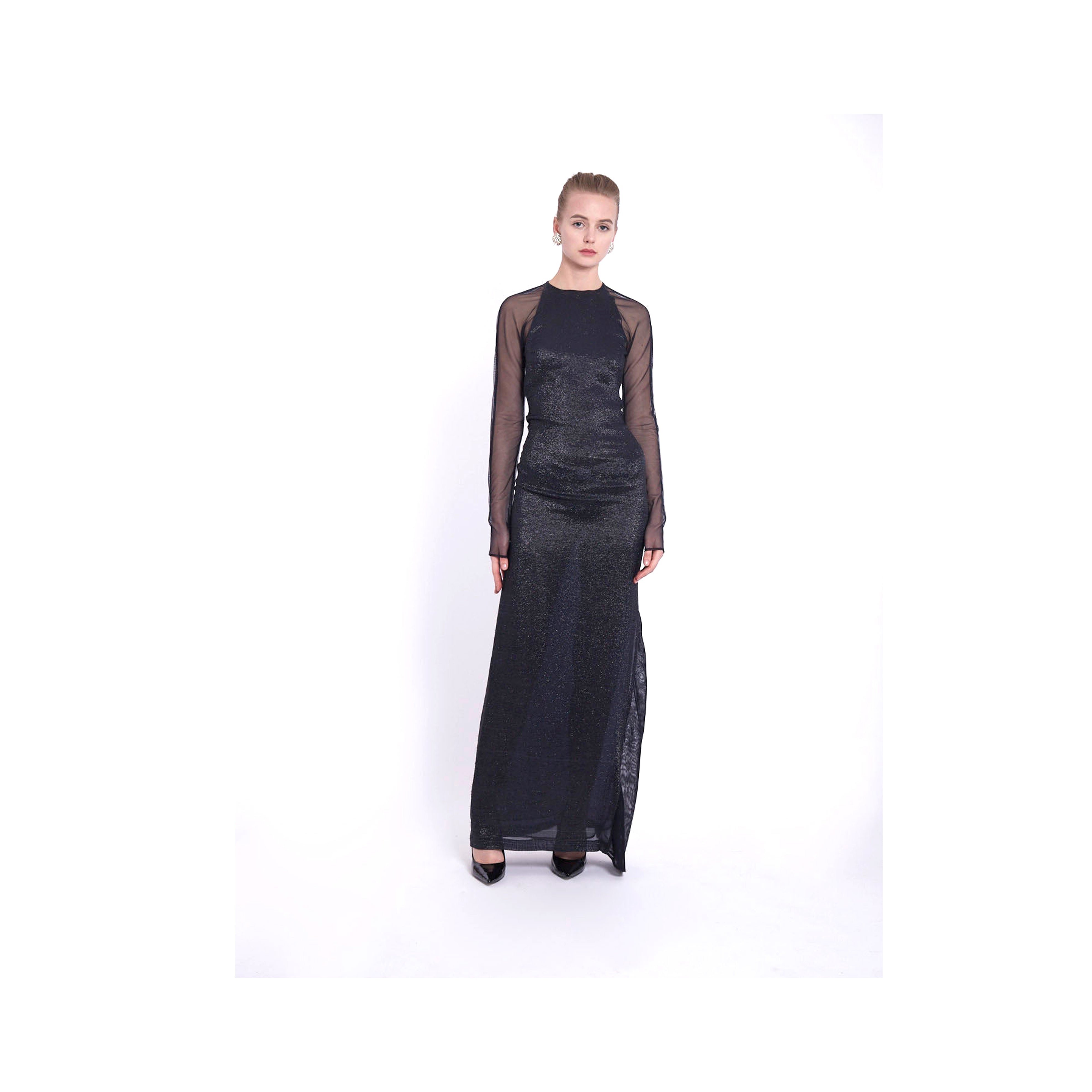 Long fitted lurex evening dress by Gianfranco Ferré with navy blue mesh inserts on sleeves, back and left leg. Deep opening on the back, silk chiffon lining. An intriguing and full of charm dress, which pays tributes to the sculptural forms much loved by the designer. Perfect for galas, theatre premieres and New Year's Eve parties.