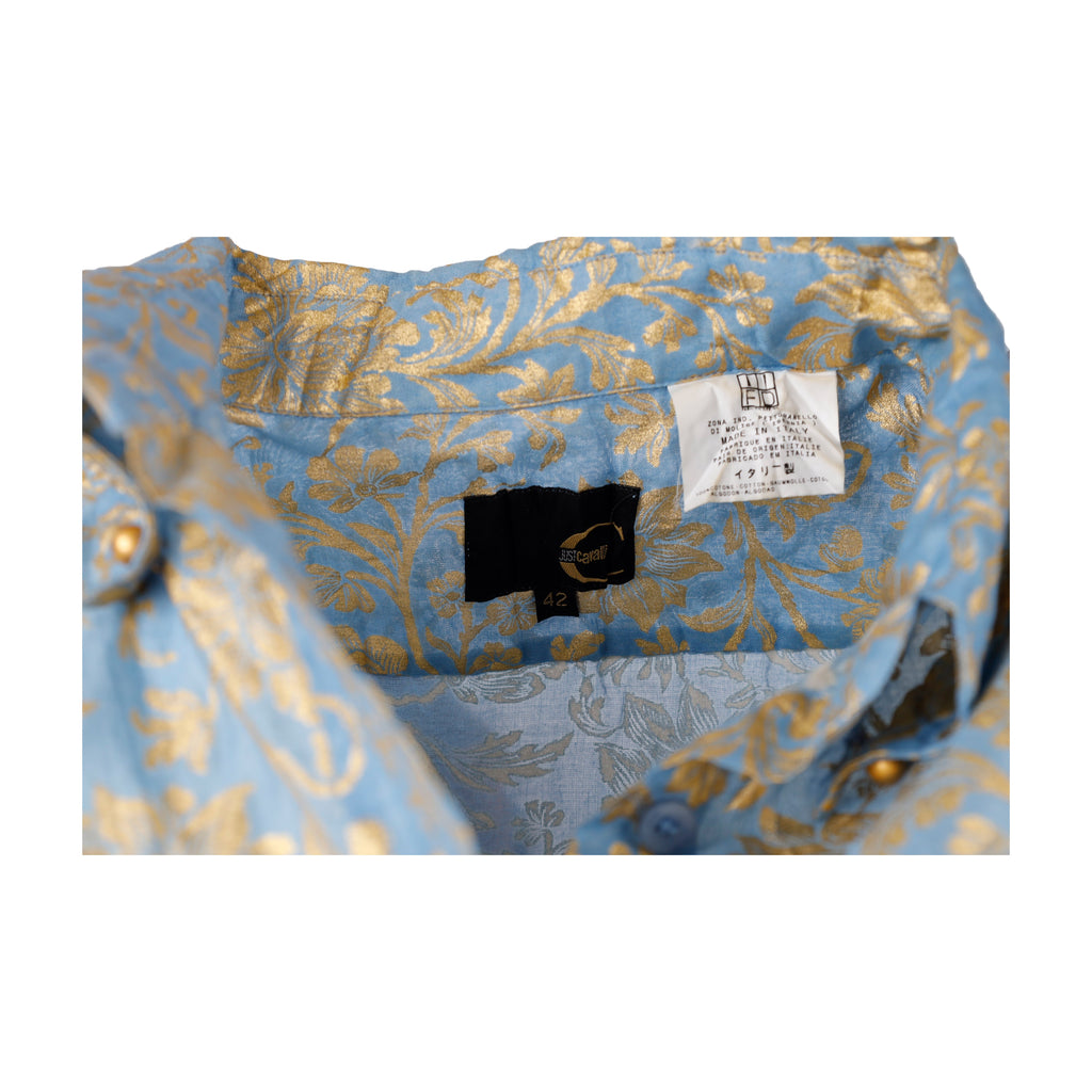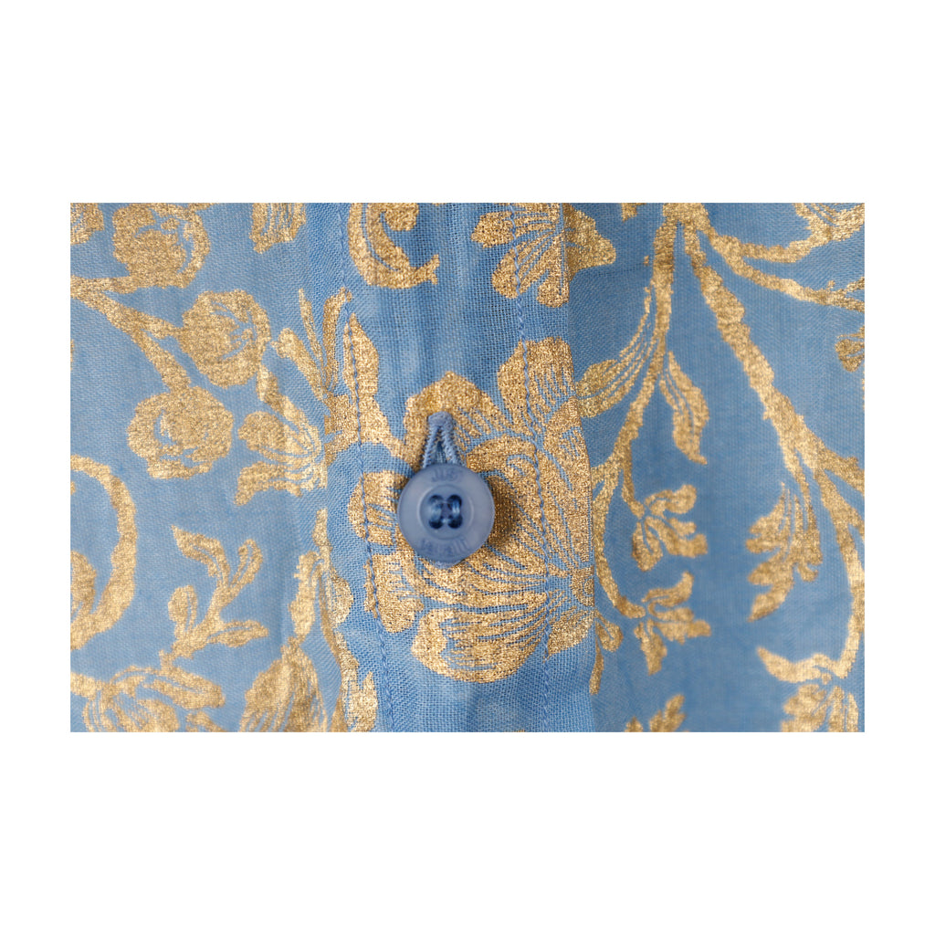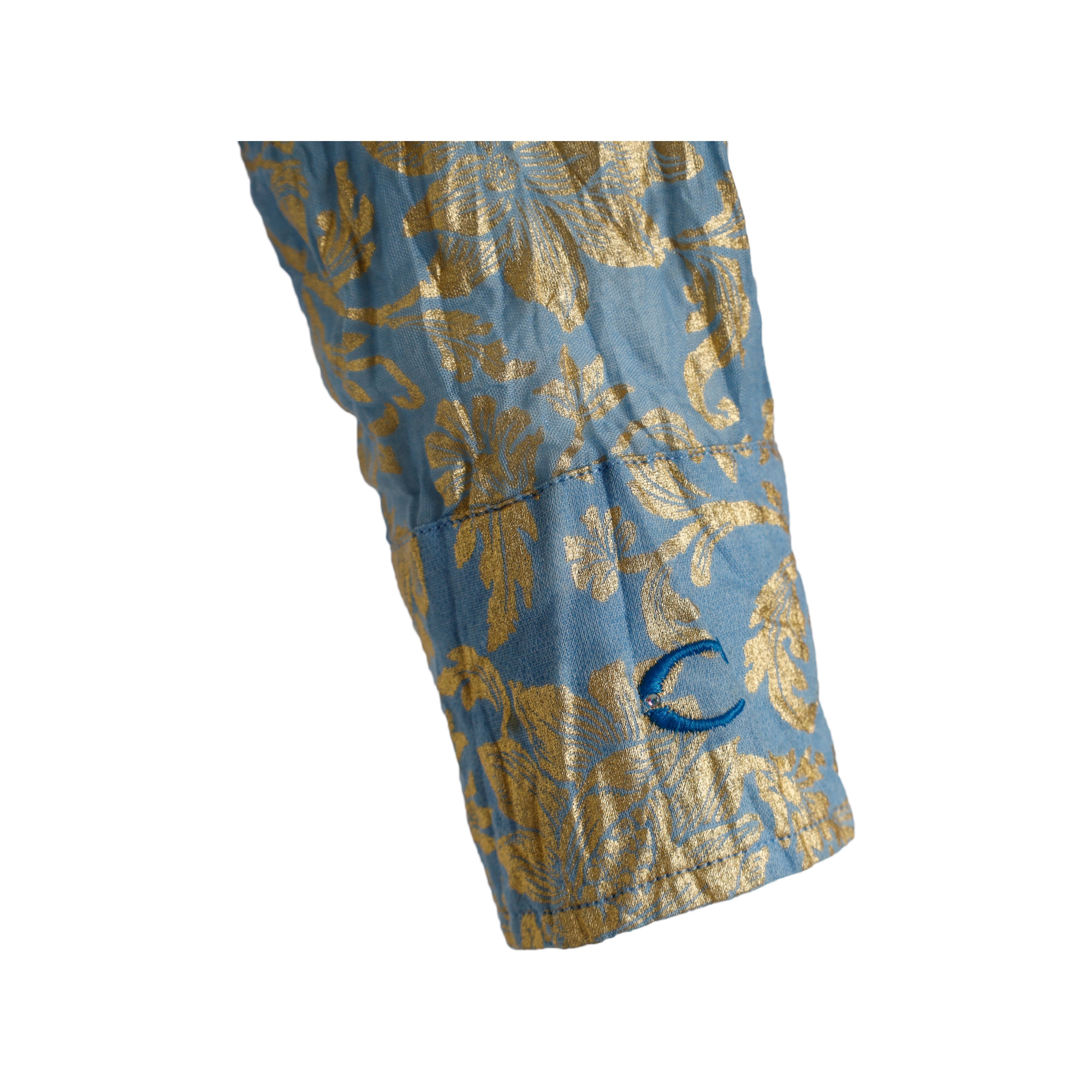 This Just Cavalli shirt features a classic collar and cuff, front button closure, and two golden round buttons at the collar. Made from light blue cotton, it is intricately screen printed with golden paisley flowers. A thread embroidered C on the cuff adds a signature detail.