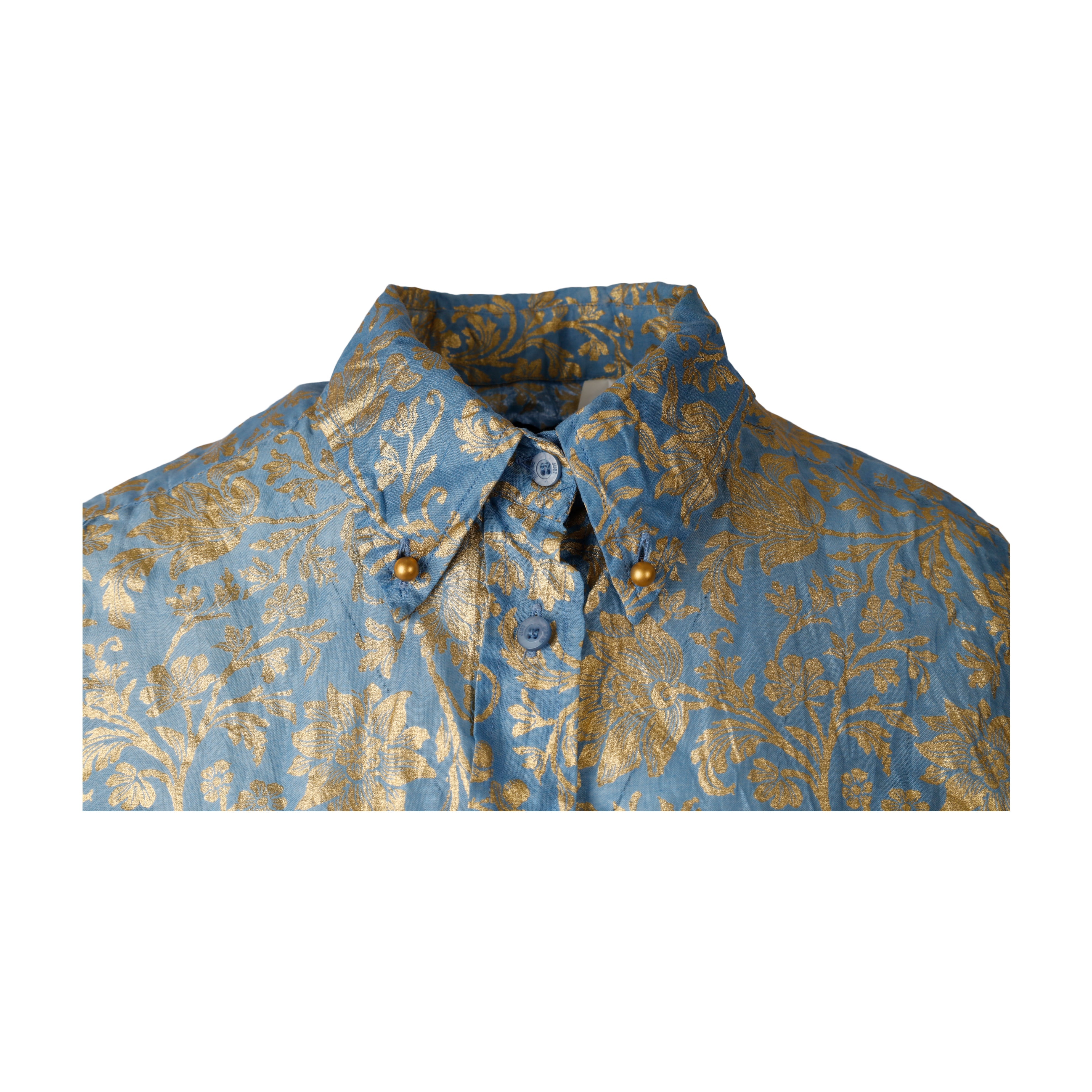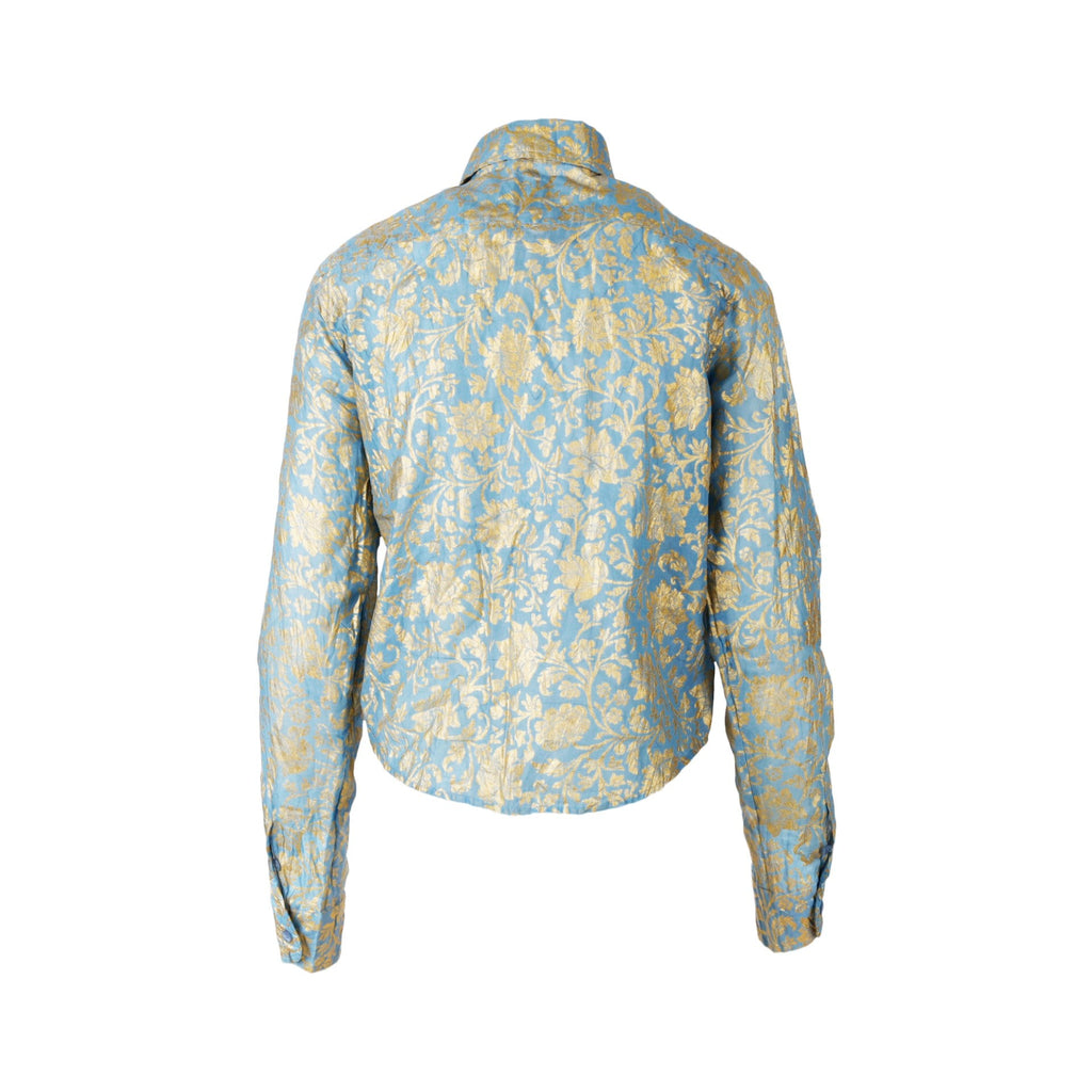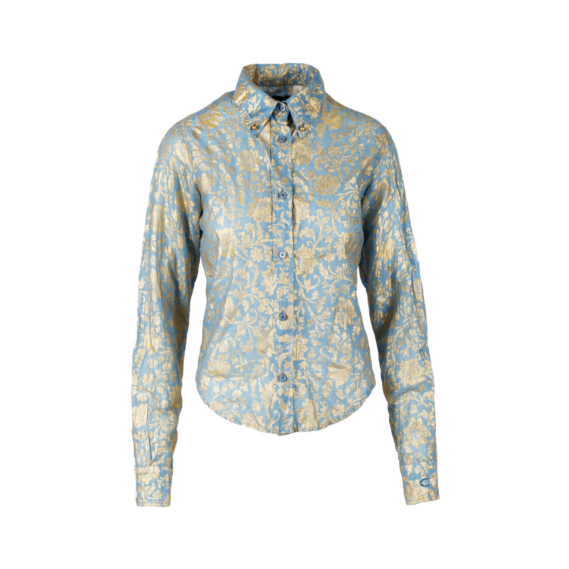 This Just Cavalli shirt features a classic collar and cuff, front button closure, and two golden round buttons at the collar. Made from light blue cotton, it is intricately screen printed with golden paisley flowers. A thread embroidered C on the cuff adds a signature detail.