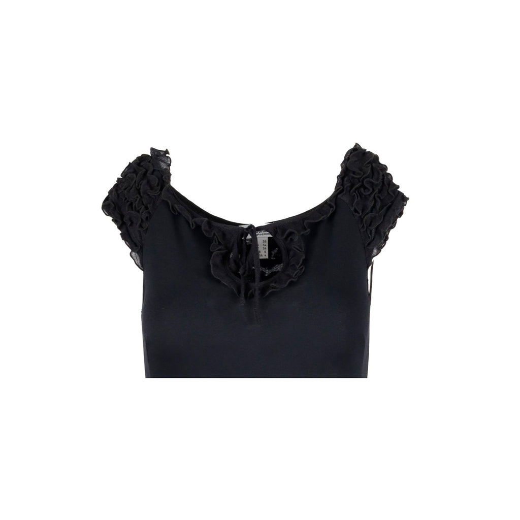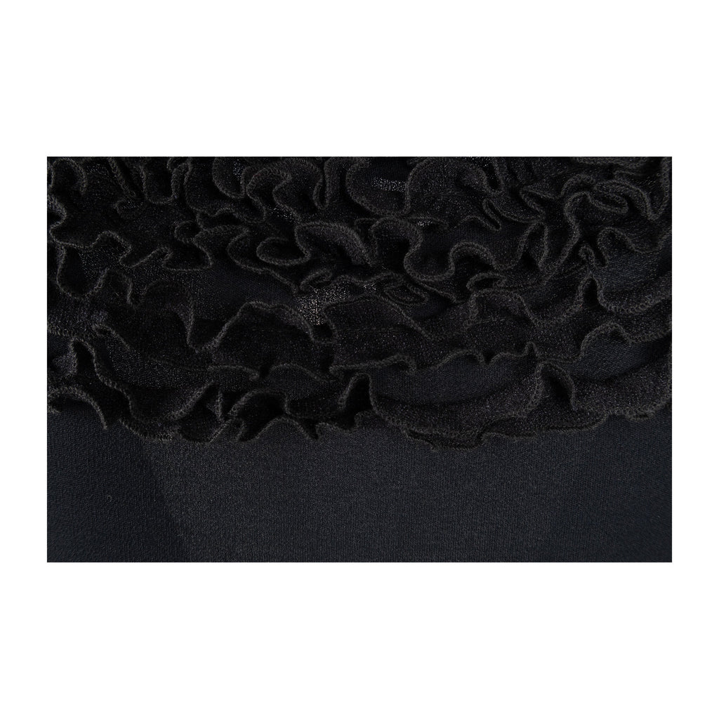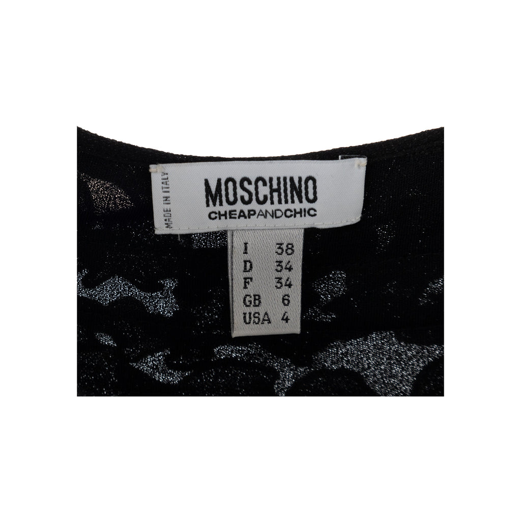 This vintage Moschino Cheap and Chic dress features an iconic asymmetric hemline and can be worn as an off-shoulder silhouette. With a scoop neck and ruffle embellishment, this black dress is a versatile and stylish addition to any wardrobe.