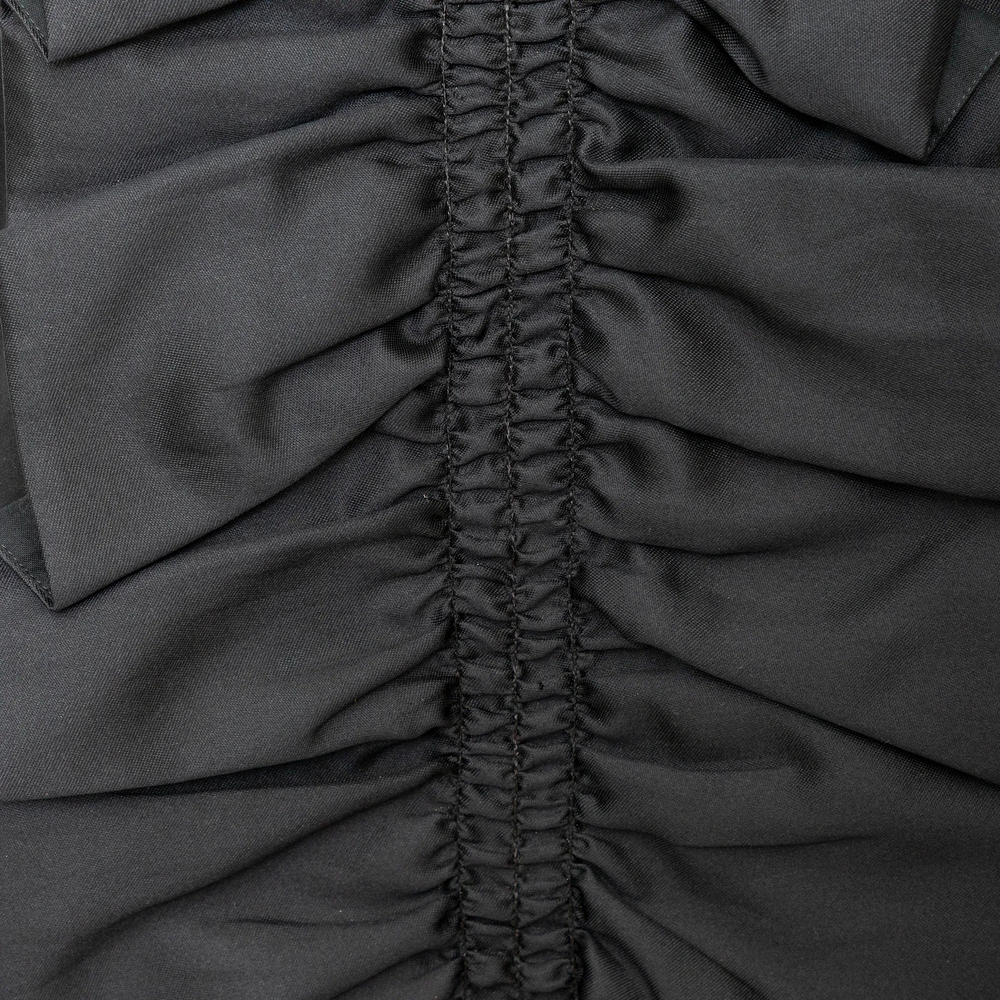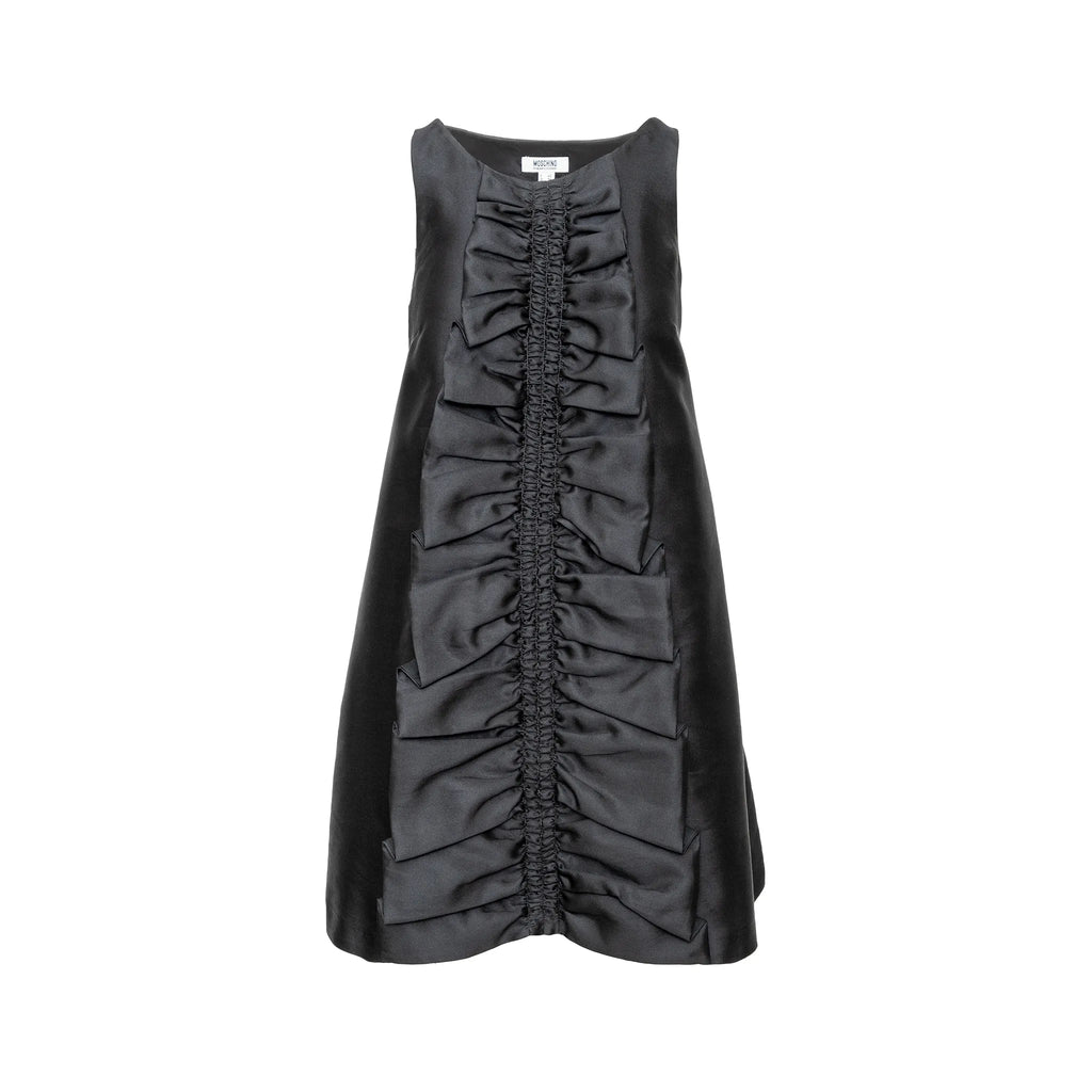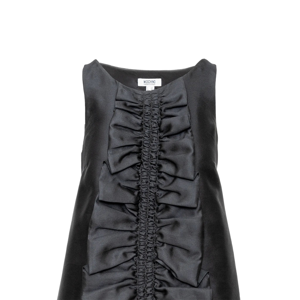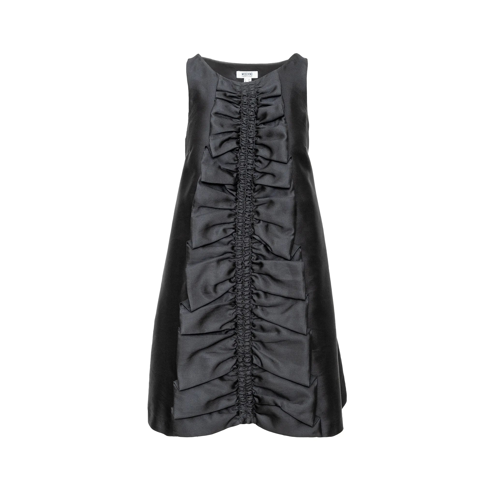Silk-blend Moschino Cheap and Chic black dress with pleated ruffle front, side pockets, and babydoll waist pleats on the back. A chic twist on the classic LBD.