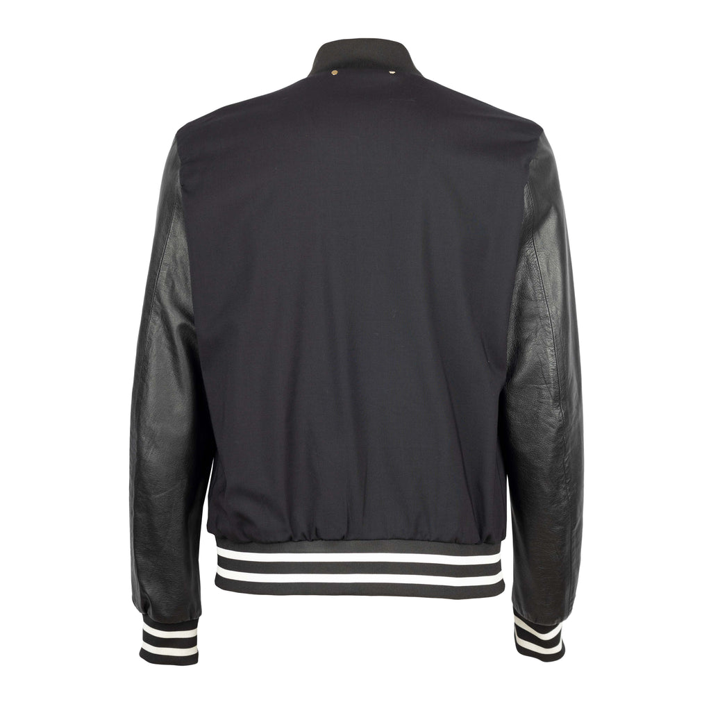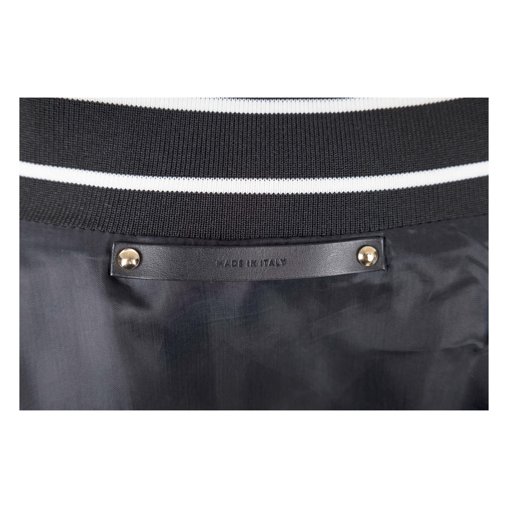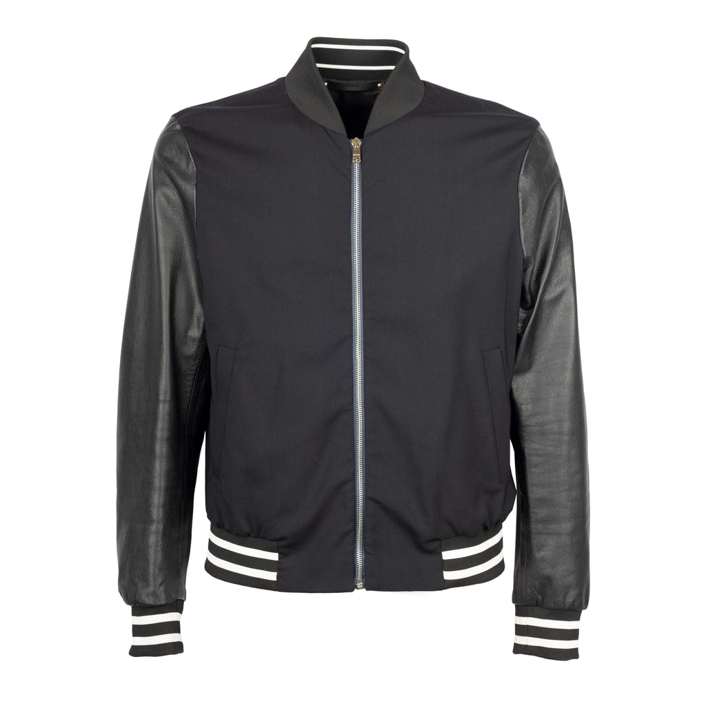 This classic Paul Smith bomber jacket is crafted from a cotton knit fabric for ultimate comfort. Featuring contrasting college style striped elasticated hem waistline and matching sleeve cuffs, it is finished with a leather sleeve and a front zip closure.
