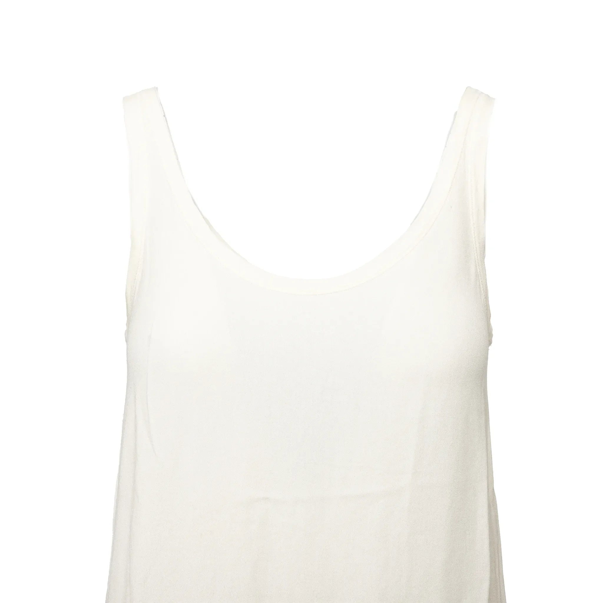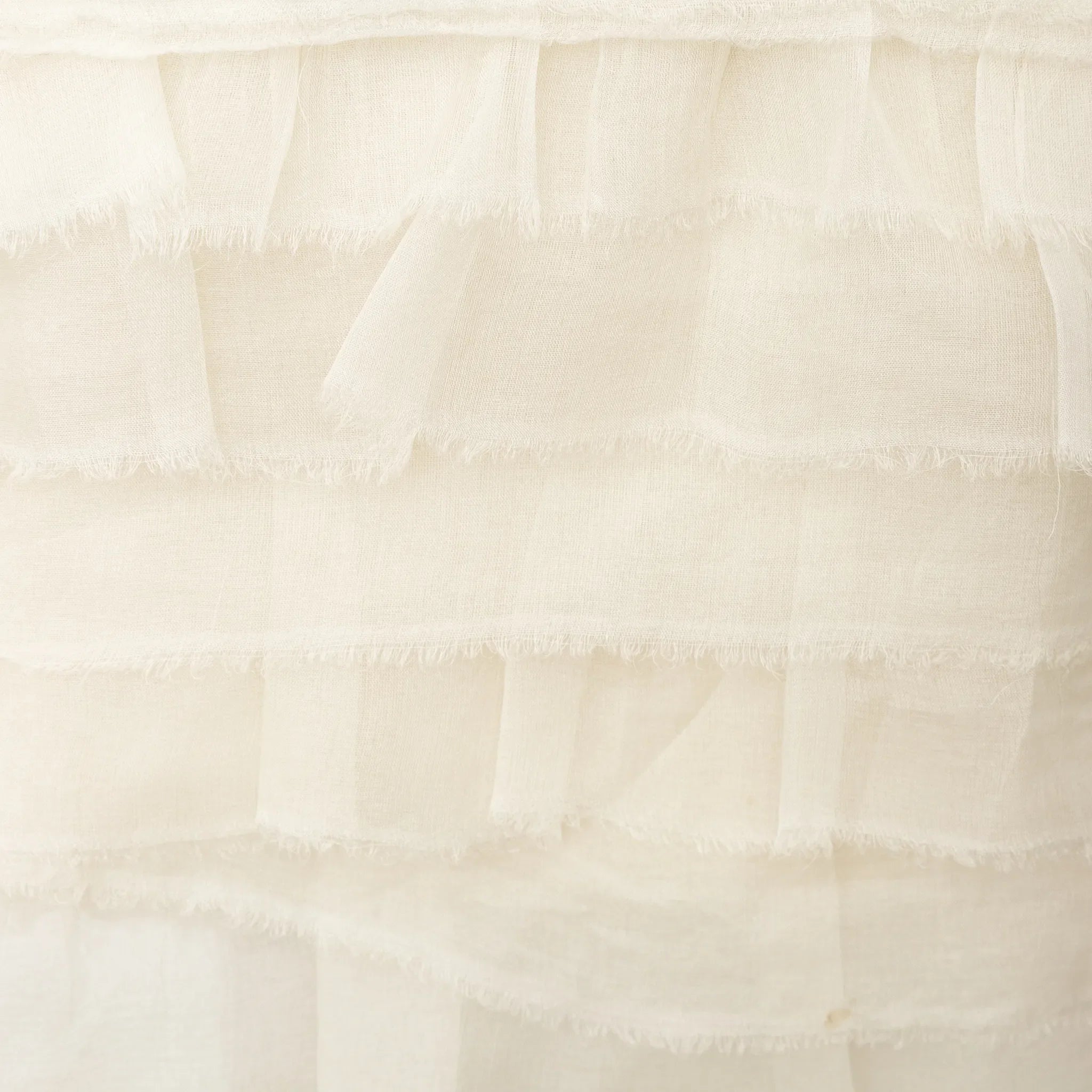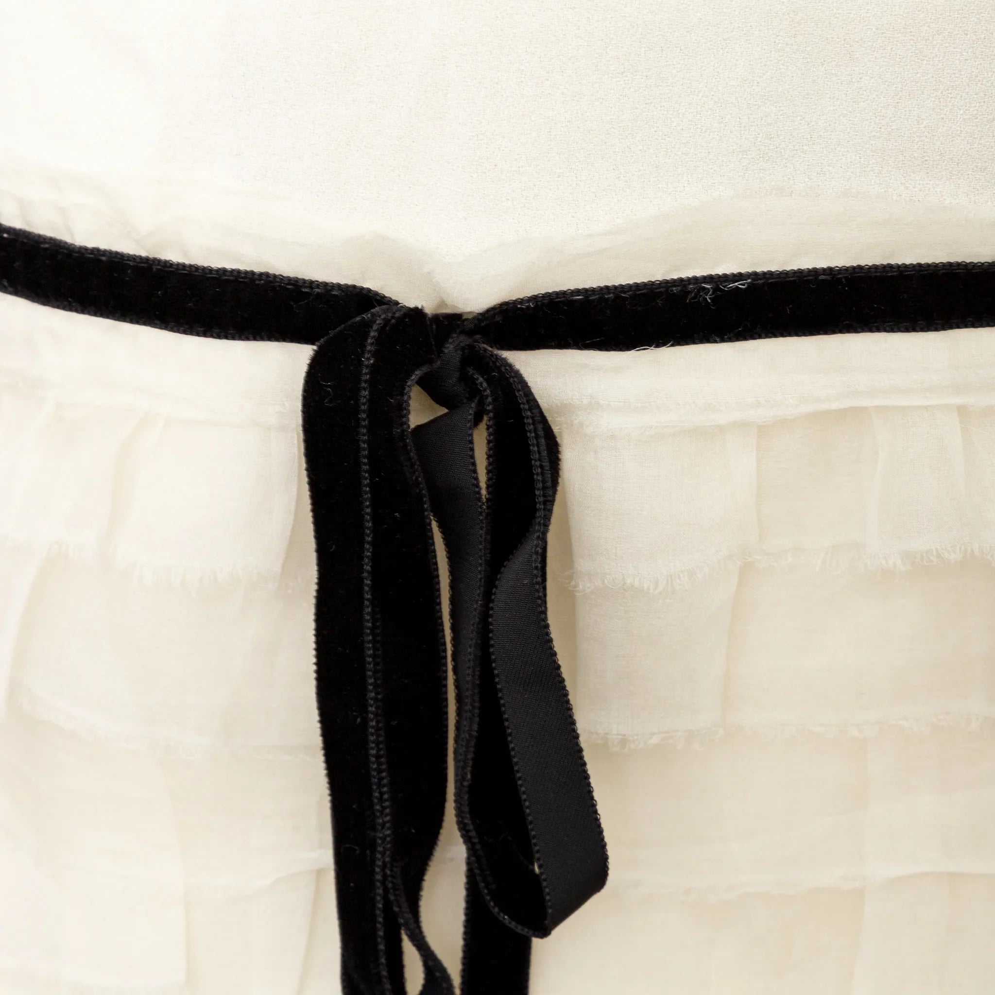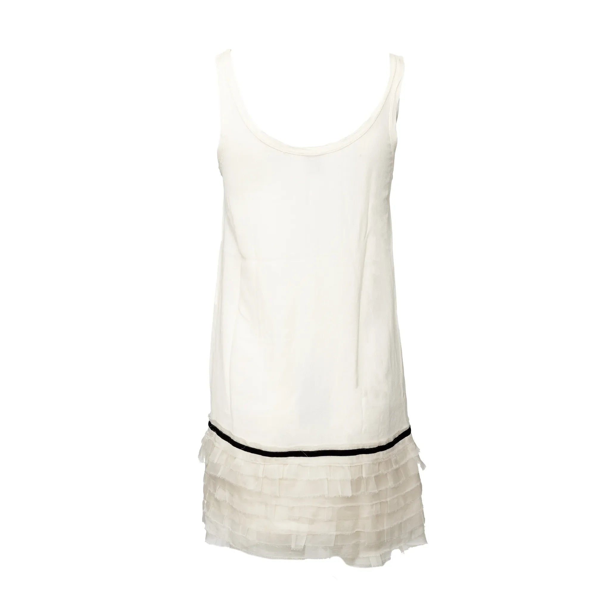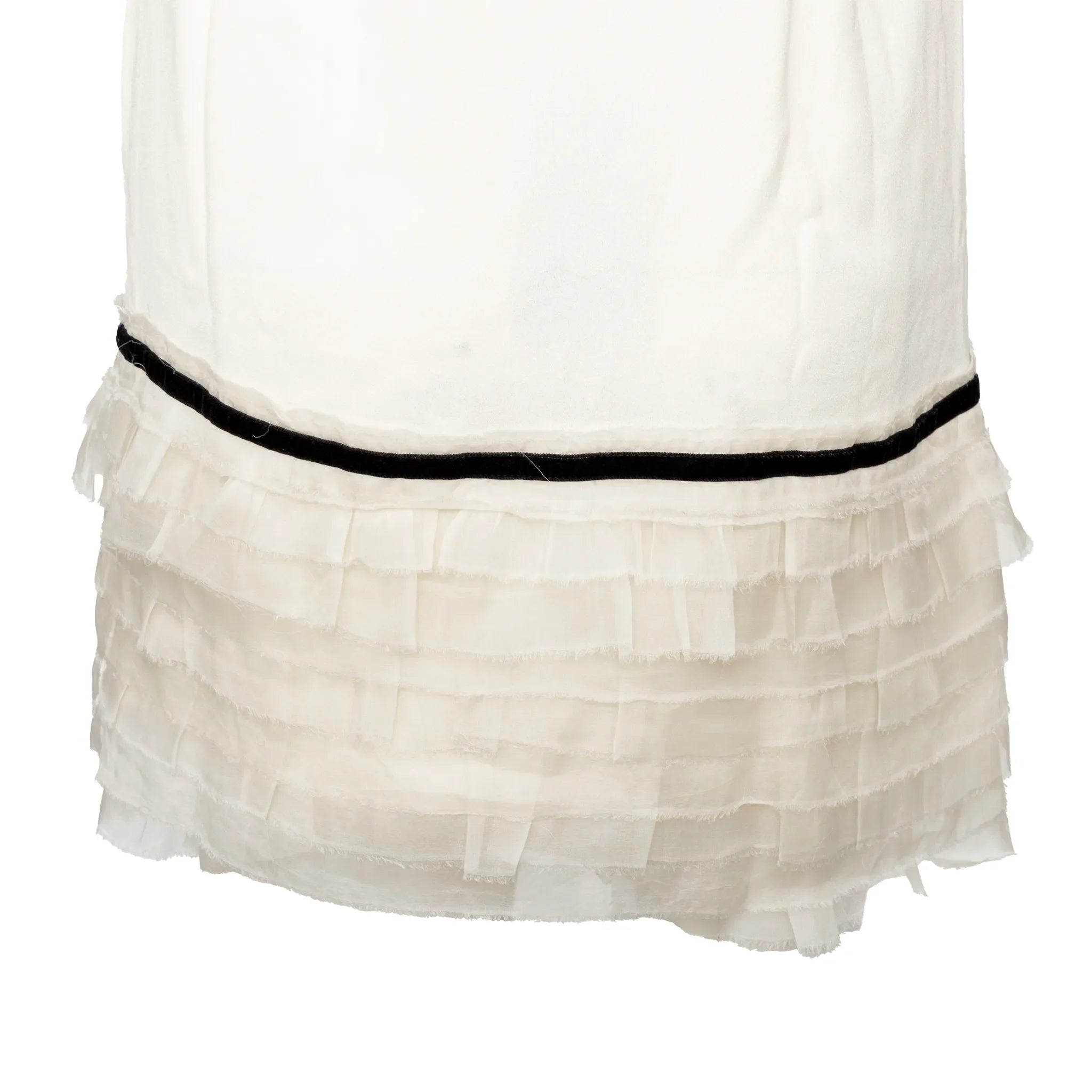 Mini dress in soft crepe white viscose with thin straps, ruffled pleats at the hem, and a black velvet lace trim for a romantic, refined finish.