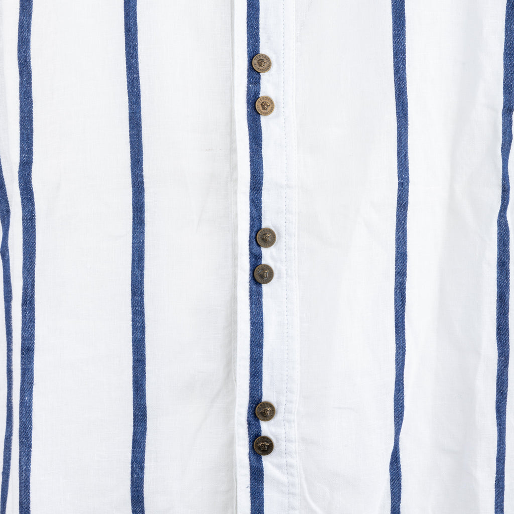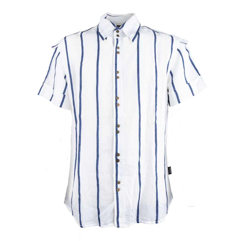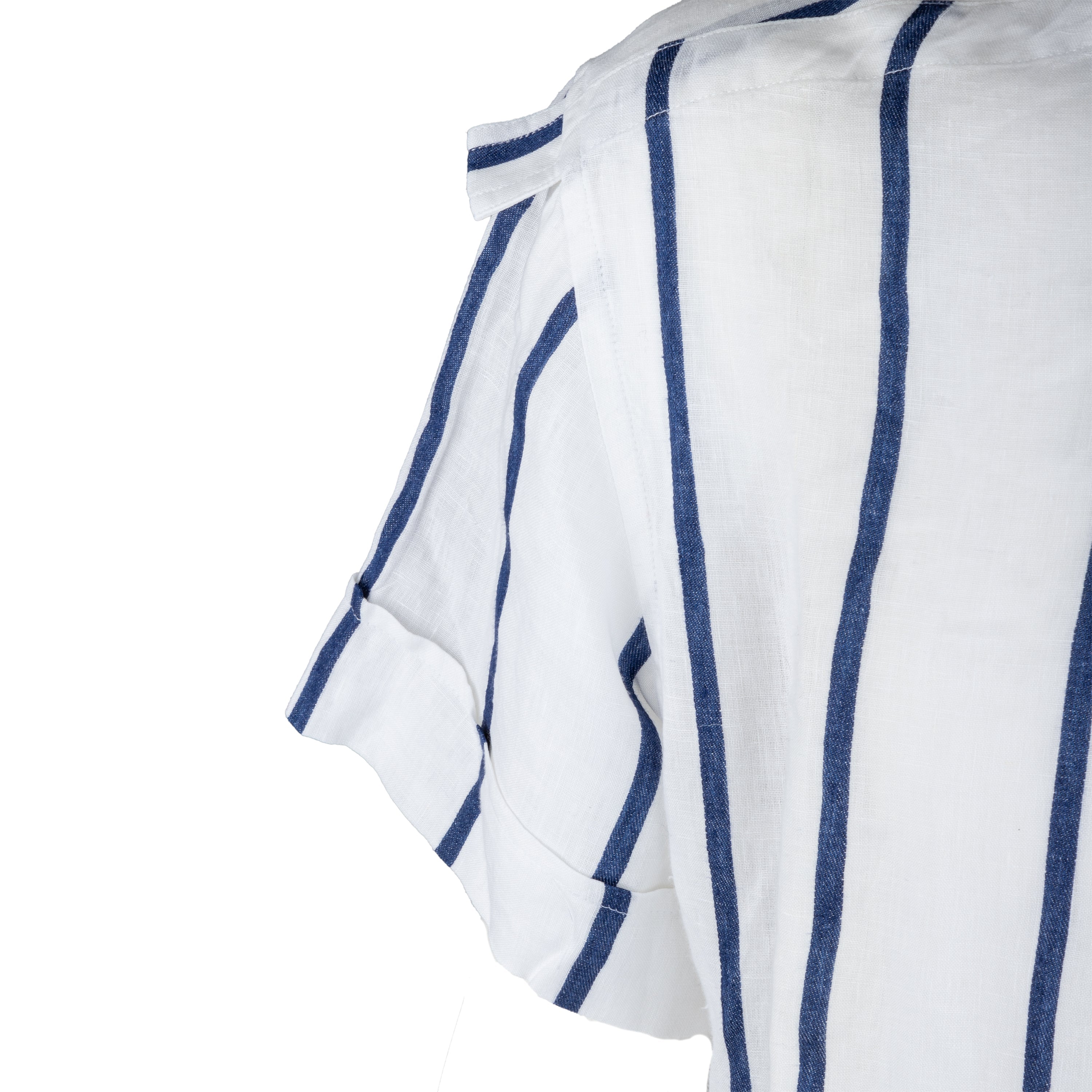 Elevate your Mediterranean vacation look with this blue-and-white striped shirt. Its fitted cut offers style while its linen material provides breathability for the hottest days.