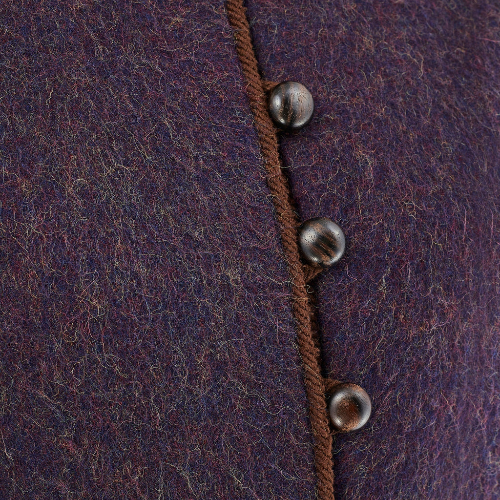 Tailored from a rich aubergine purple wool, it is woven with other hues - including gold, russet and cobalt - resulting in a textured, speckled felt effect. It features wide, voluminous bell-sleeves, each buttoning at the cuff with four brown buttons. The bodice is tailored and fitted to the curves of the body, finished with a graceful Mandarin high-neck and secured down the front with seven wooden buttons. The bottom half of the jacket is full, falling from under the bodice in soft pleats. The coat is trimmed at the seams, cuffs, collar and down the front with intricate twisted brown braid, which is also used as fabric loops to close the buttons. There are in-seam pockets in the side seams. This coat is lined at the top and inside the sleeves and pockets with purple satin. The label reads “Yves Saint Laurent Rive Gauche”, a reference to Paris’s younger and trendier left bank.