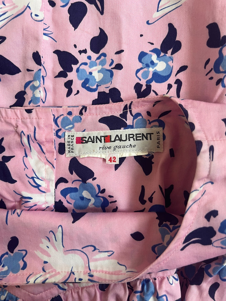 Inspired by artist Georges Braque's dove lithographs and often sketched by Yves himself, the dove of peace has long been a signature motif of the Saint Laurent fashion house. Flying among vibrant blue flowers across this vibrant pink dress, this dress is from the spring / summer 1987 ready to wear collection. Cut from cotton, this smock-style dress features balloon sleeves with elasticated, gathered cuffs, large faceted white plastic buttons and a wide boat-neckline. A bonus are the hidden side pouch pockets. The label reads “Saint Laurent Rive Gauche”, a reference to Paris’s younger and trendier left bank. This dress is in excellent vintage condition, very fresh looking and with no discernible issues. Marked a French 42, this dress can be worn by a variety of sizes up to a UK 14 or US 10. There was room to spare in the dress for our model who is a UK 6-8 and is 5ft 4in / 163 cm.