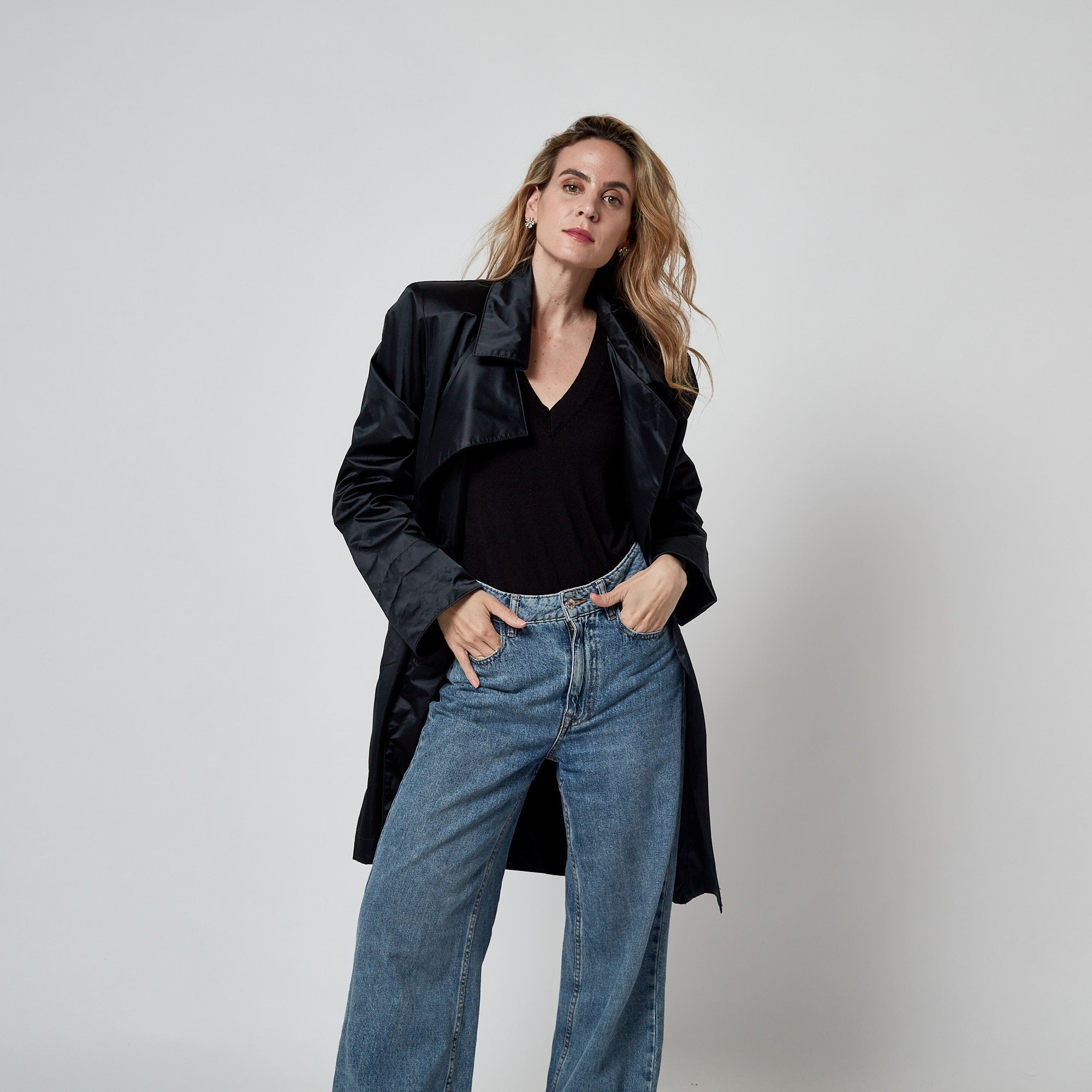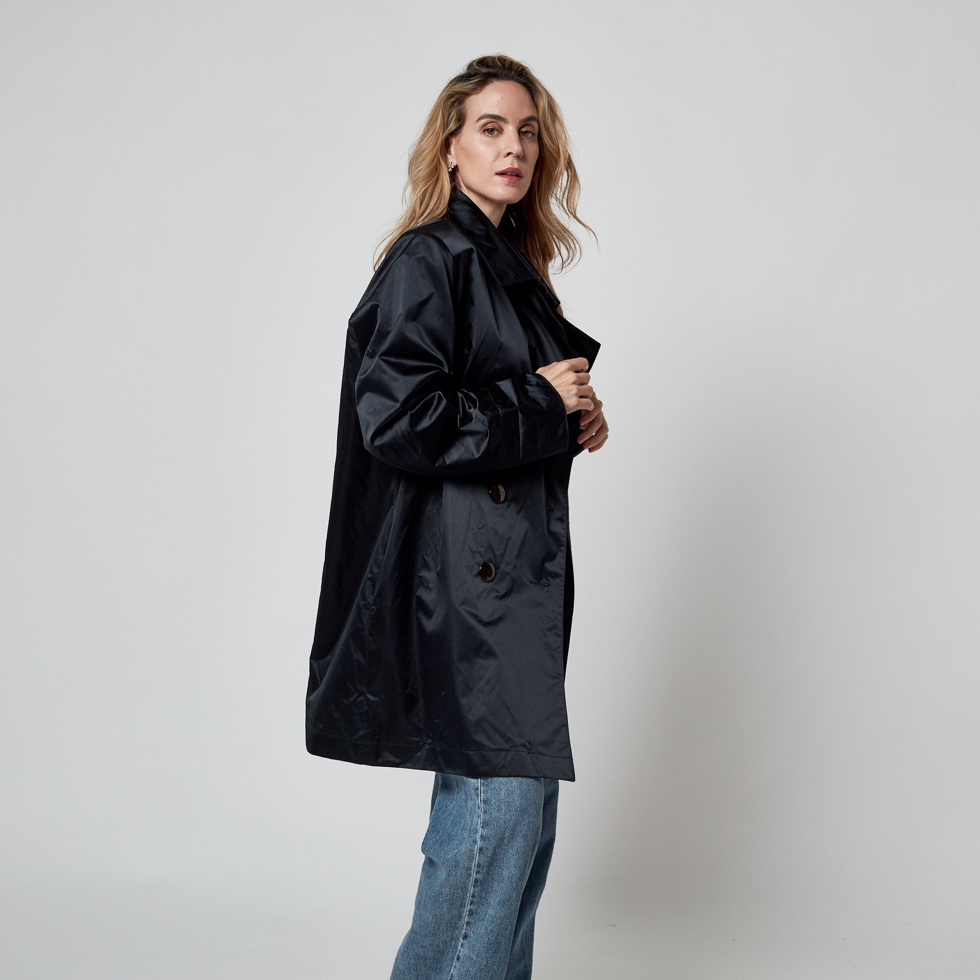 Tailored from black satin made from polyurethane and cotton with a glossy sheen, it has a double-breasted silhouette and is tailored to a baggy, relaxed fit. The buttons are large, bronze-hued and cut from a sheer plastic. The cuffs are designed to be turned-up. There is a chunky point collar and in-seam pockets at the hips. The back has a vent and it is lined throughout in an inky black crepe.