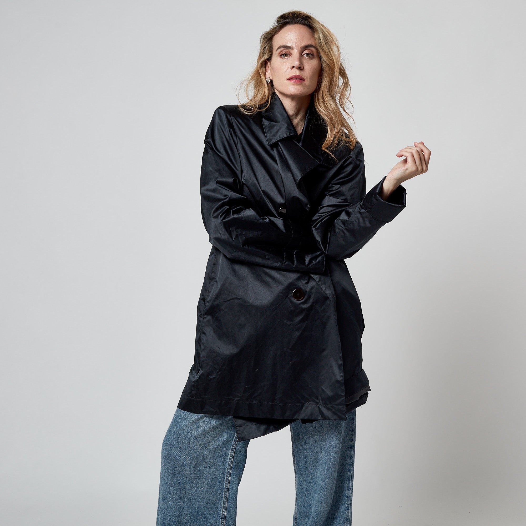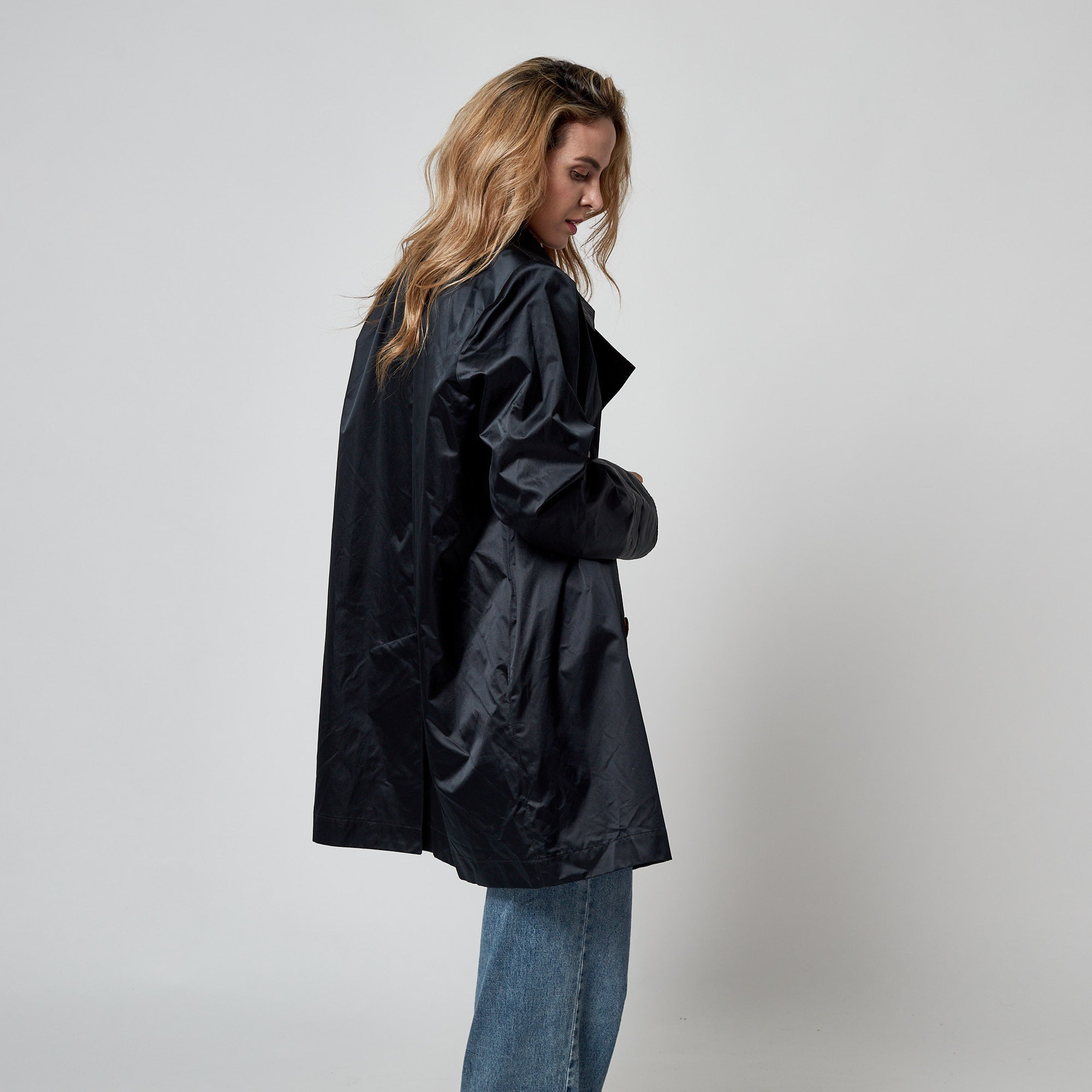 1992 Yves Saint Laurent Double Breasted Black Satin Mac Coat