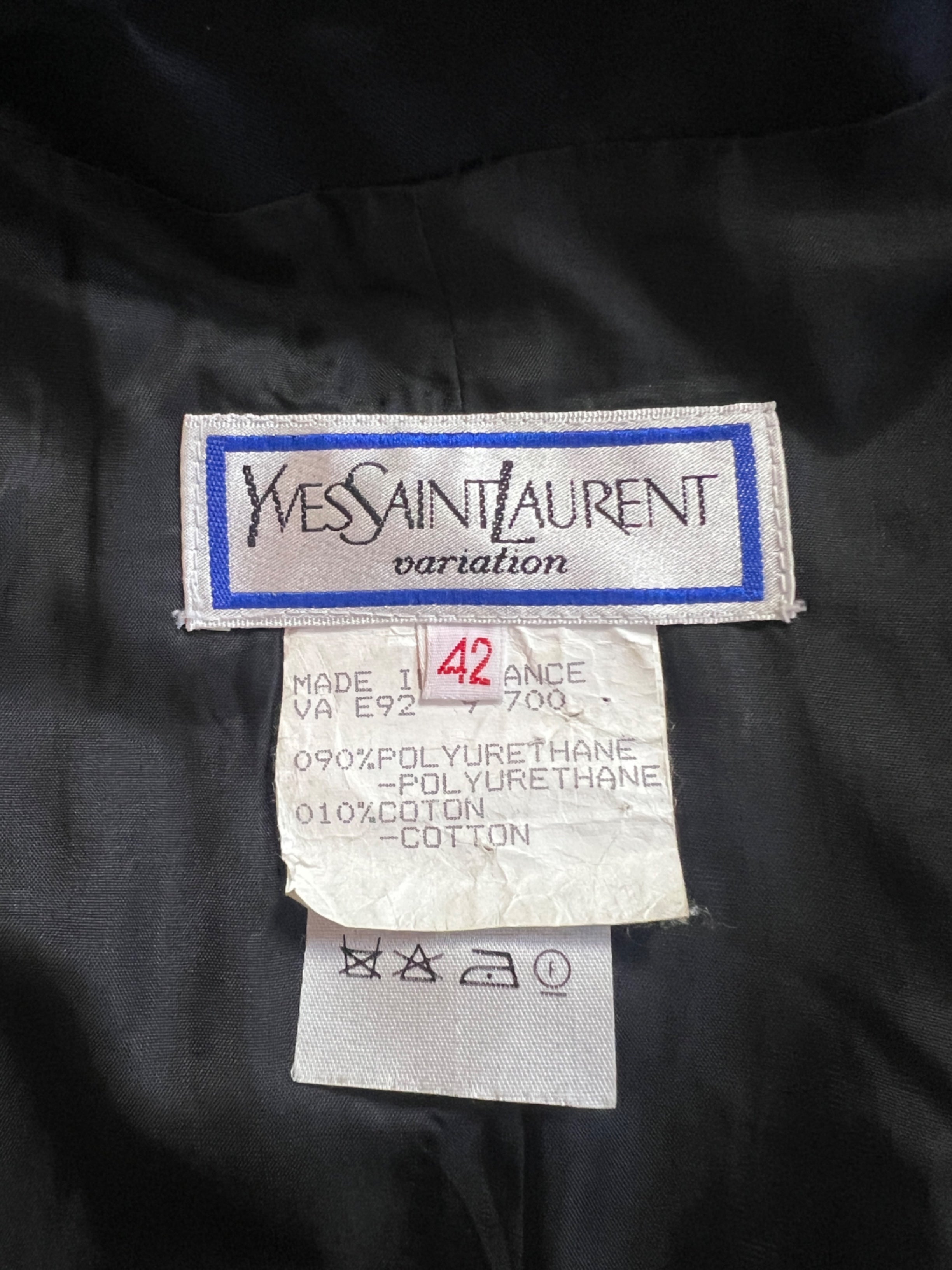 Highly wearable and in excellent vintage condition with no issues. Made in France, it is labelled a size 42, UK 14 or US 10 but will work for sizes smaller too. We have referenced similar YSL designs from the same time period worn by the supermodel duo Naomi Campbell and Christy Turlington to show you just how good these jackets look belted. Although this design does not have a belt, you could add your own to replicate the look. The outer fabric is 90% Polyurethane, 10% Cotton and the lining is 55% Acetate, 45% Cupro. The fabric has no stretch.