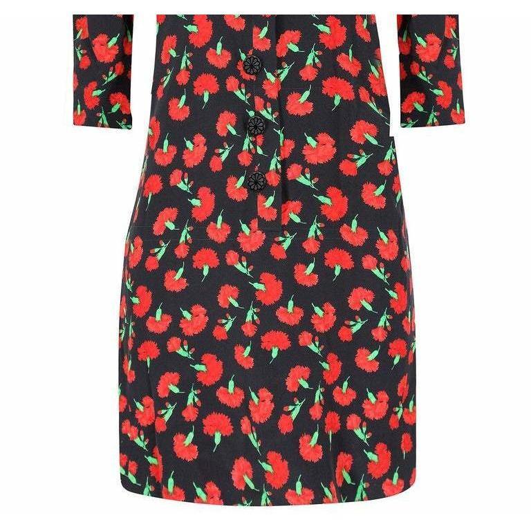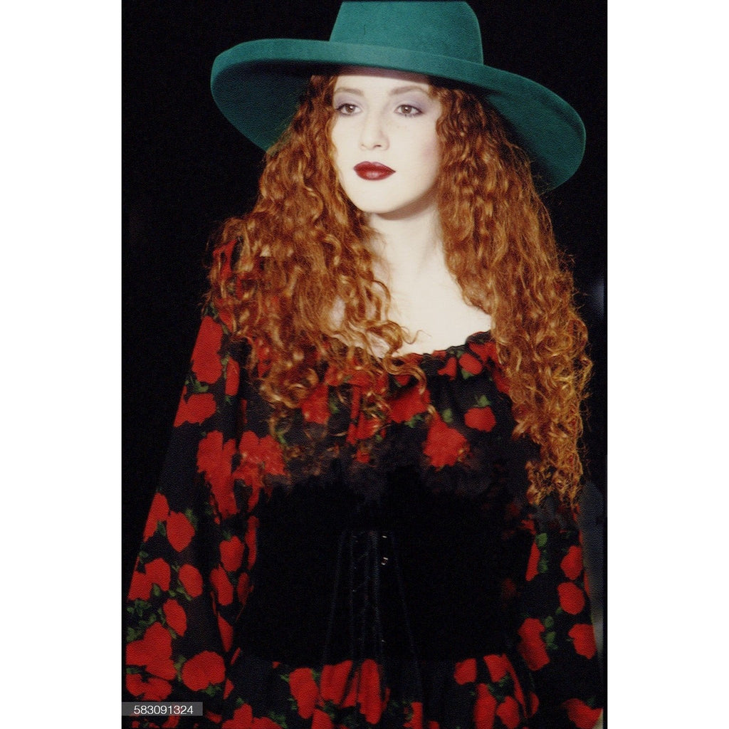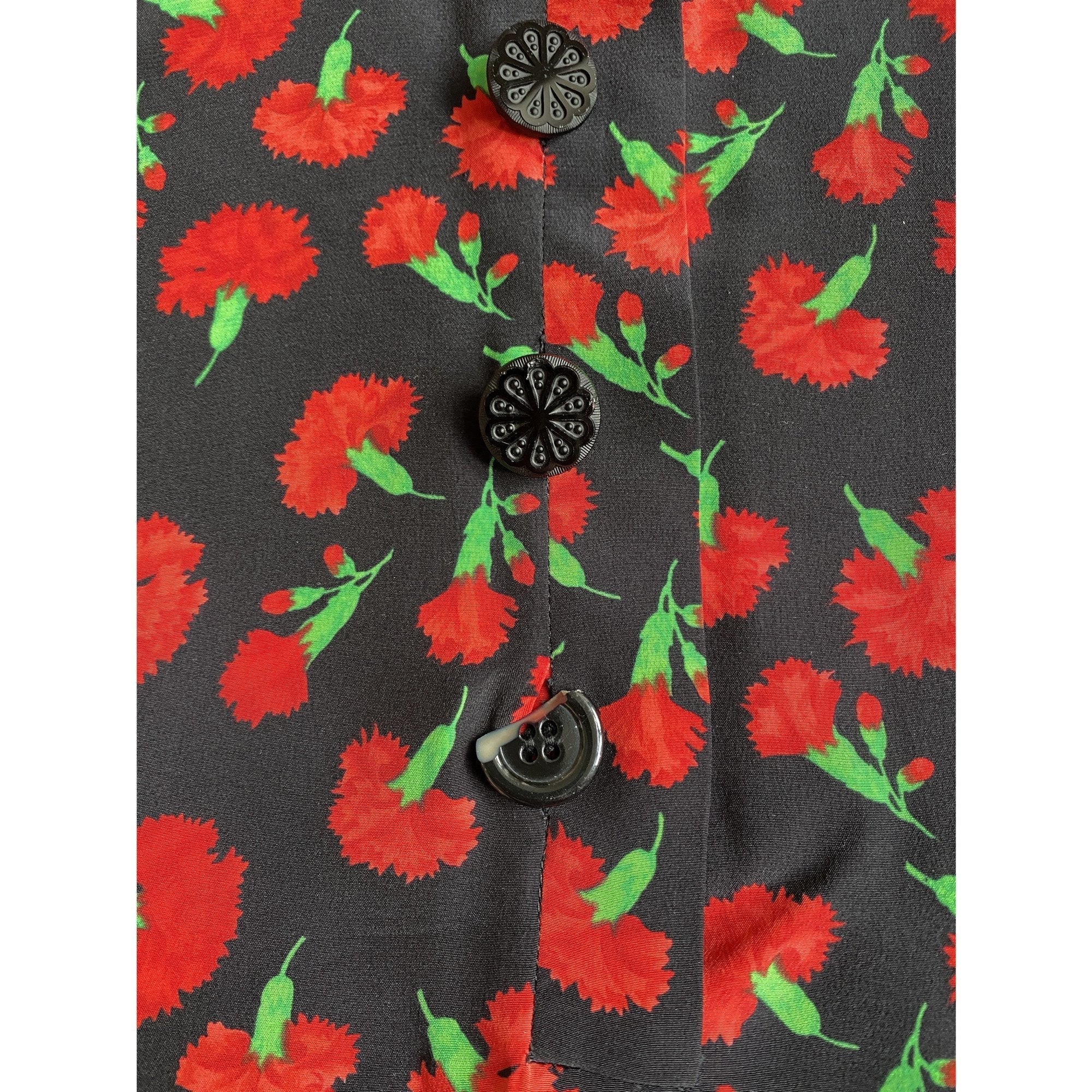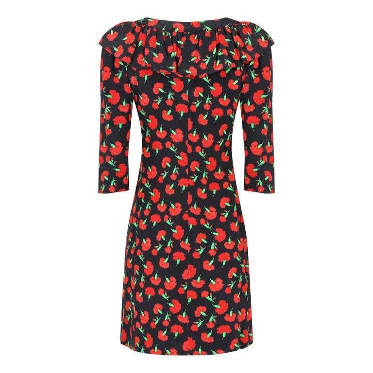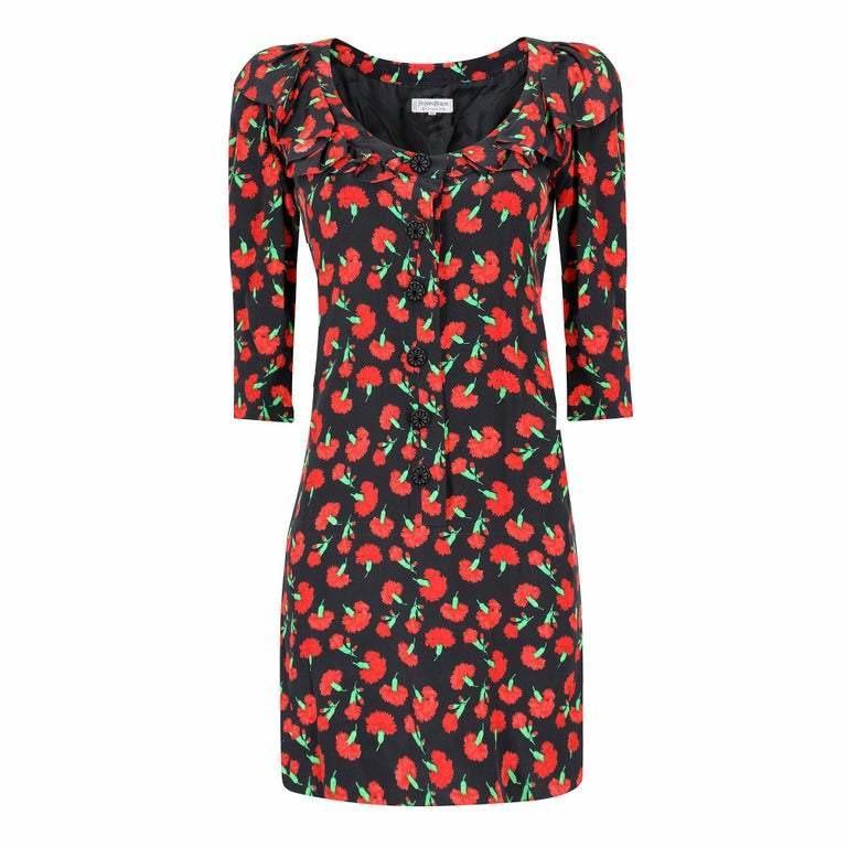A notable dress from a design icon, Yves Saint Laurent, when he was still at the helm of his eponymous fashion house. This dress has its origins in the autumn/winter 94 - 95 ready to wear collection where this black and red carnation print was the standout and featured in many of the designs. The dress, entirely made in France, has the ready to wear label "Rive Gauche" and is a deceptively simple design. I've studied the runway clips carefully and it appears that this is the commercial version of the dress, blending both of the styles featured on the runway. It has the wide scoop neck and fitted look of the first but with the addition of a ruffle trimmed collar. The ruffle is wider at the back and tapers as it comes around to the front. It's narrowest point is where the top of the first button is. The sleeves are elbow length with discreet tapering in keeping with the fitted look. The dress fastens to the front with stylised black glass facetted buttons. The skirt is slightly tapered towards the knee. There is no fabric composition label but we believe this is silk or an extremely good manmade version. The dress is not lined. It's such a great example of day wear that could equally be styled up for the evening and that print!! What more can we say :-)